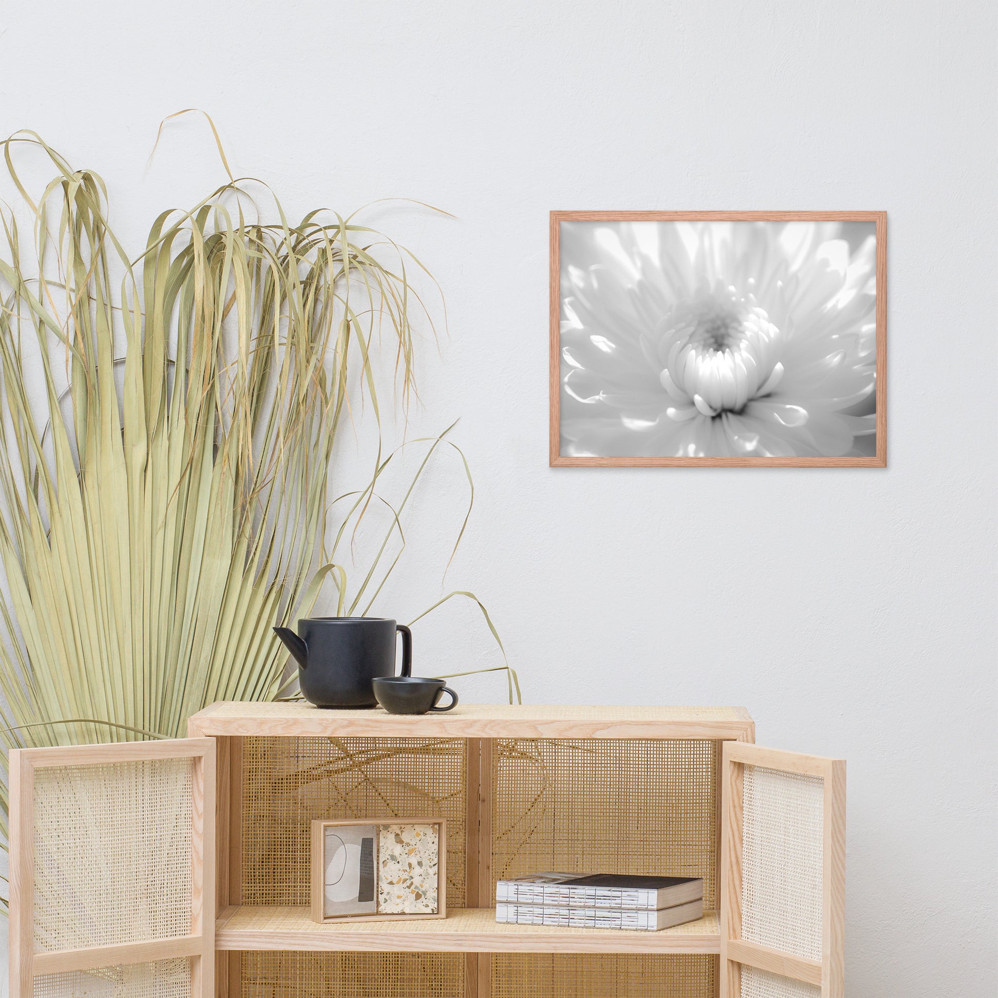 Bathed in sunlight streaming through a window, the flower's petals seem to glow with an inner luminescence, radiating warmth and tranquility. The monochromatic palette adds a touch of sophistication and timelessness, making this piece a versatile addition to any space.