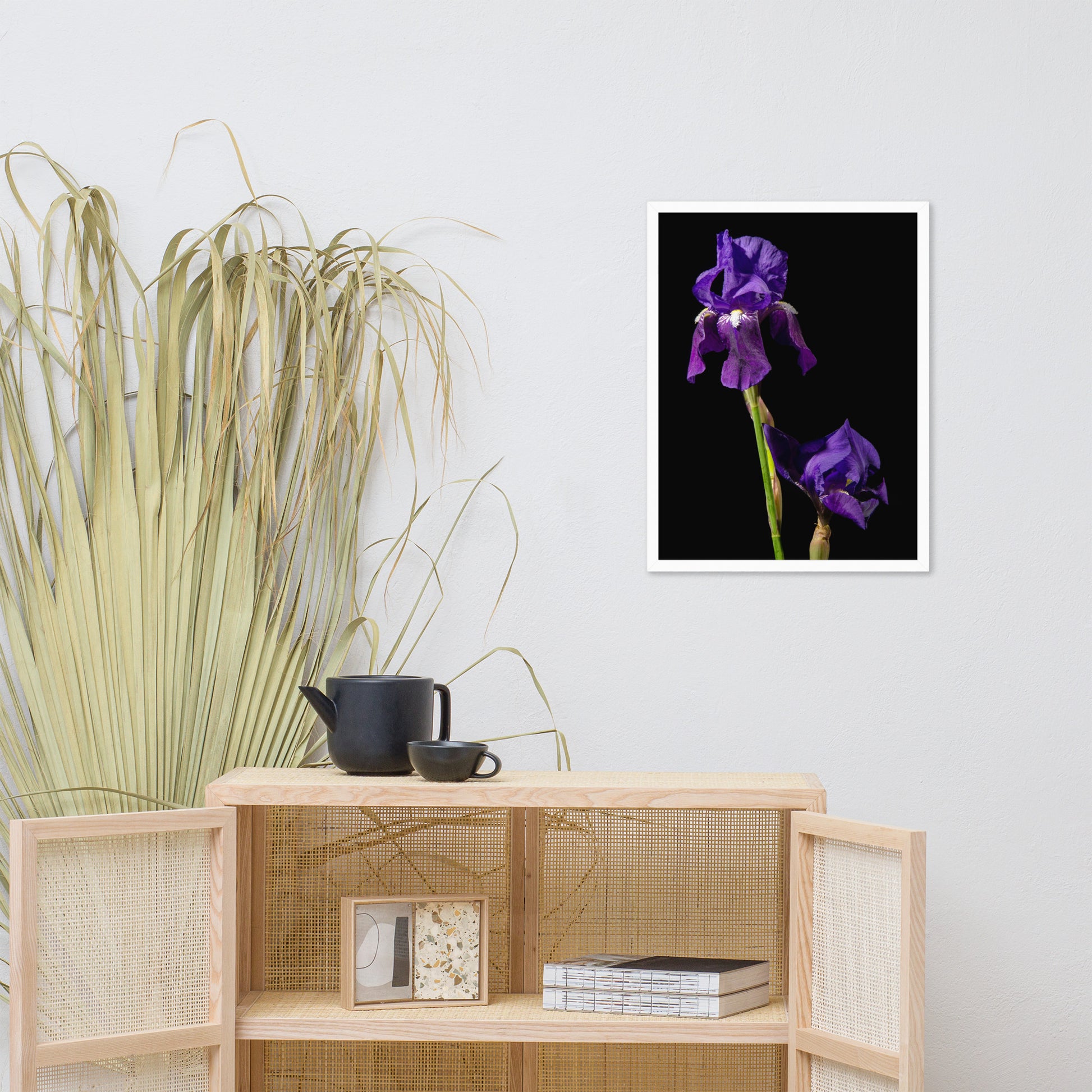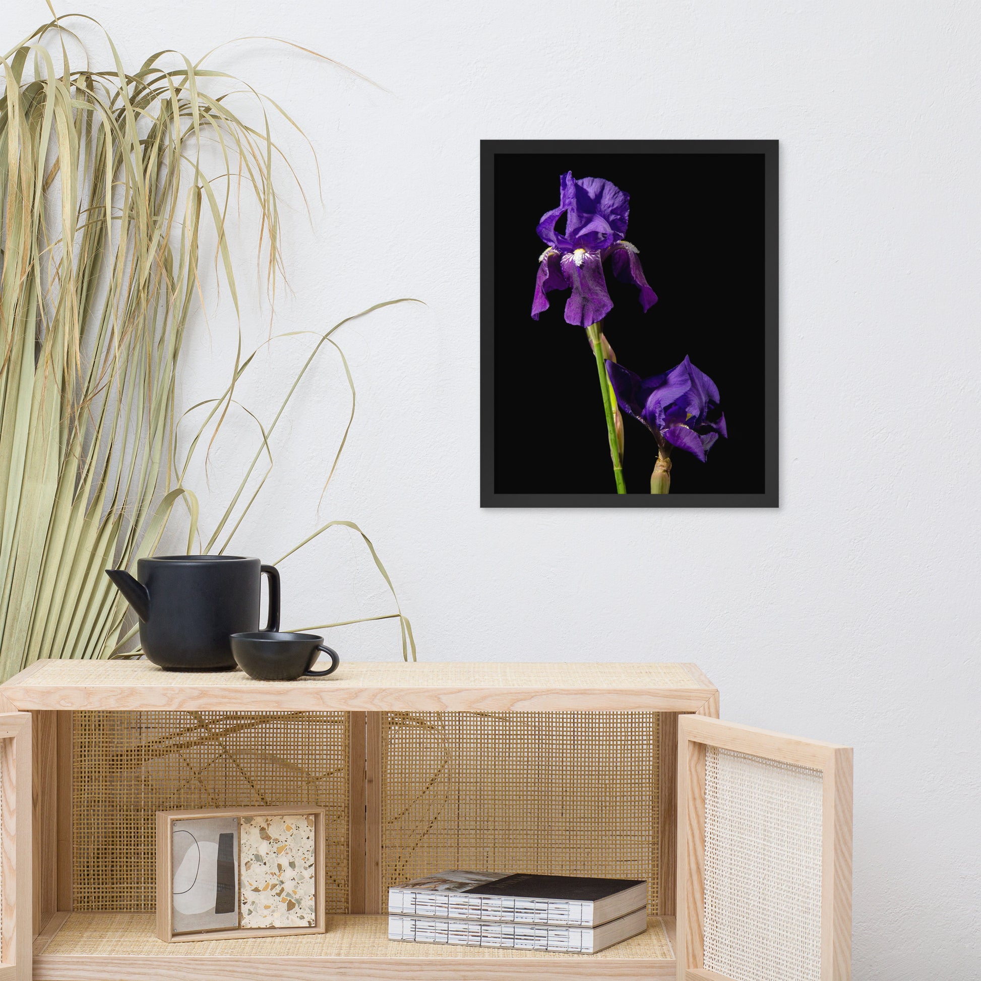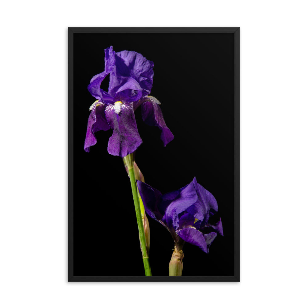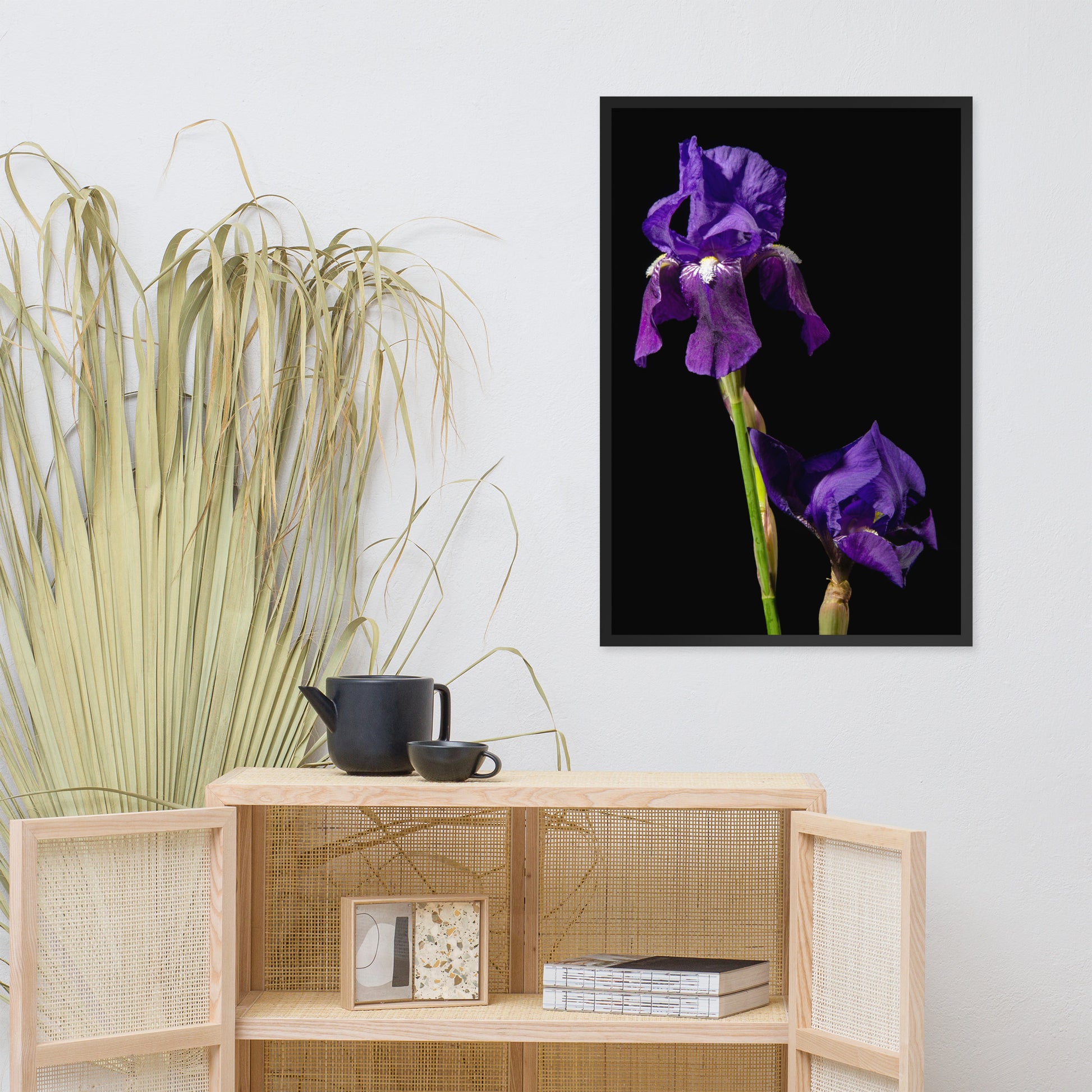 About these framed floral pictures: Embrace the dramatic elegance of "Iris on Black," a captivating floral print that showcases the exquisite beauty of two iris blossoms in striking detail. Set against a velvety black backdrop, the vibrant purple petals seem to glow with an ethereal luminescence, creating a mesmerizing focal point for any space.