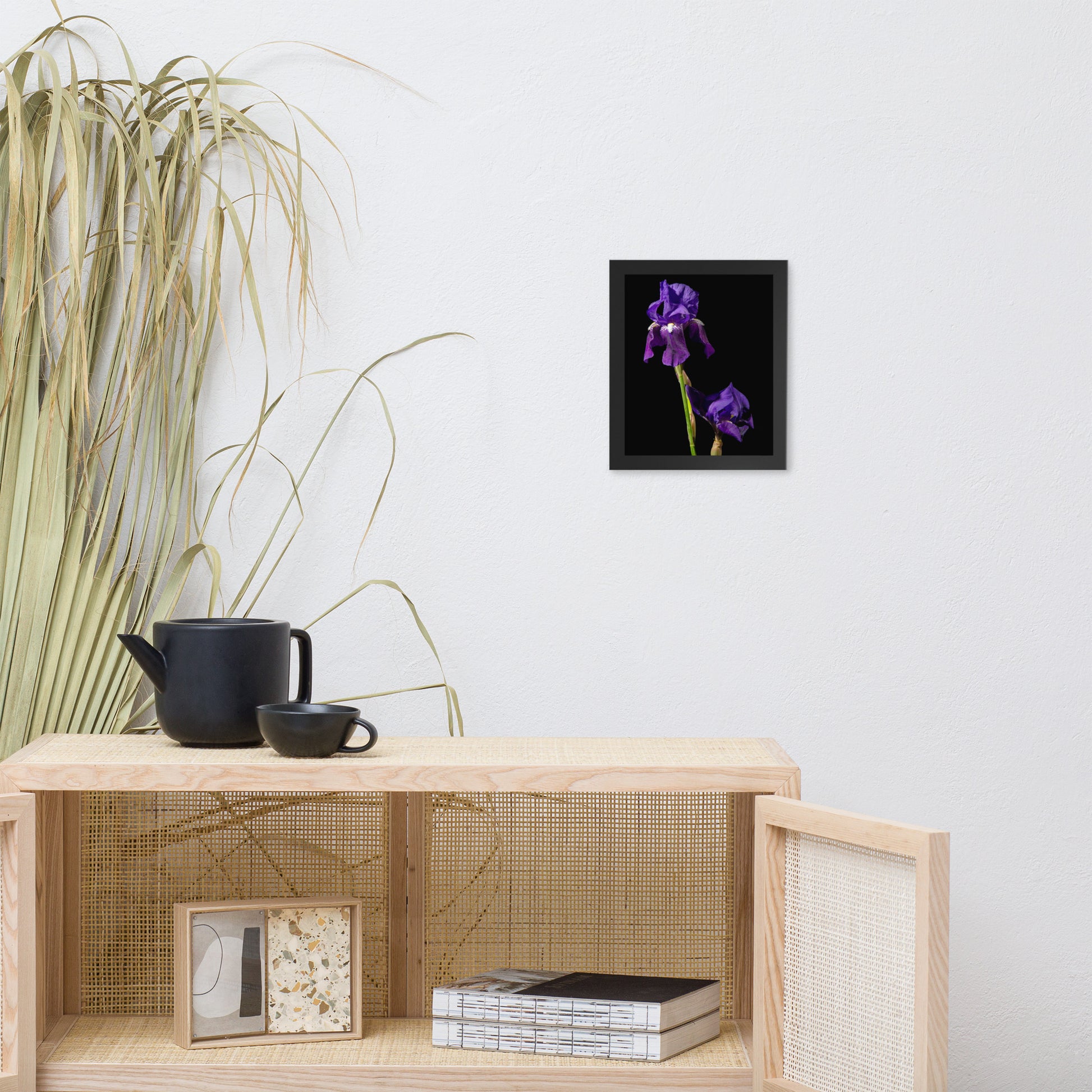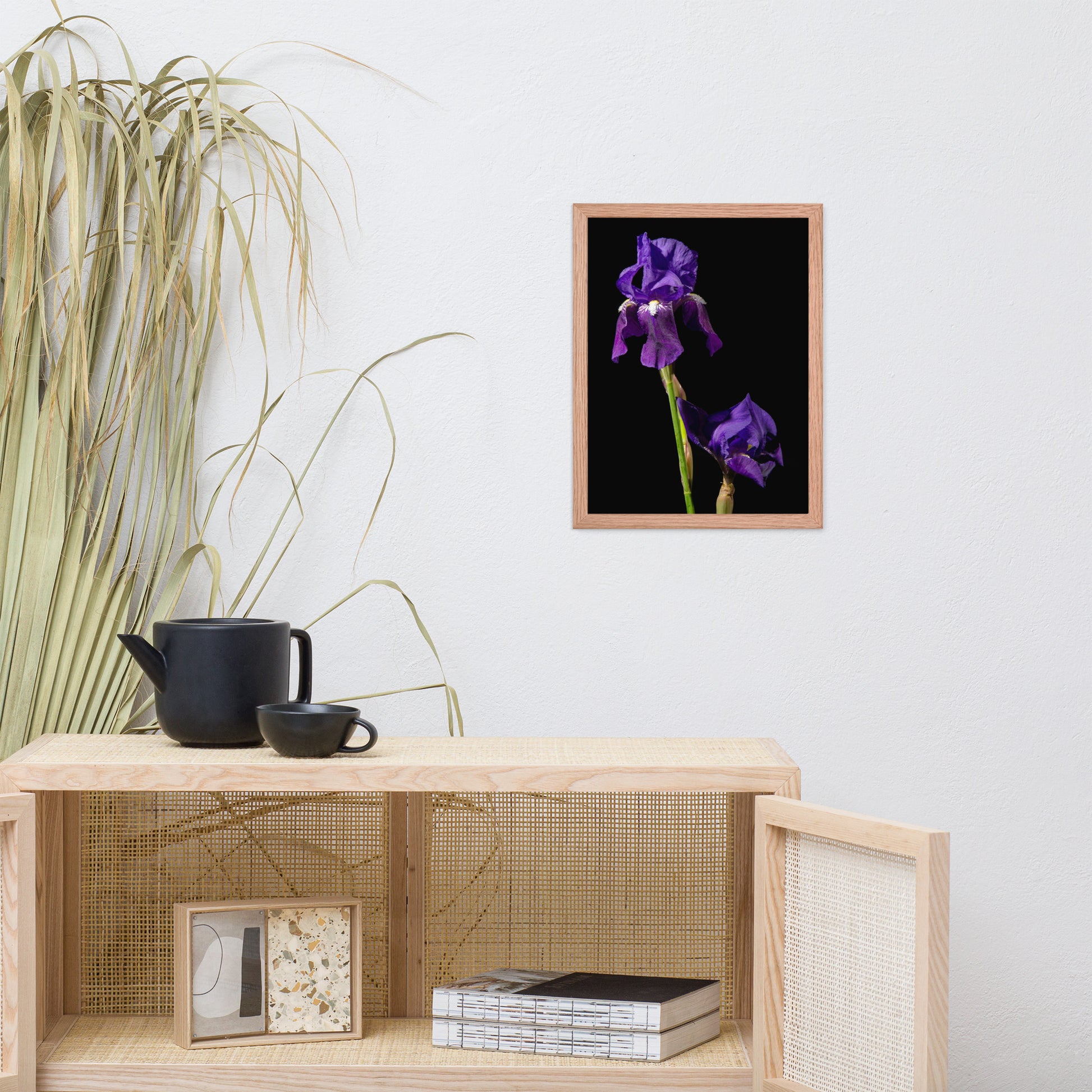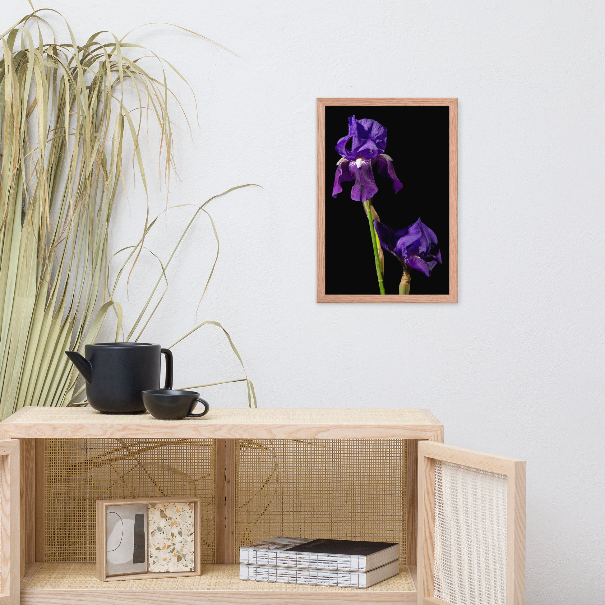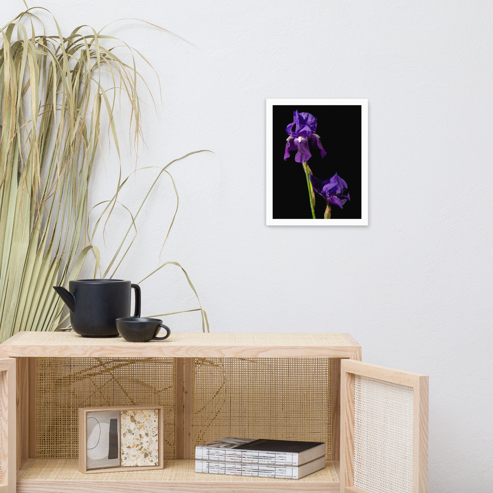 About these framed floral pictures: Embrace the dramatic elegance of "Iris on Black," a captivating floral print that showcases the exquisite beauty of two iris blossoms in striking detail. Set against a velvety black backdrop, the vibrant purple petals seem to glow with an ethereal luminescence, creating a mesmerizing focal point for any space.