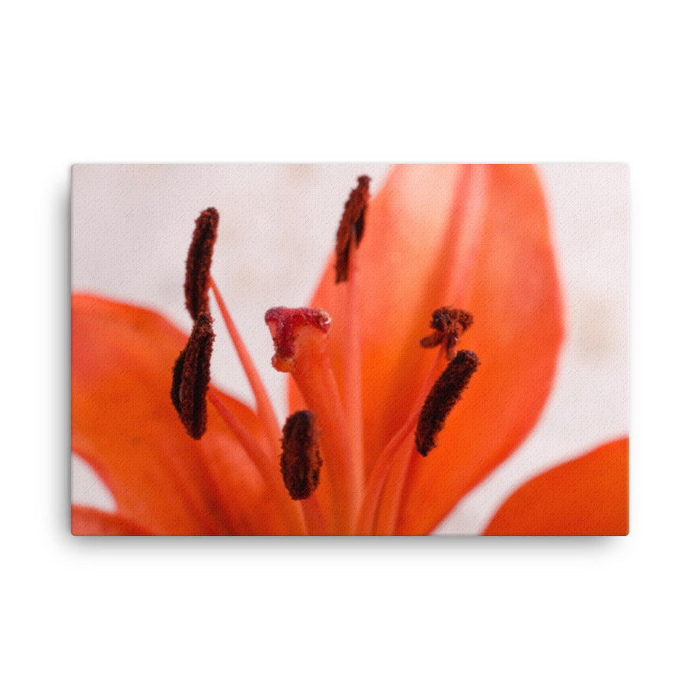 About this floral wall canvas art print: Lily Stigma invites you to experience the intimate beauty of nature in a whole new light. This macro photograph reveals the intricate details of a bright orange lily's stigma, showcasing its delicate textures and vibrant colors. Set against a soft, neutral background of rice paper, the stigma takes center stage, highlighting its role in the flower's life cycle.