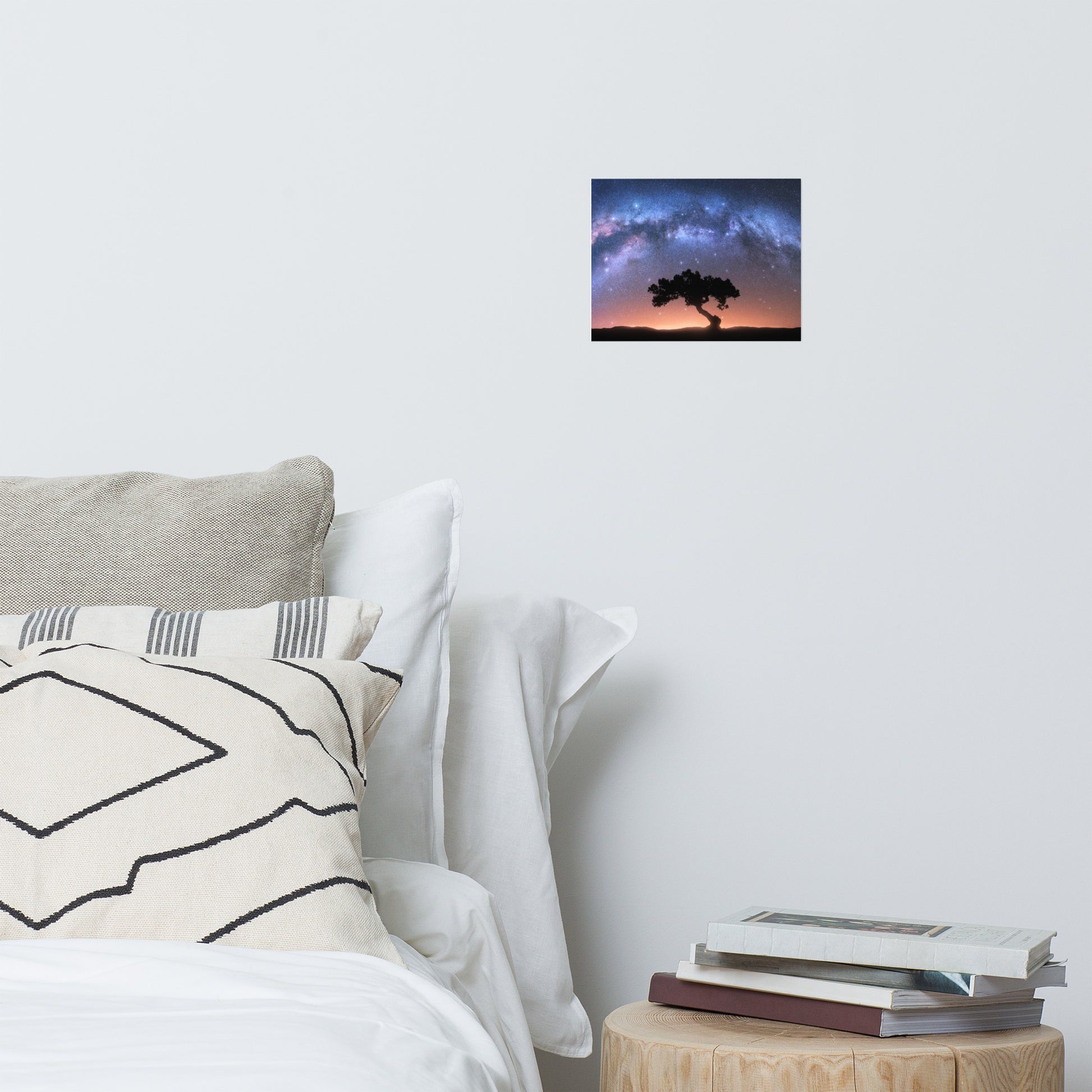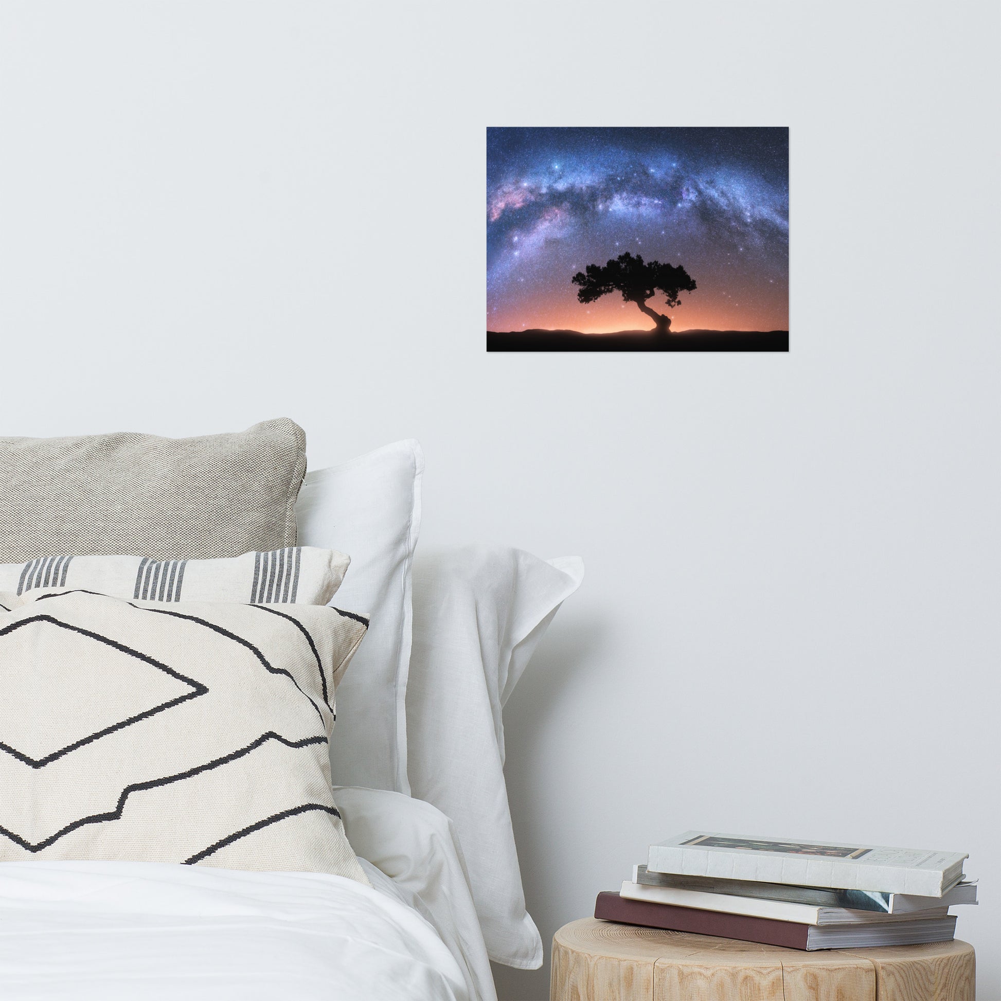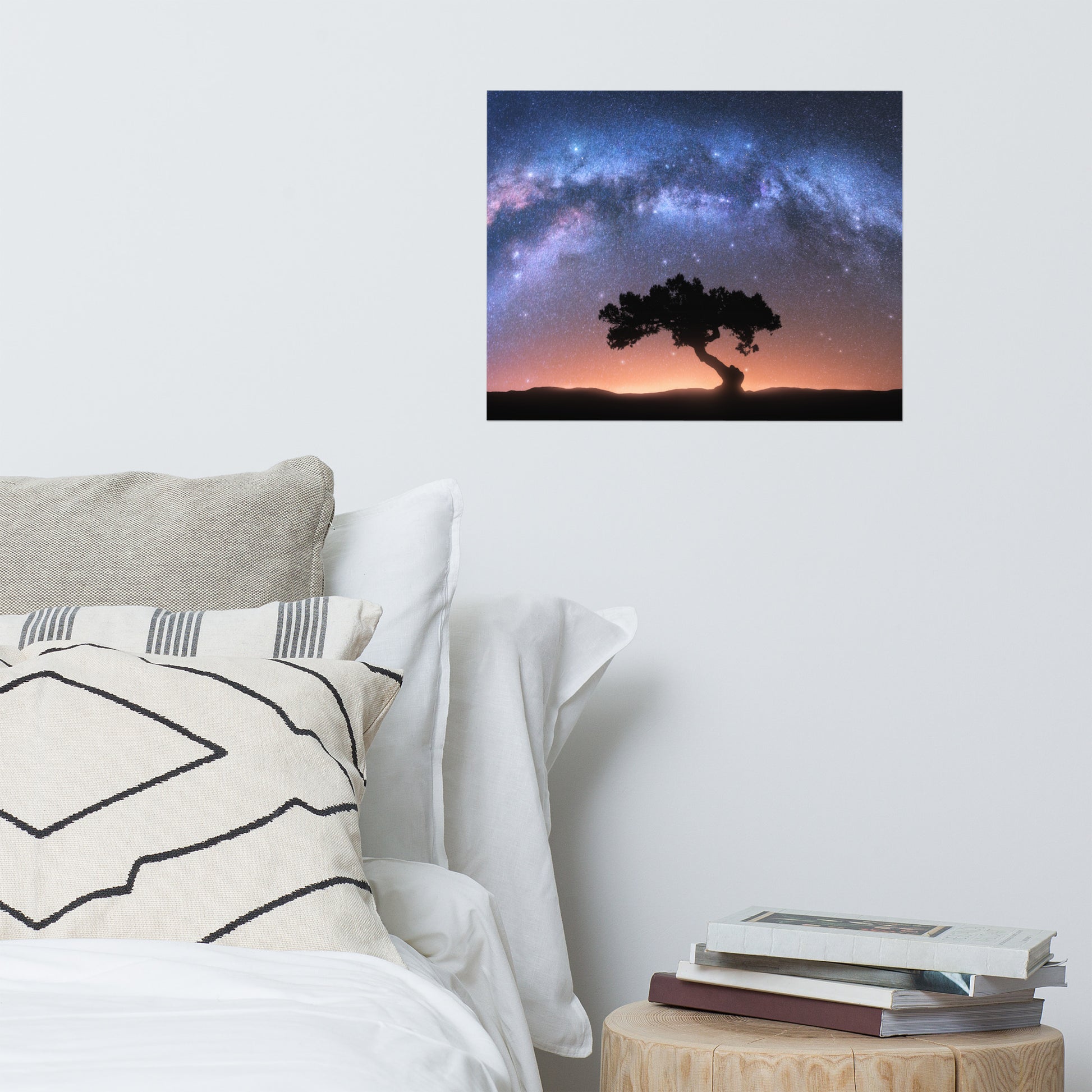About this rustic wall decor: Immerse yourself in the captivating beauty of the night sky with this breathtaking print. A solitary tree stands silhouetted against the luminous arch of the Milky Way, stars twinkling in the vast expanse above. Hints of the approaching sunrise paint the horizon with subtle hues, creating a scene that evokes both awe and tranquility.