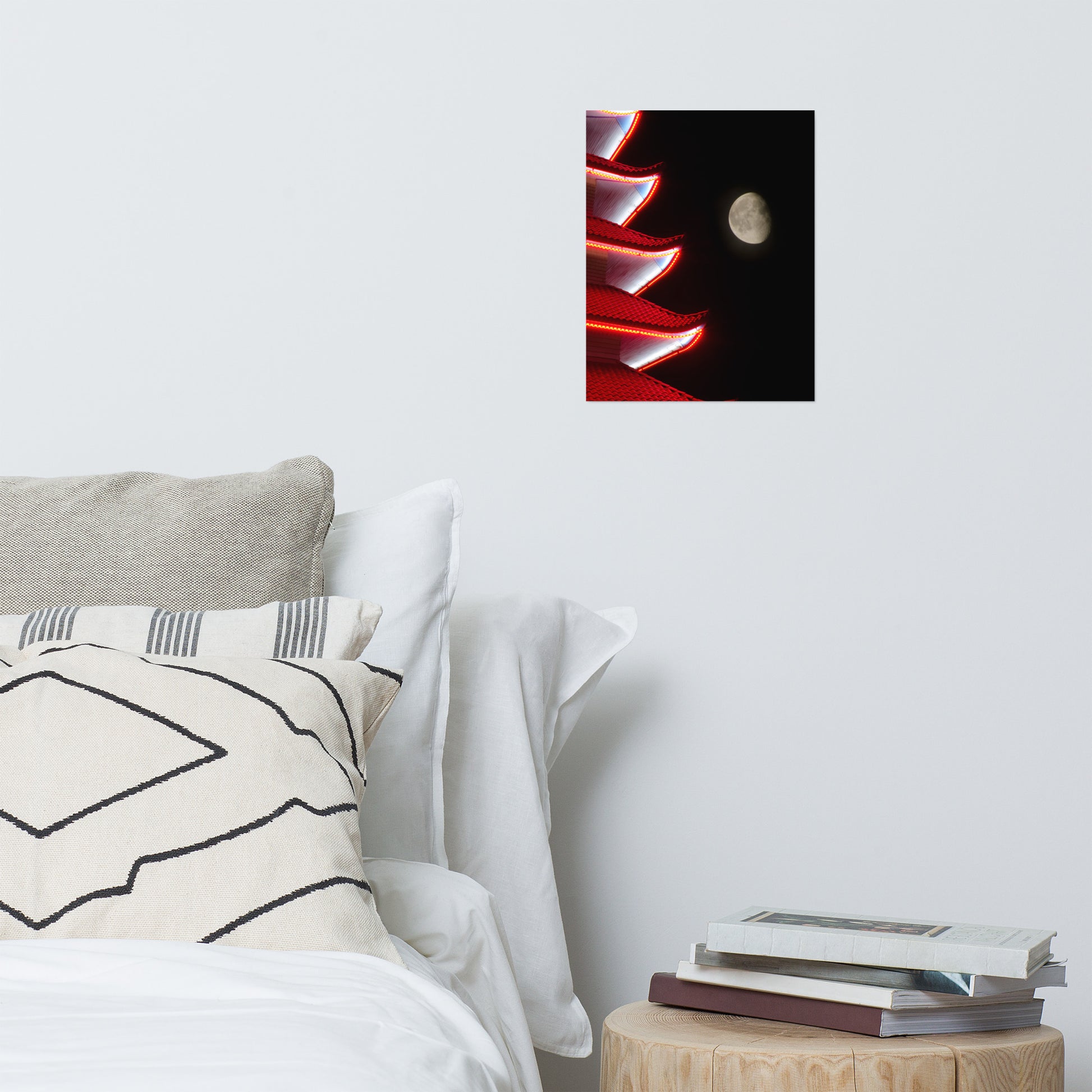 About minimal architectural photograph: Adorn your walls with the ethereal beauty of the Hilltop Pagoda in Reading, Pennsylvania. This unframed art print captures a mesmerizing nocturnal scene, where the pagoda's vibrant red roof, accentuated by glowing neon lights, stands in stark contrast against the vast, inky night sky. The Waning Gibbous moon, a celestial pearl, illuminates the scene, casting a soft, ethereal glow upon the pagoda's majestic silhouette. The fusion of architectural grandeur and celestial wonder creates a visually stunning piece that will transport viewers to a realm of tranquility and wonder.
