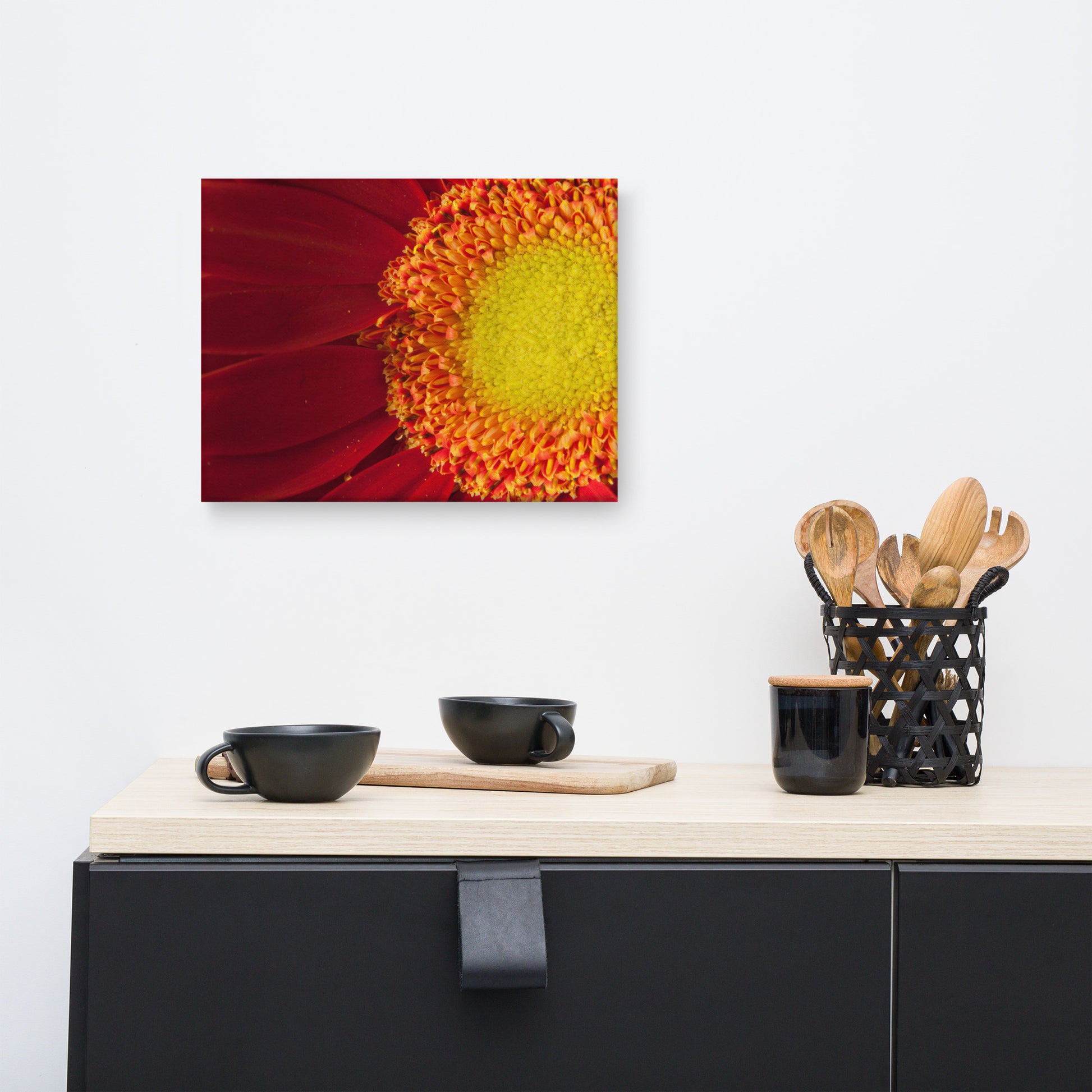 About this red flower canvas: "Nature's Beauty" showcases the vibrant allure of a bold red and yellow Gerbera Daisy in full bloom, captured in a stunning macros (close-up) nature photograph. This captivating artwork brings the essence of nature's splendor into your living spaces, adding a burst of color and life to any room.