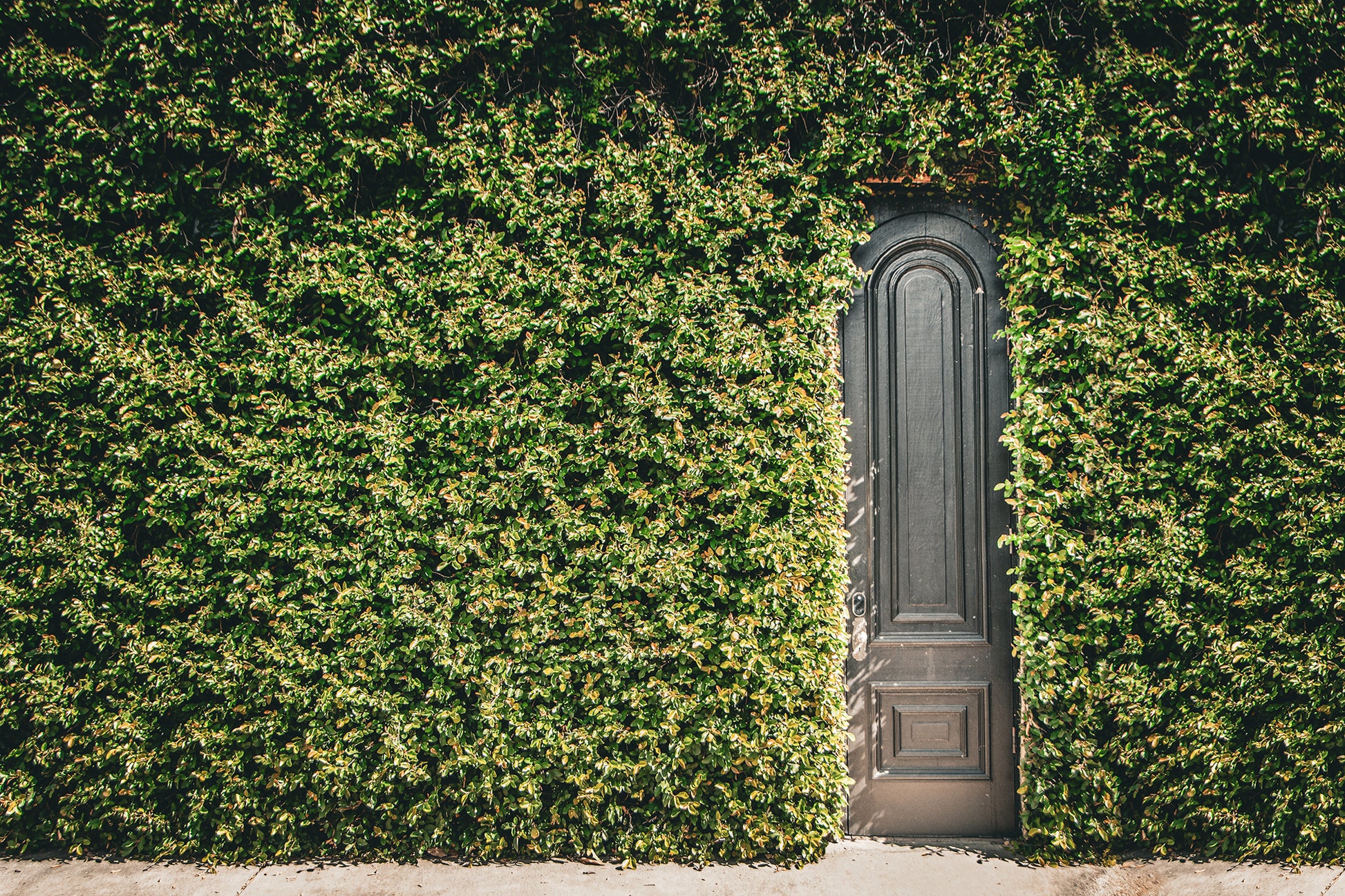 The image is a study in contrasts, with the dark, aged wood of the door standing out against the vibrant green ivy that engulfs the wall. The door's intricate details, including its arched top and antique hardware, hint at stories of a bygone era, while the ivy's verdant growth speaks to the enduring power of nature.