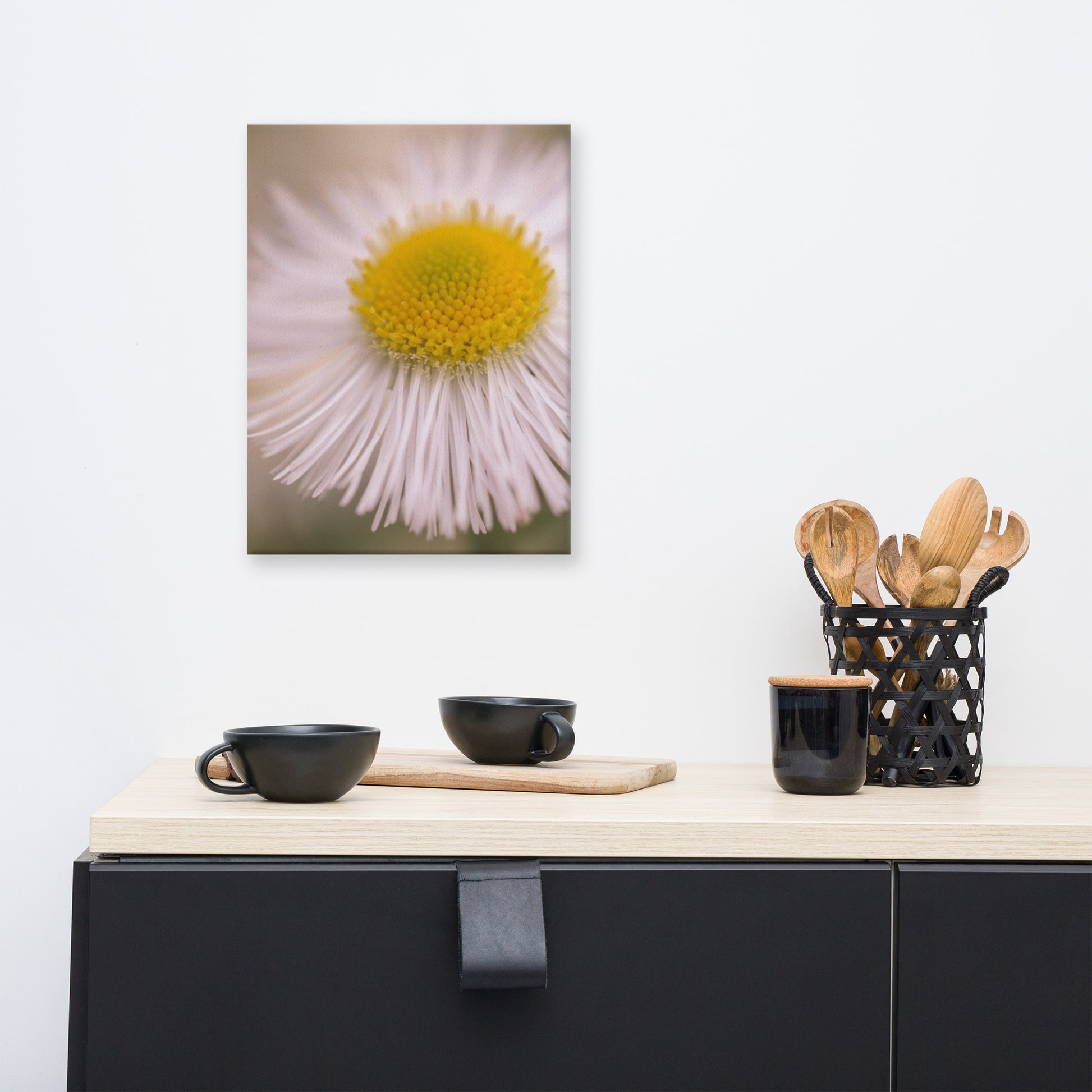 About this abstract flower canvas art: "Philadelphia Fleabane Single Bloom" brings the gentle beauty of early spring into your home. This softly lit, soft-focus nature photograph captures the ethereal elegance of a single Philadelphia Fleabane flower in full bloom. The delicate white petals and vibrant yellow stigma create a captivating focal point, perfect for enhancing the calming atmosphere of living rooms, bedrooms, and bathrooms, or adding a touch of nature's charm to dining areas. Experience the tranquil essence of springtime with this evocative artwork.