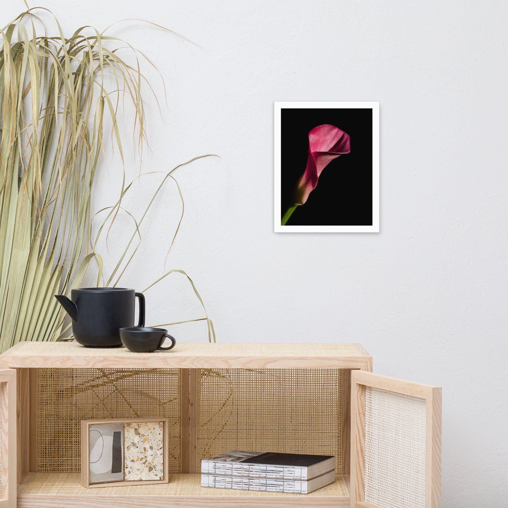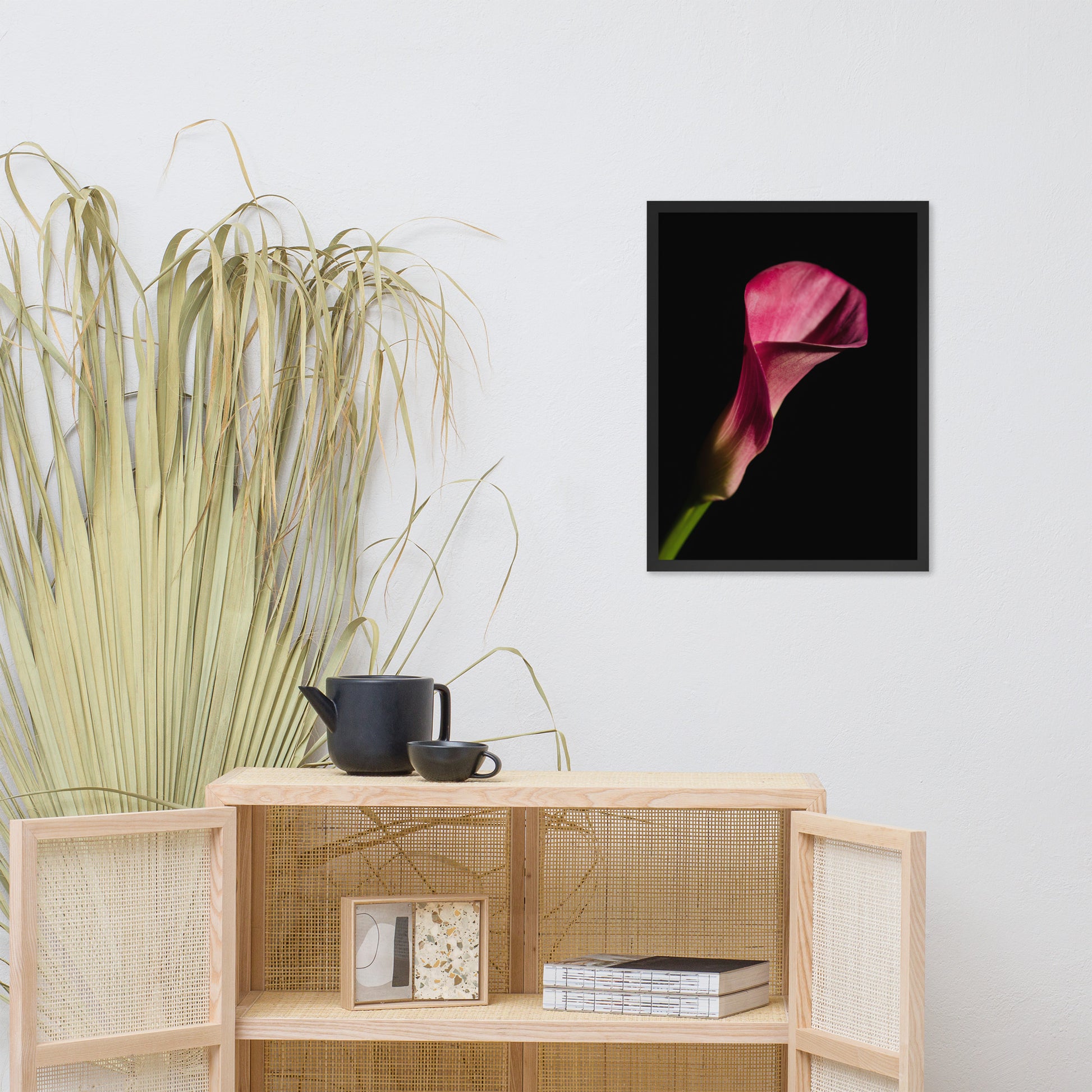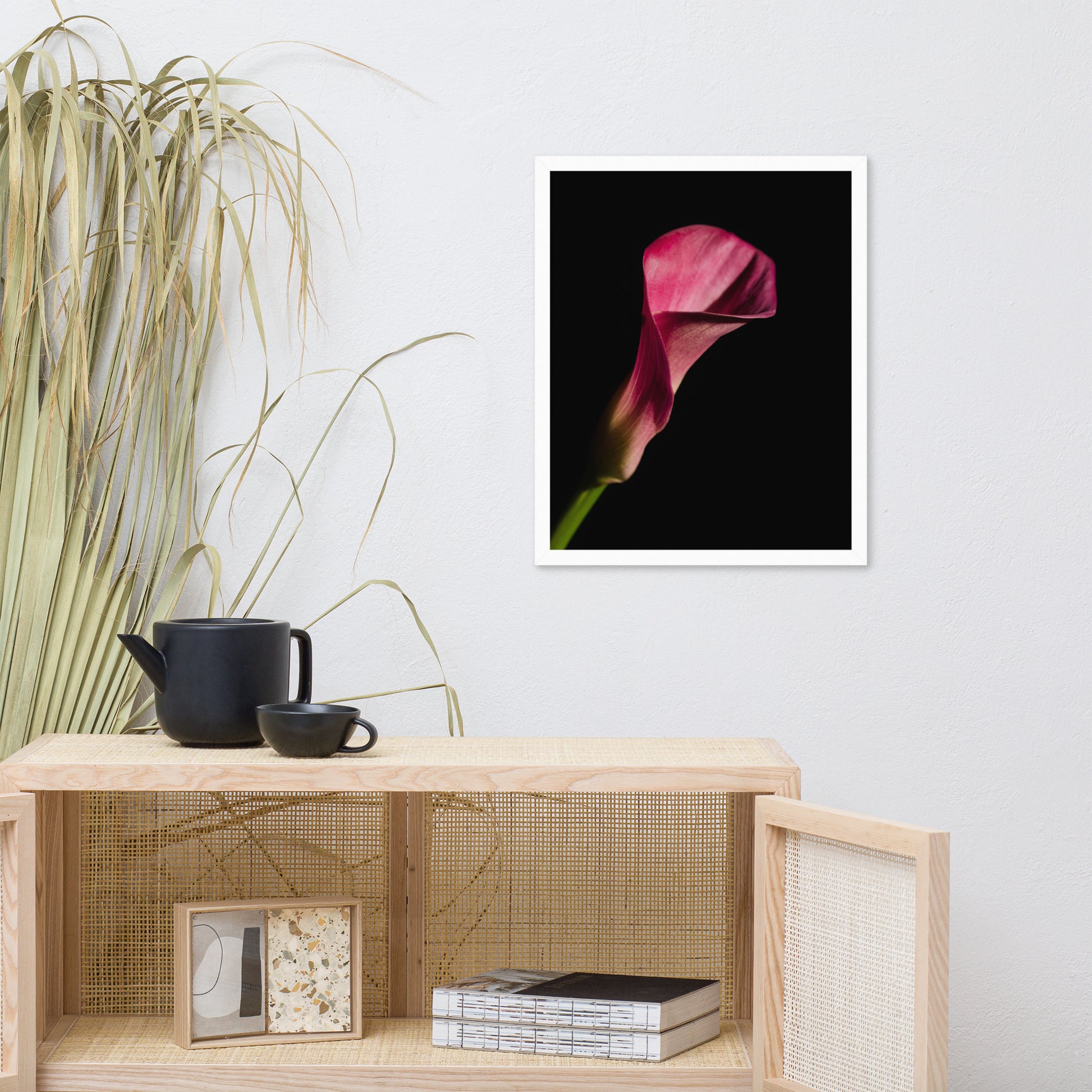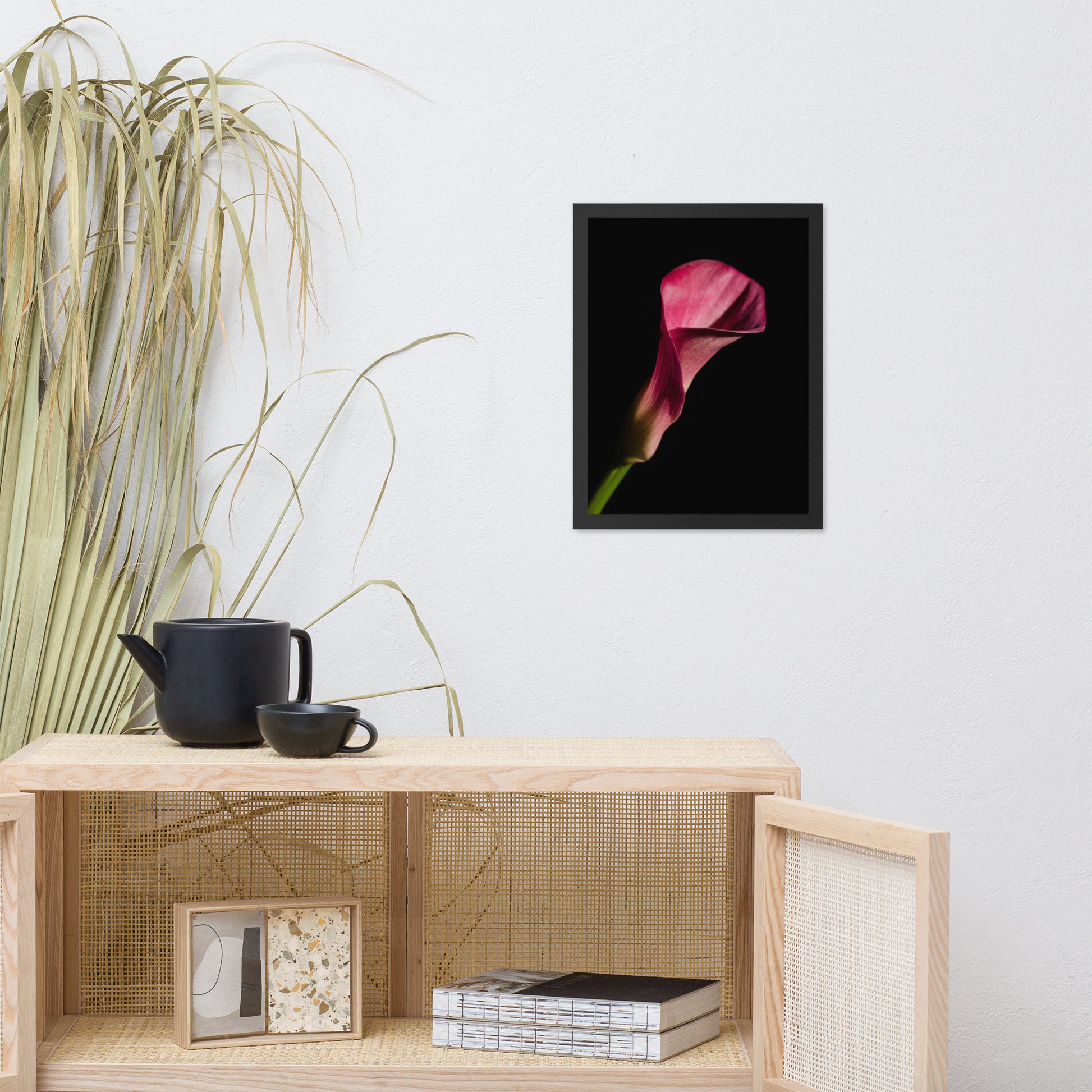 About this moody floral wall art: Bring the timeless beauty of a pink calla lily into your home with this stunning framed wall art print. This captivating piece features a single pink calla lily in full bloom, set against a dramatic black background. The flower's delicate petals and elegant shape are captured in stunning detail, creating a piece that is both eye-catching and sophisticated.
