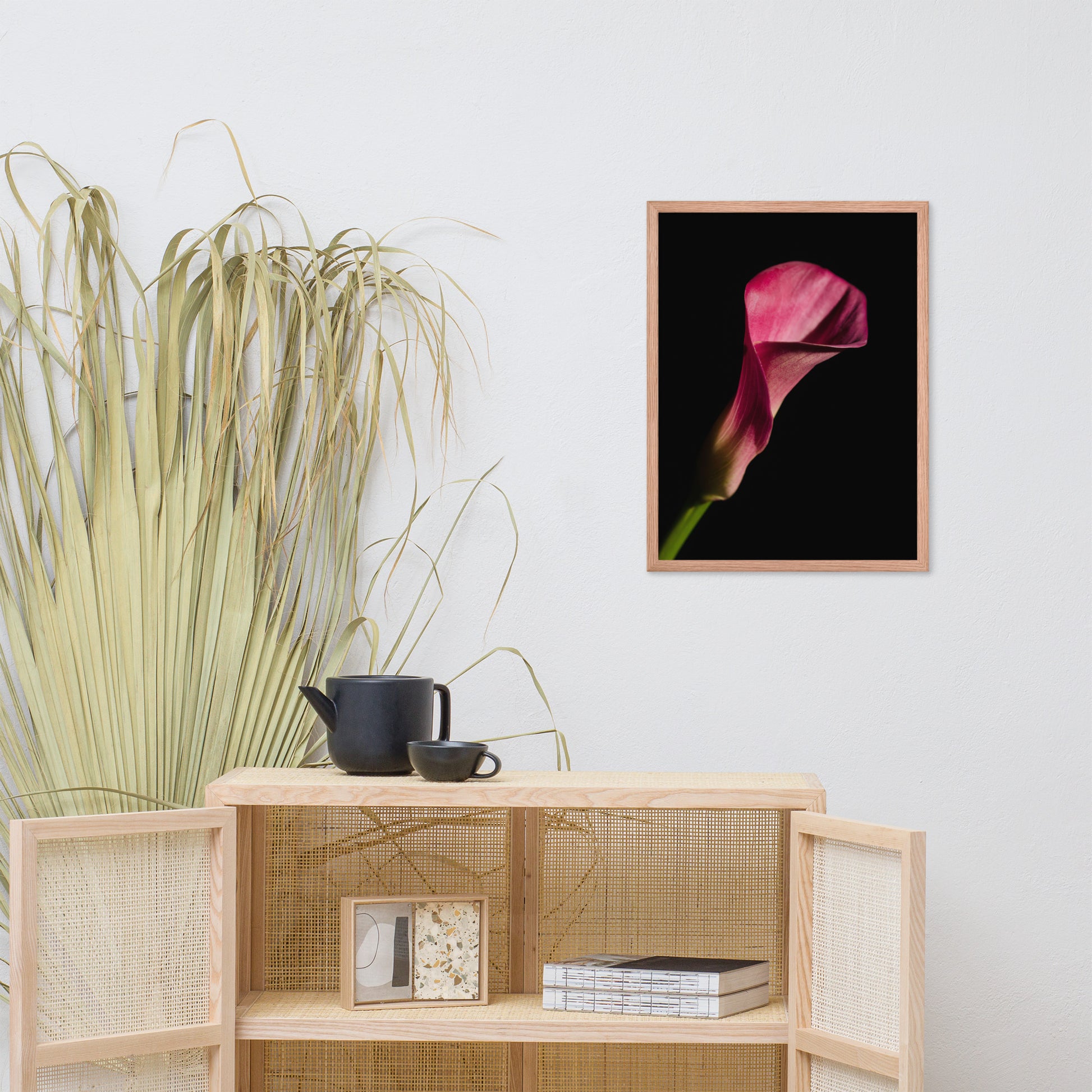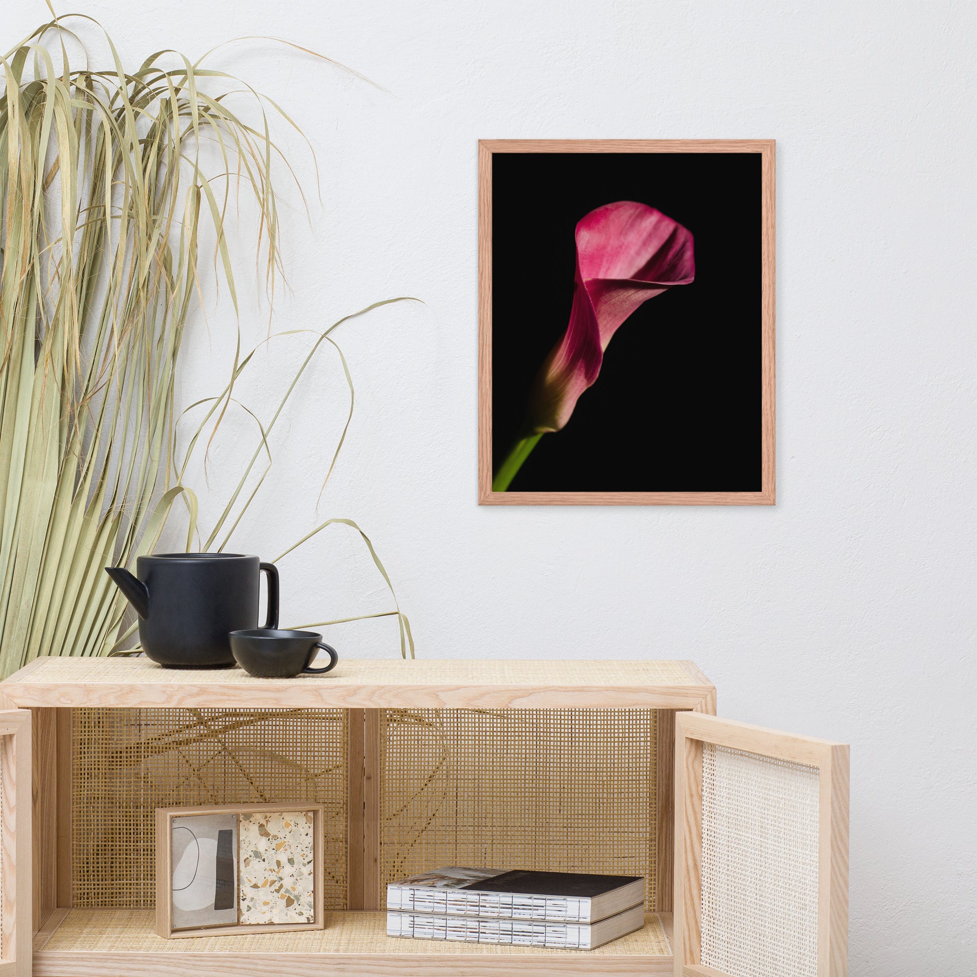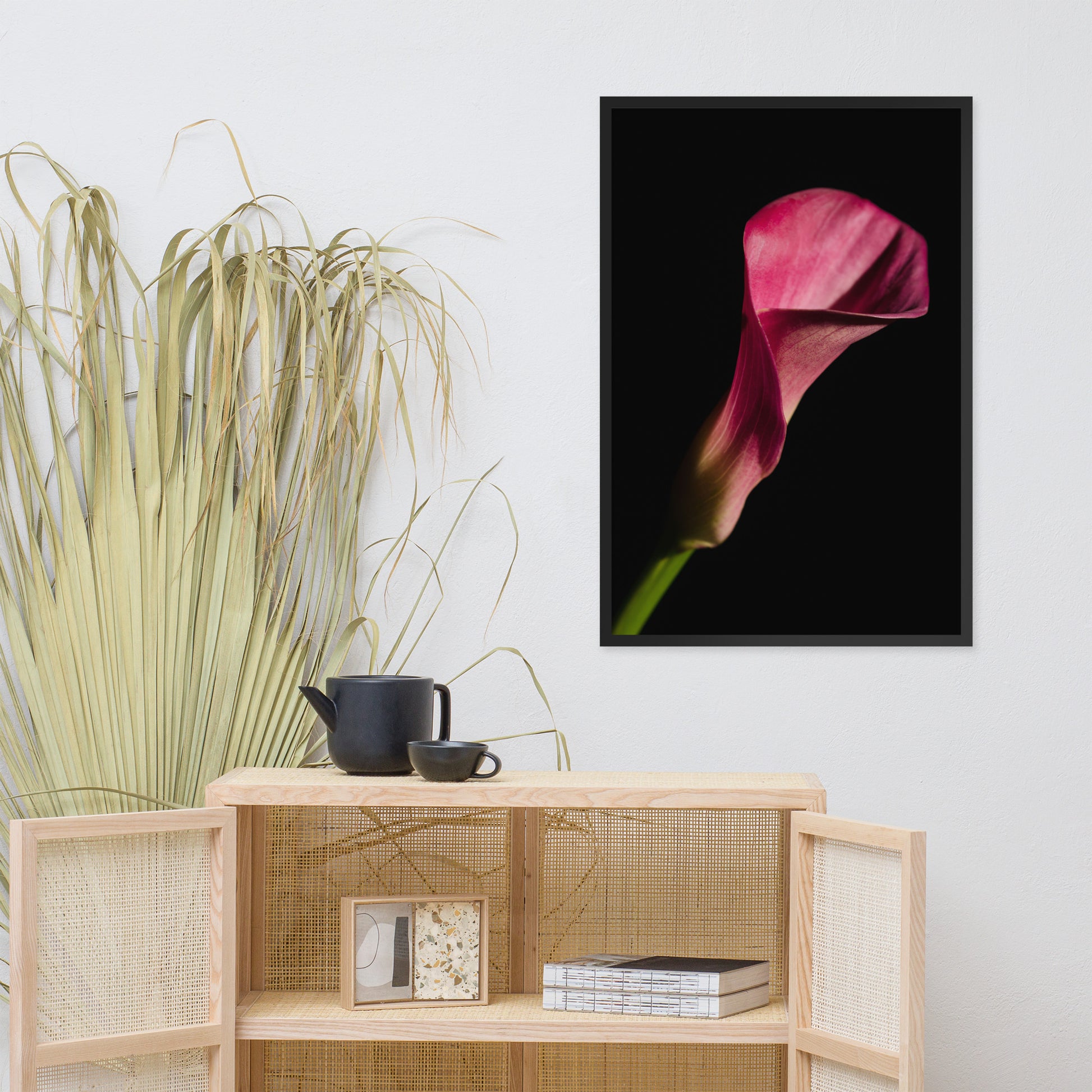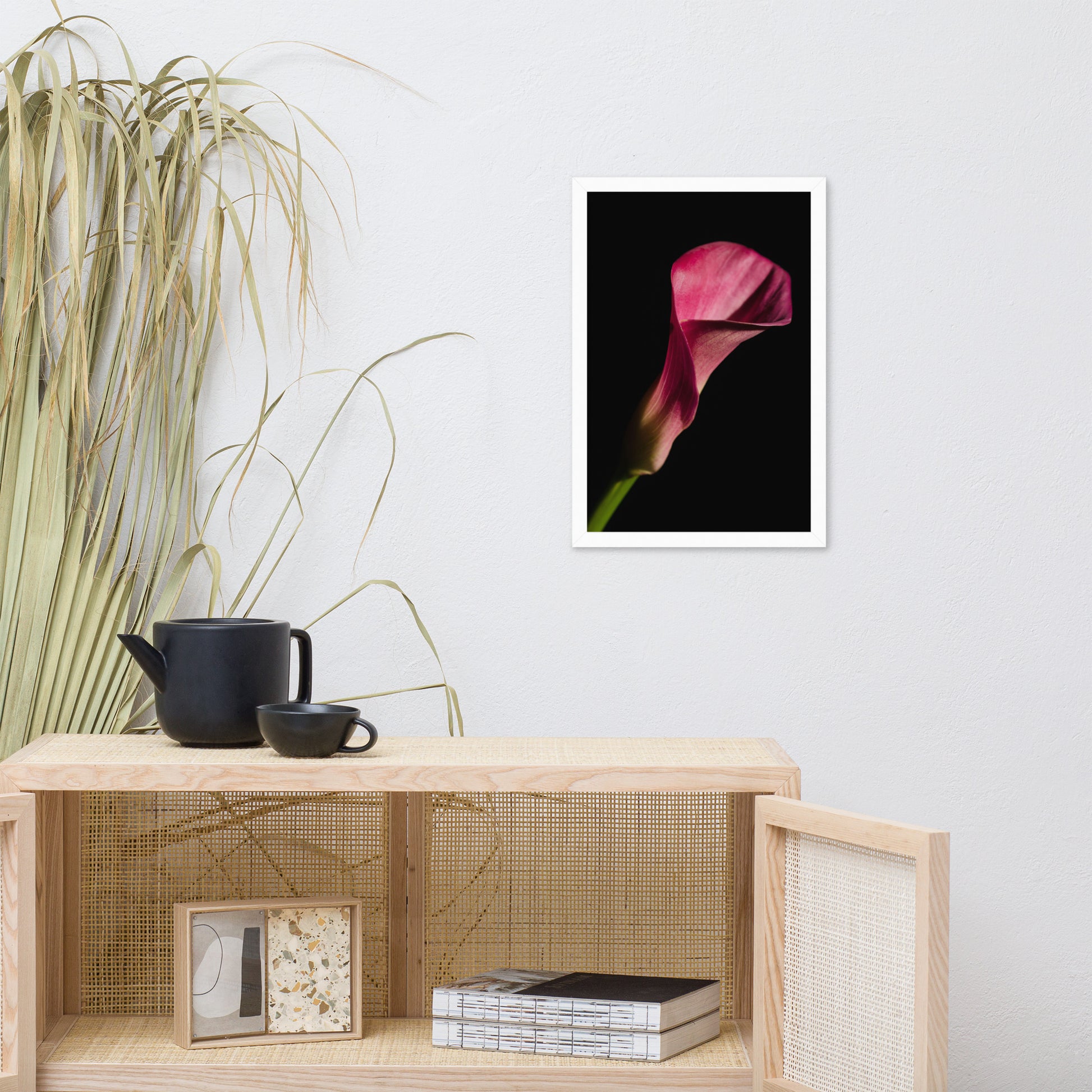 About this moody floral wall art: Bring the timeless beauty of a pink calla lily into your home with this stunning framed wall art print. This captivating piece features a single pink calla lily in full bloom, set against a dramatic black background. The flower's delicate petals and elegant shape are captured in stunning detail, creating a piece that is both eye-catching and sophisticated.