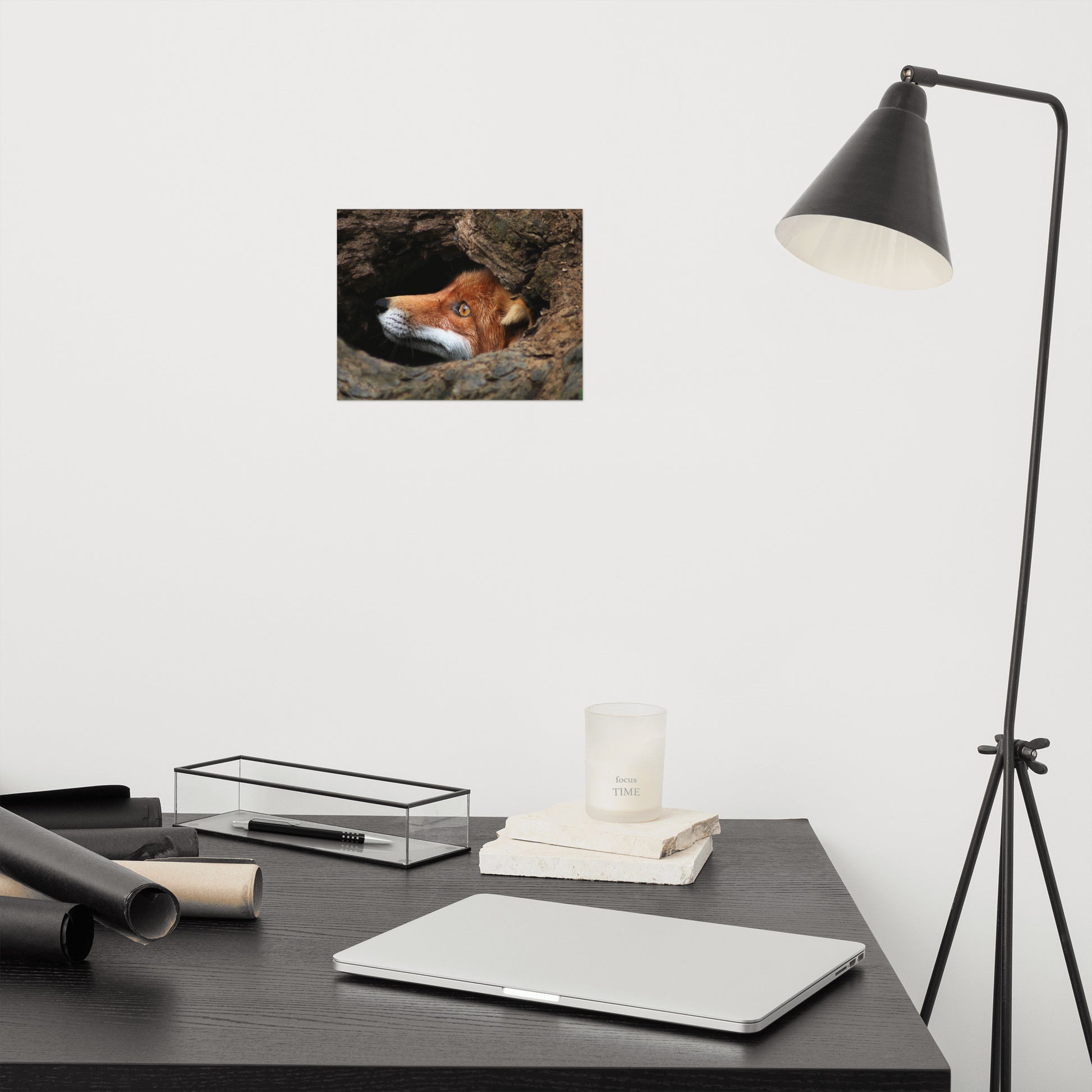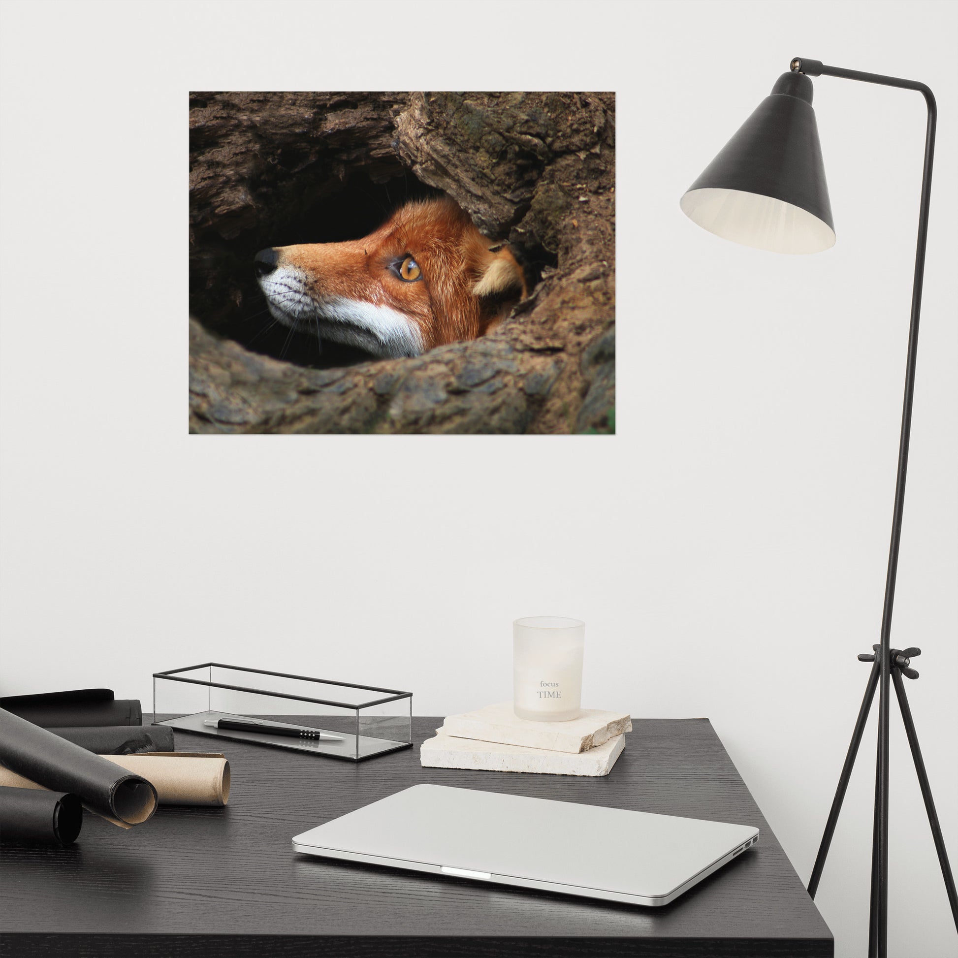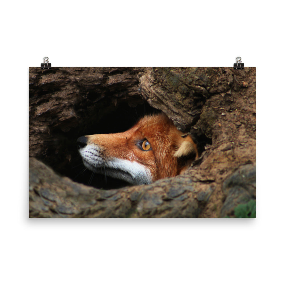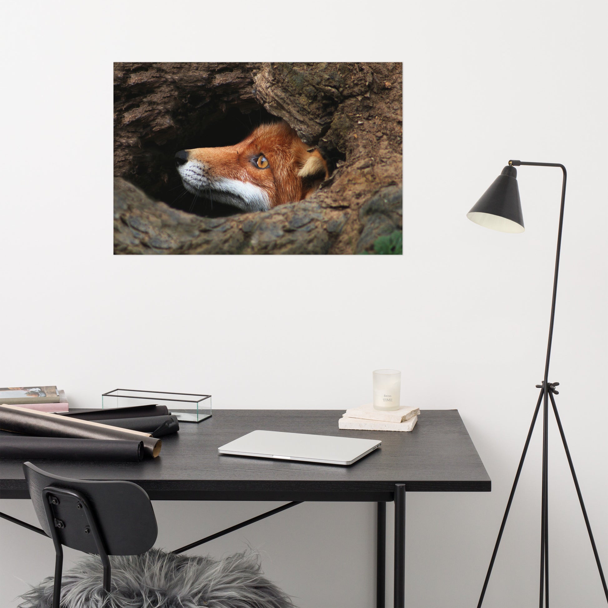 About these rustic wild art prints: What's more captivating than having a slice of the wilderness right in your home or office? That's exactly what this rustic animal wall art offers. The photograph captures an adult red fox poking its head out of its den, a rotting tree trunk. The image is striking - it's as if the fox is peeping out from the canvas, its intelligent eyes looking right at you. The rustic charm of the photograph is further enhanced by the weathered tree trunk, which adds an element of ruggedness and raw beauty to the piece.