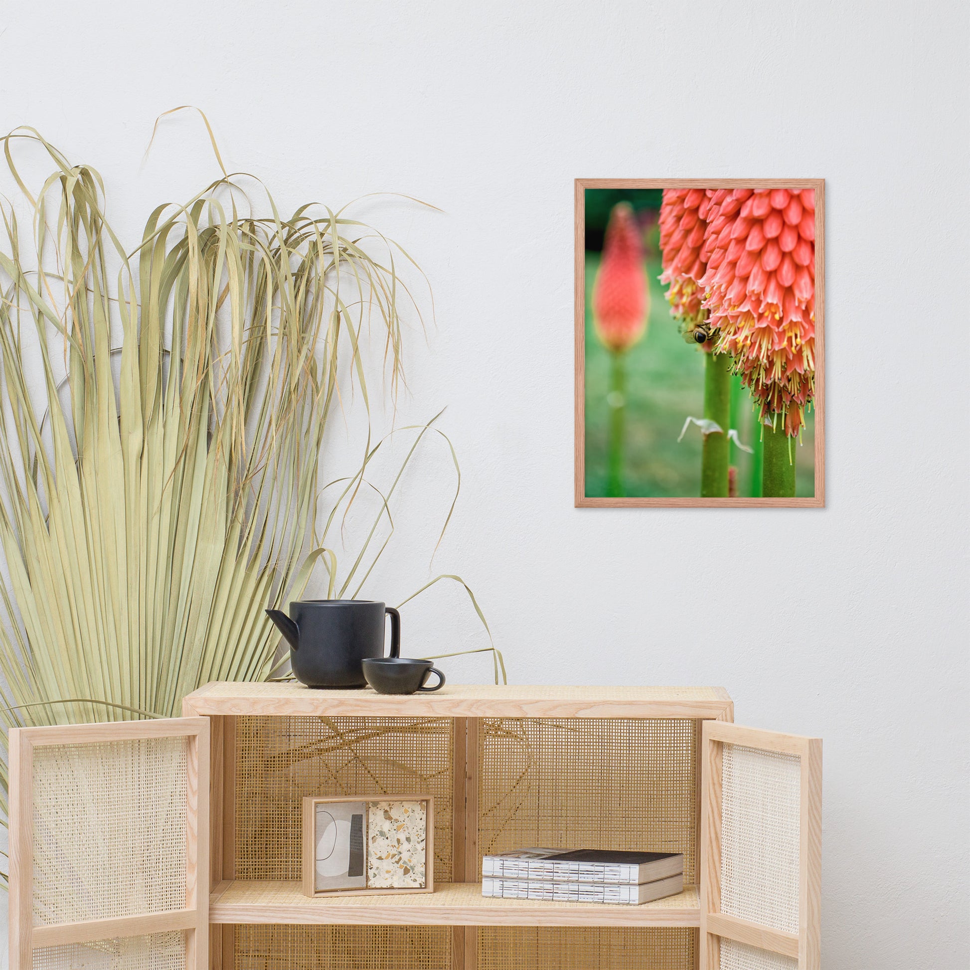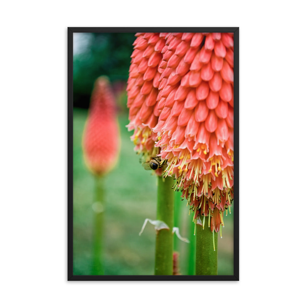 About these wall art pictures of flowers: Bring the vibrant beauty of nature into your home with "Red Hot Pokers," a stunning framed art print that captures the essence of a summer garden. The print showcases the intricate details of the Red Hot Poker flower, with its fiery orange blossoms and delicate yellow stamens. A lone bee hovers near the flower, adding a touch of life and movement to the scene. The blurred background of lush greenery creates a sense of depth and serenity, inviting the viewer to step into a peaceful oasis.