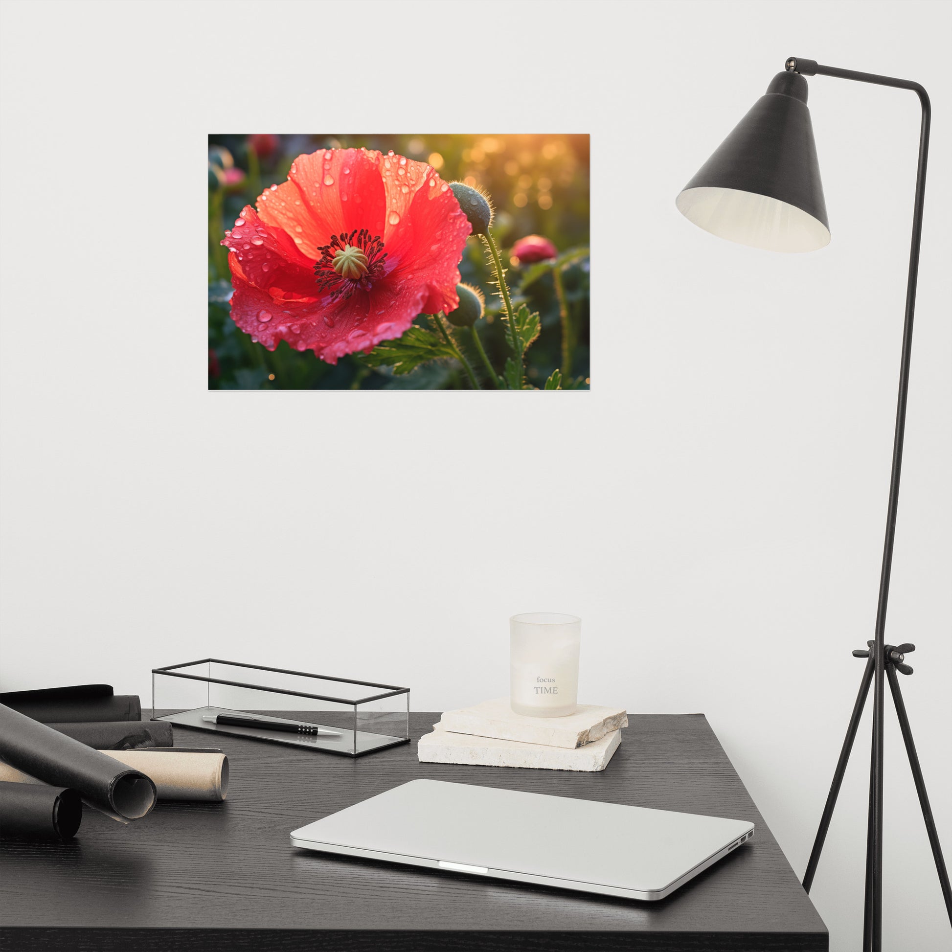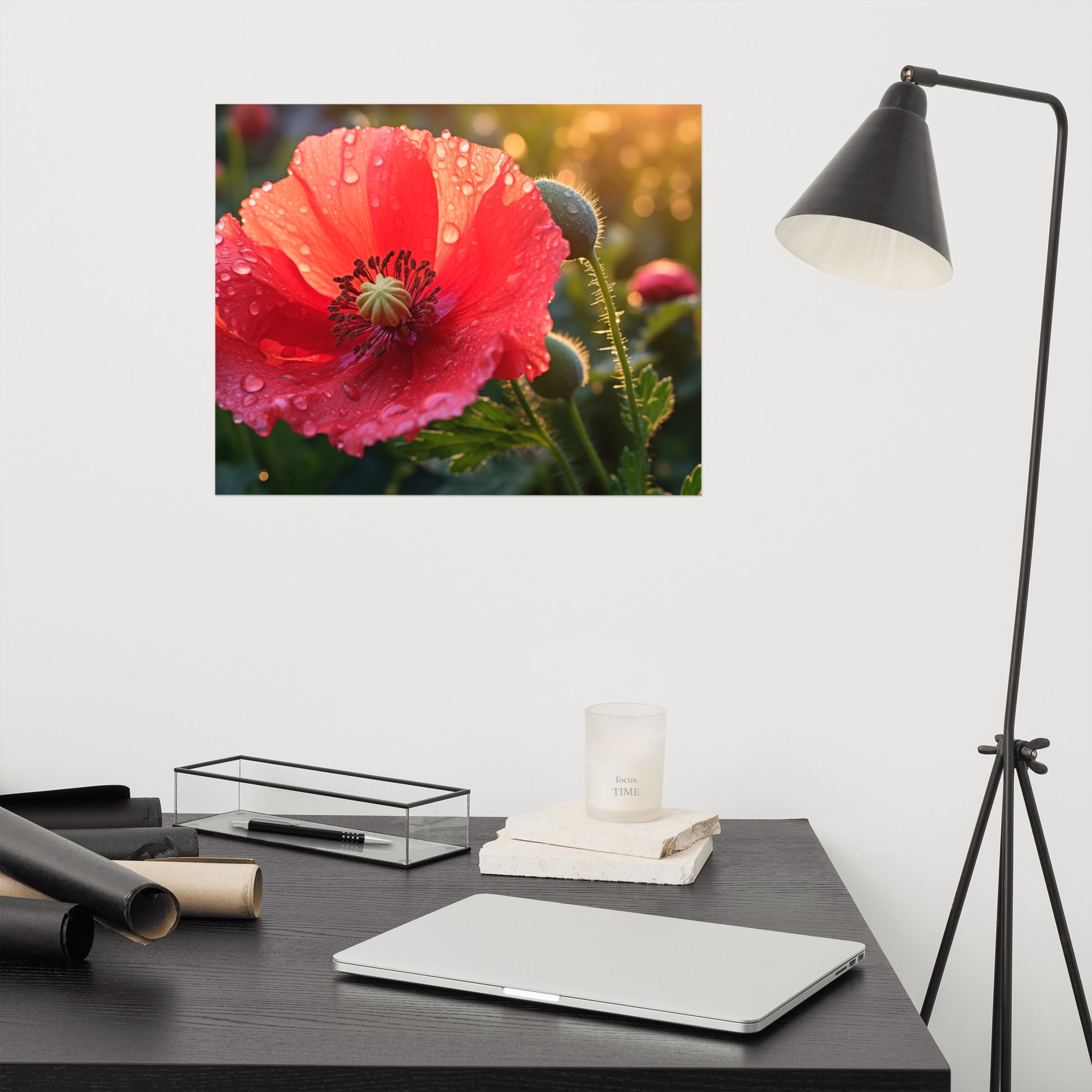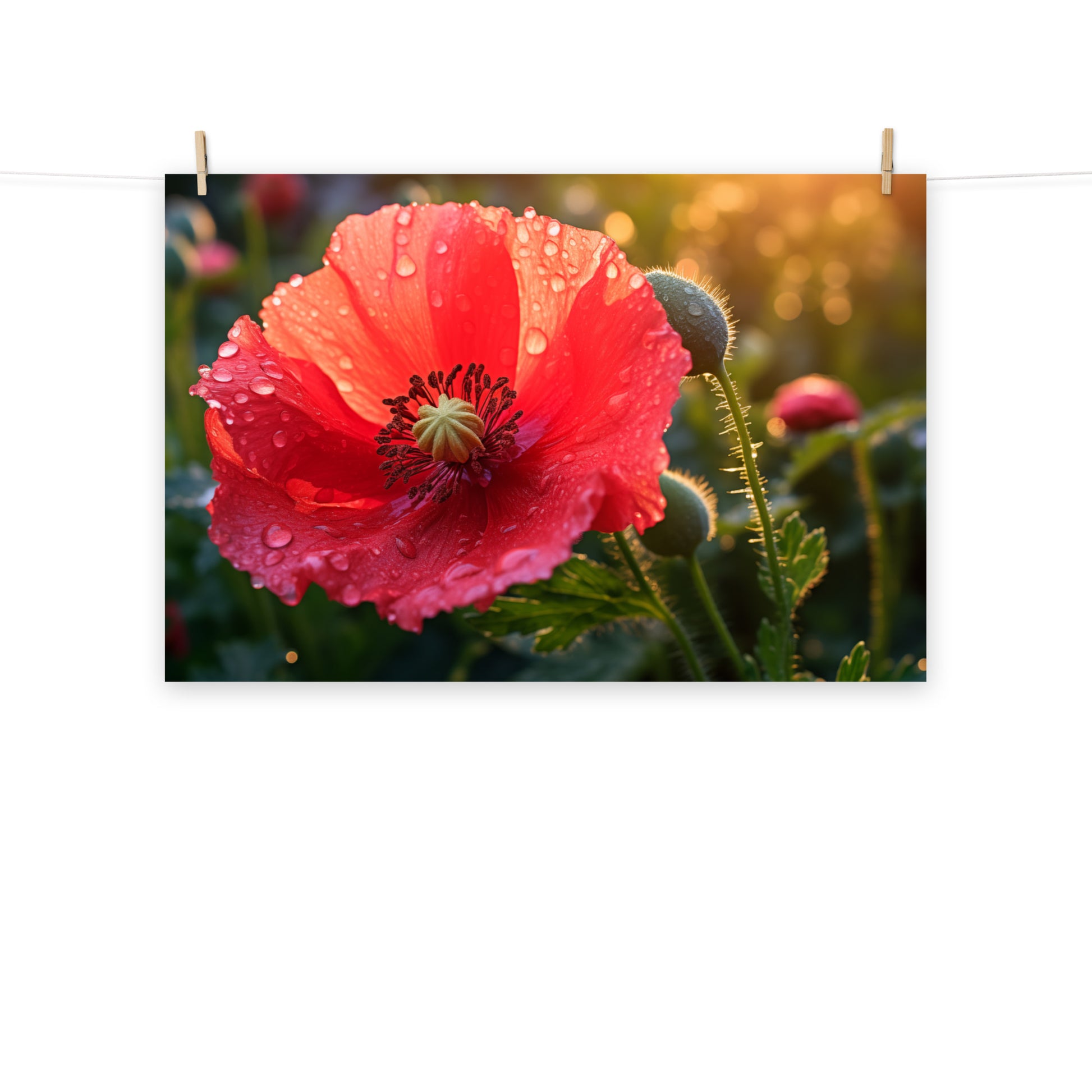 "Resilient Bloom" captures the delicate beauty of a poppy flower in stunning detail, its vibrant red petals adorned with glistening dewdrops. This captivating digital artwork showcases the flower's resilience and strength, having bloomed despite the elements, as evidenced by the glistening water droplets clinging to its surface. The soft, diffused light creates a warm and inviting atmosphere, highlighting the intricate textures and delicate veins of the petals. A budding poppy and subtle background foliage add depth and context to the composition, hinting at the continuous cycle of growth and renewal. Printed on high-quality photo paper with premium inks, this unframed print preserves the rich colors and textures of the flower, bringing a touch of natural elegance to any space.