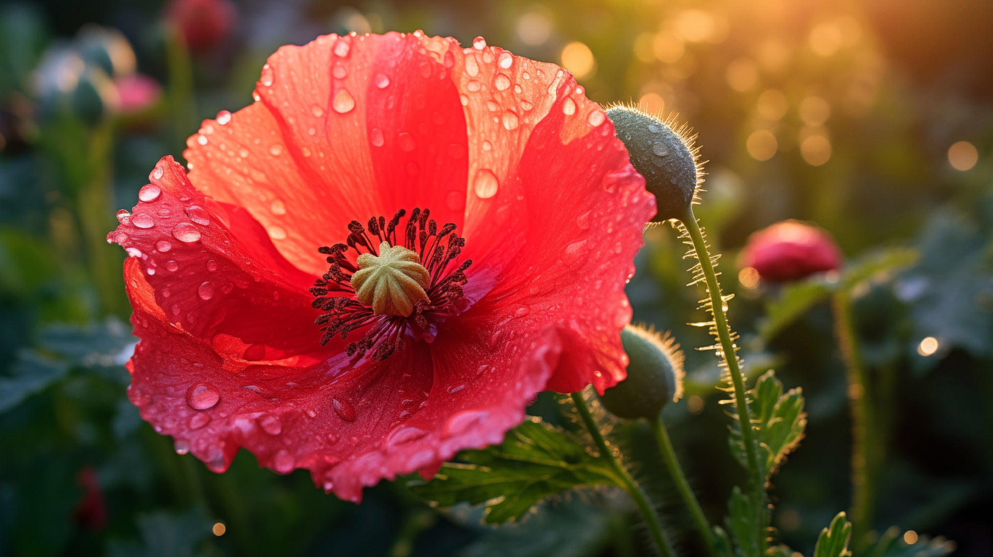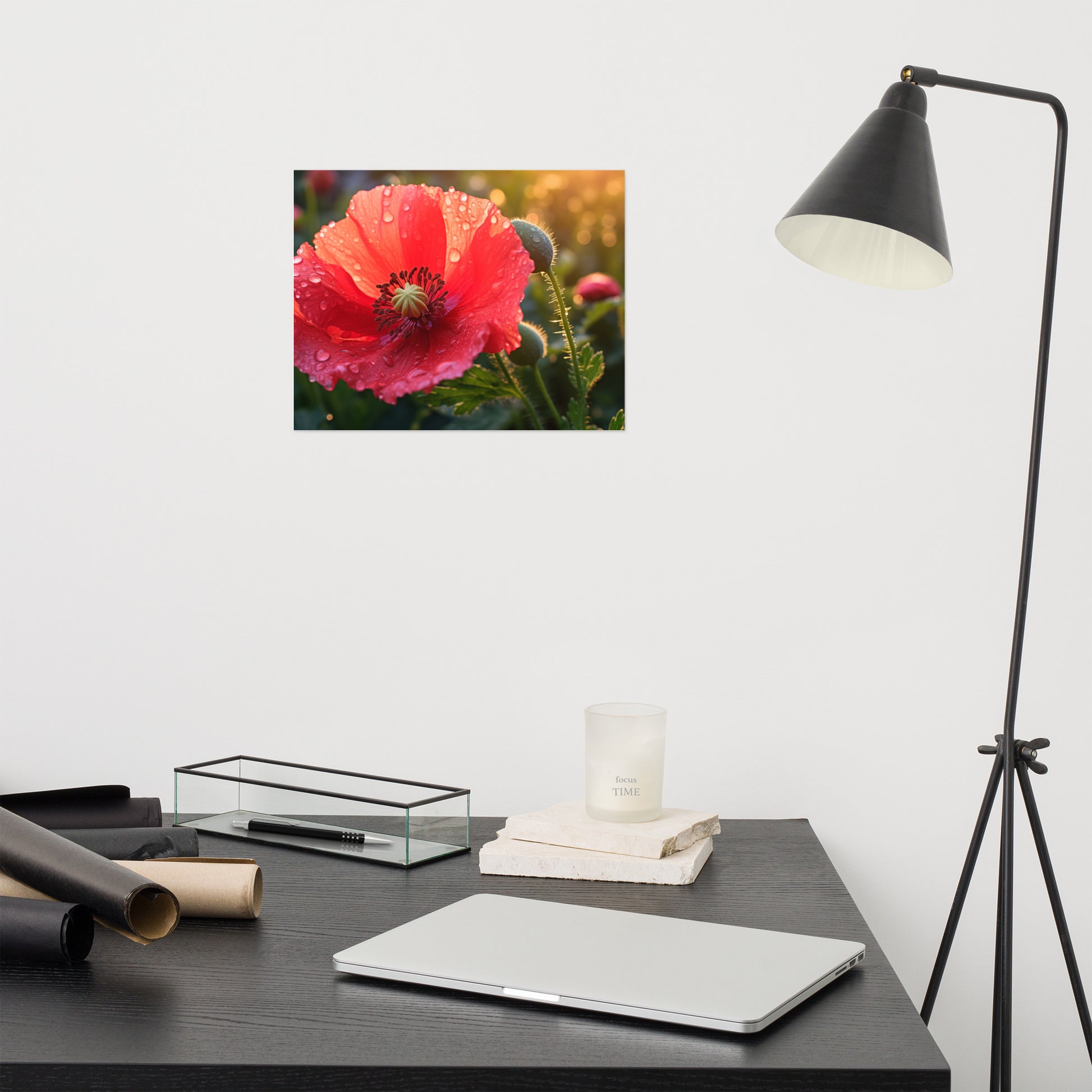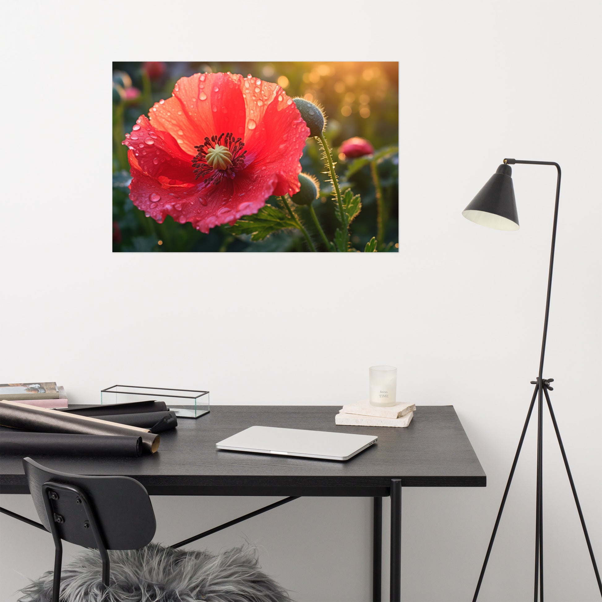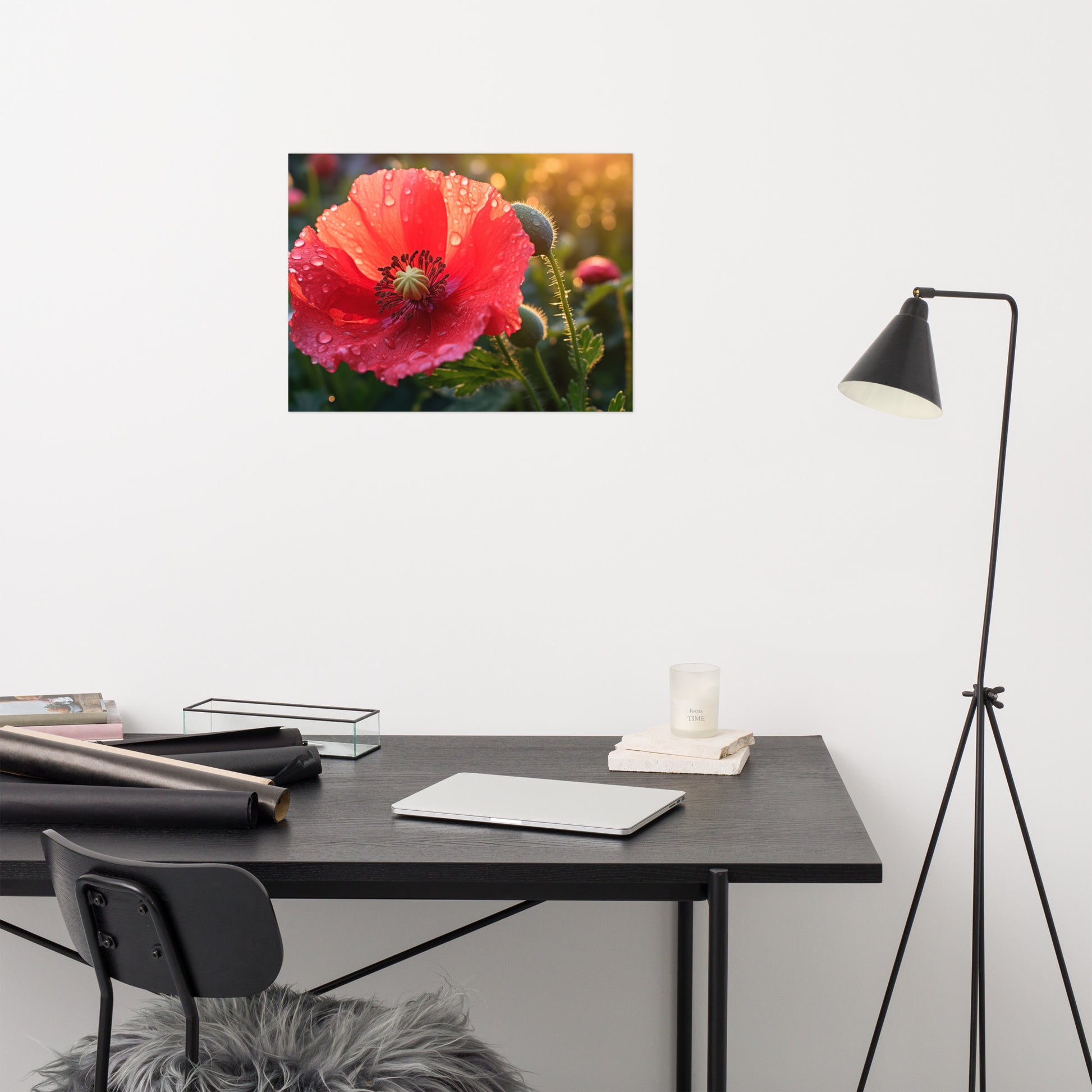 "Resilient Bloom" captures the delicate beauty of a poppy flower in stunning detail, its vibrant red petals adorned with glistening dewdrops. This captivating digital artwork showcases the flower's resilience and strength, having bloomed despite the elements, as evidenced by the glistening water droplets clinging to its surface. The soft, diffused light creates a warm and inviting atmosphere, highlighting the intricate textures and delicate veins of the petals. A budding poppy and subtle background foliage add depth and context to the composition, hinting at the continuous cycle of growth and renewal. Printed on high-quality photo paper with premium inks, this unframed print preserves the rich colors and textures of the flower, bringing a touch of natural elegance to any space.