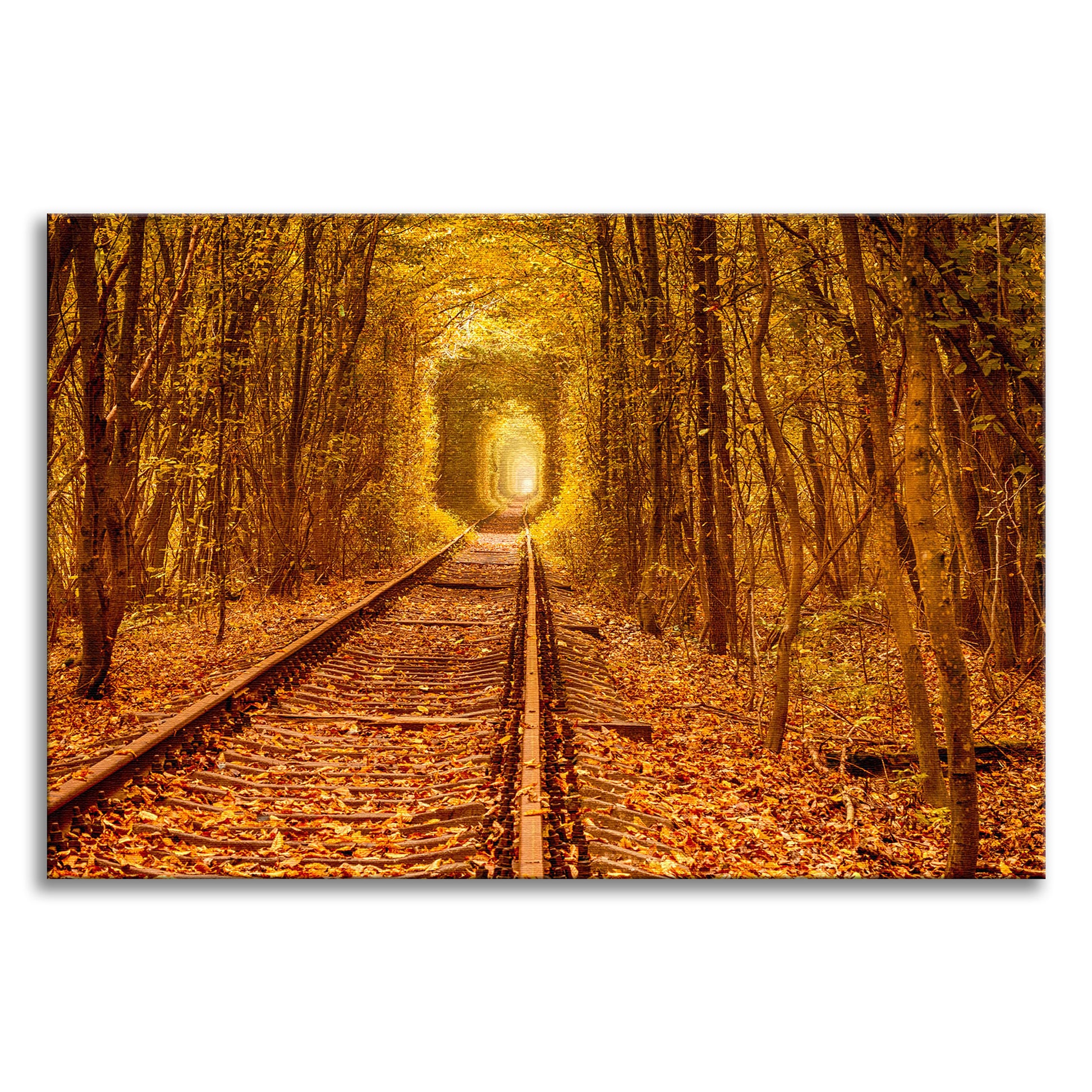 About this modern rustic artwork: This enchanting canvas print captures the breathtaking beauty of the "Tunnel of Love" in Ukraine, a natural wonder where a railway track winds through a tunnel of vibrant autumn foliage. The lush green trees, adorned in shades of gold, orange, and red, create a captivating canopy that beckons you to step into a world of romance and serenity. The light at the end of the tunnel symbolizes hope and new beginnings, making this artwork a perfect addition to any space where you seek tranquility and inspiration.