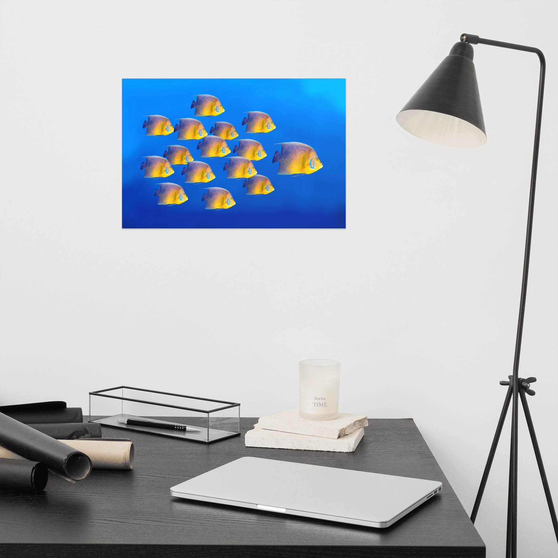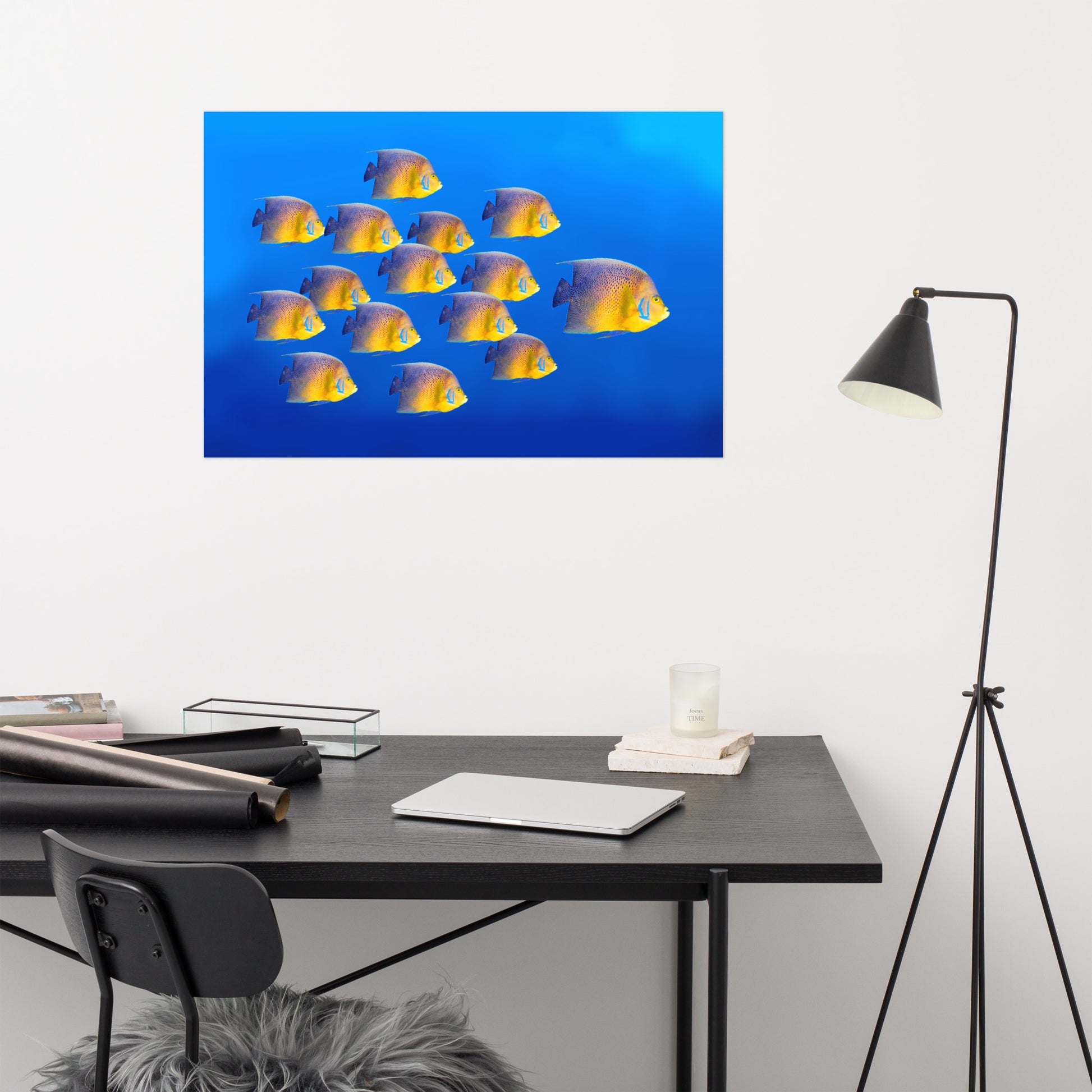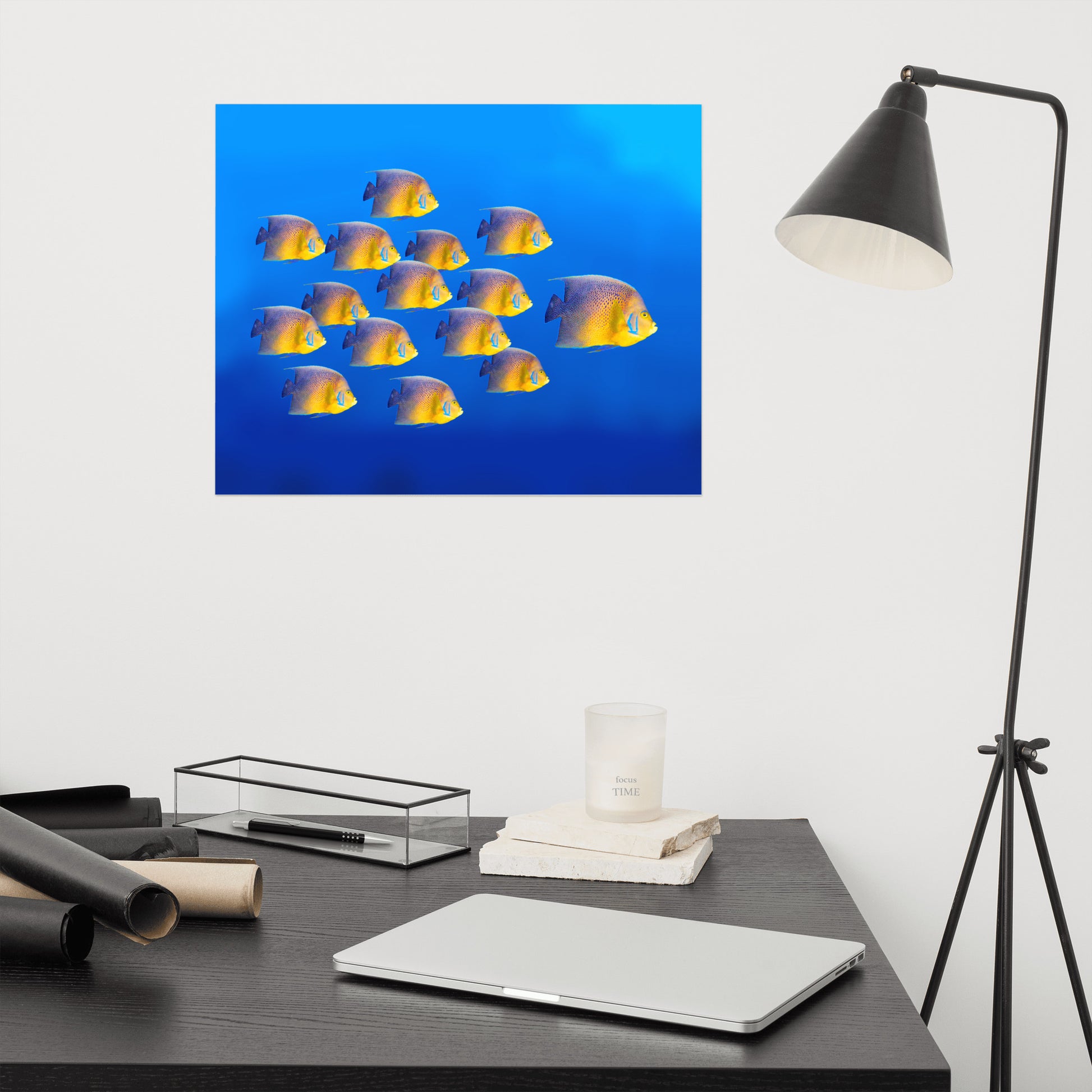 About this marine life photograph: Bring the tranquility and vibrancy of the ocean into your home with this stunning frameable art print. A school of radiant yellow Angelfish gracefully navigates the deep blue sea, their vivid colors popping against the calming backdrop. This minimalist wildlife photograph captures the beauty and serenity of marine life, making it a perfect addition to any space seeking a touch of nature's wonder.