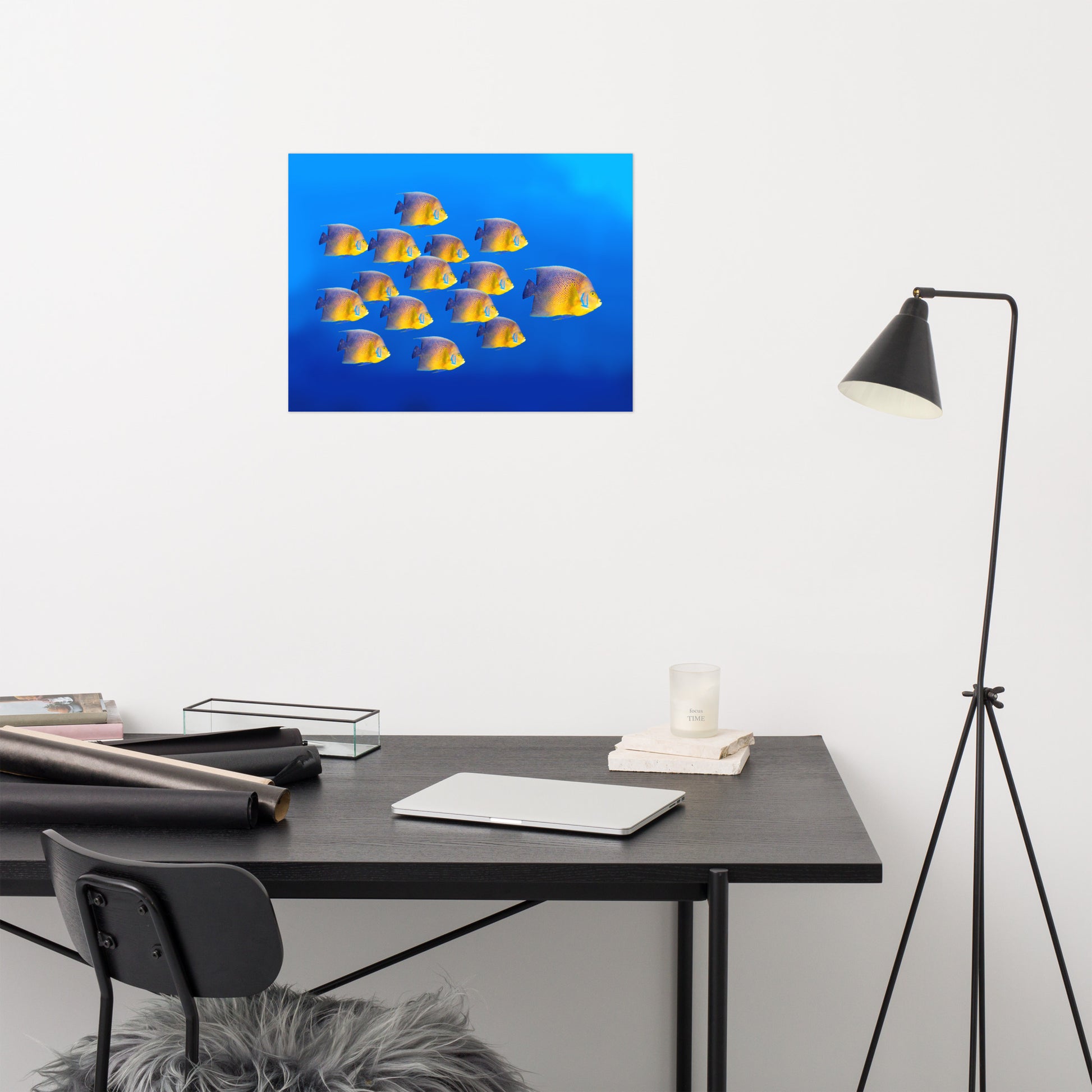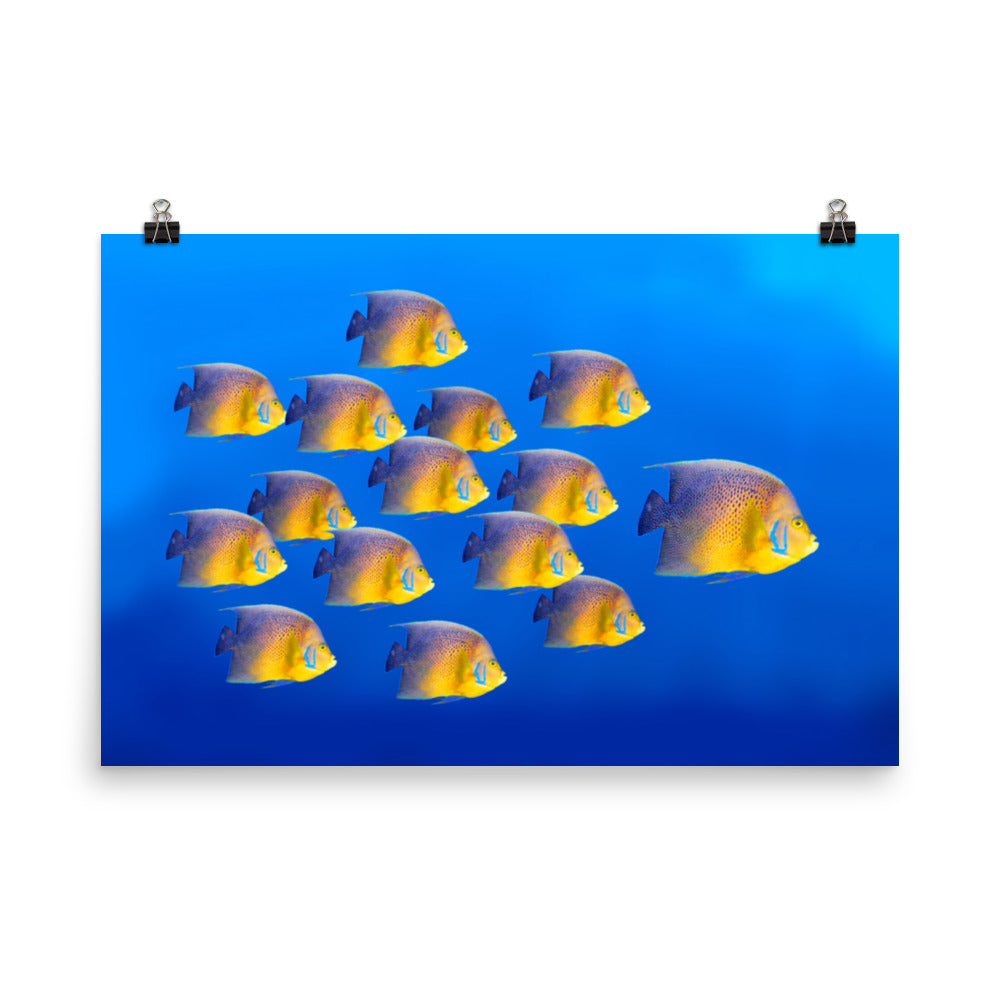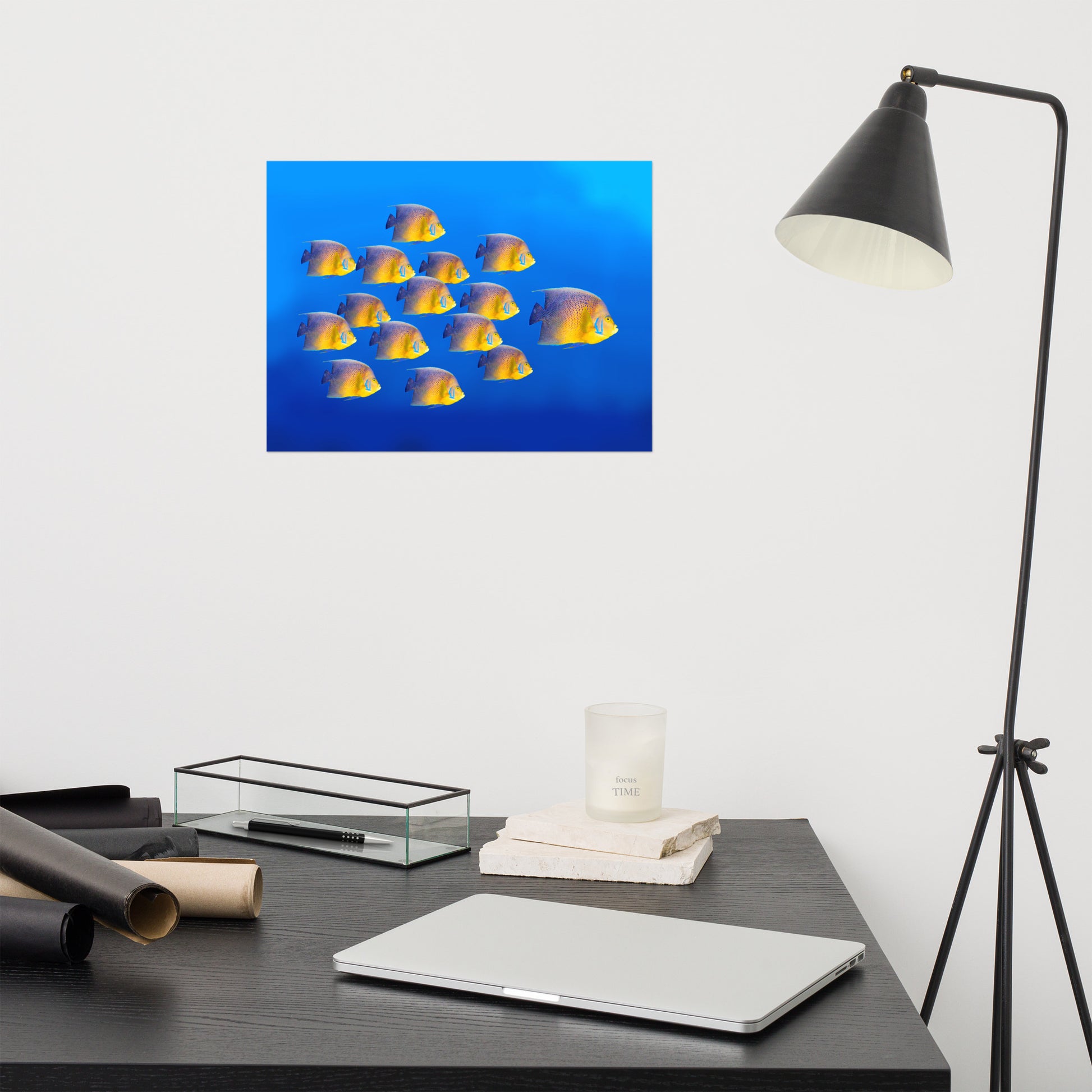 About this marine life photograph: Bring the tranquility and vibrancy of the ocean into your home with this stunning frameable art print. A school of radiant yellow Angelfish gracefully navigates the deep blue sea, their vivid colors popping against the calming backdrop. This minimalist wildlife photograph captures the beauty and serenity of marine life, making it a perfect addition to any space seeking a touch of nature's wonder.