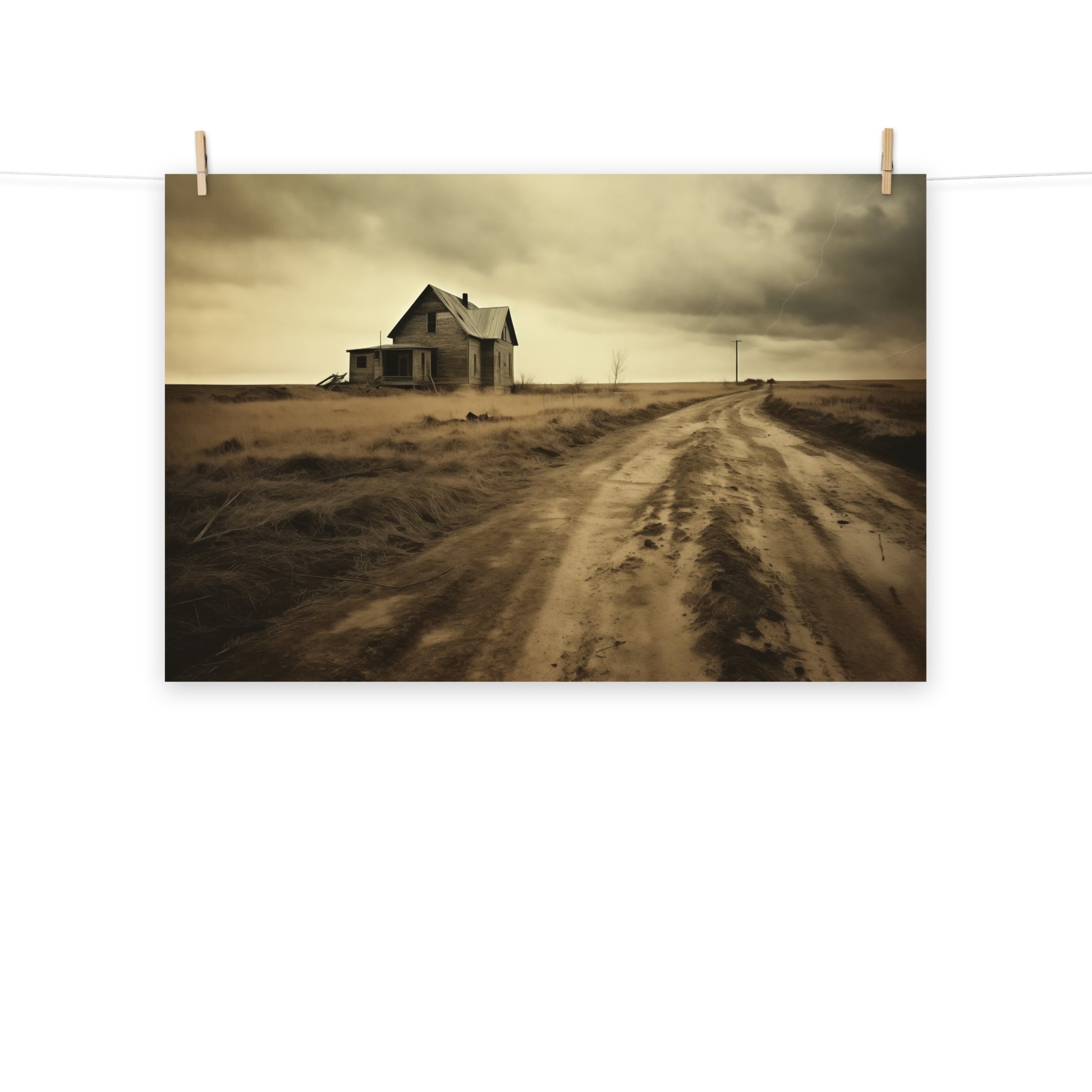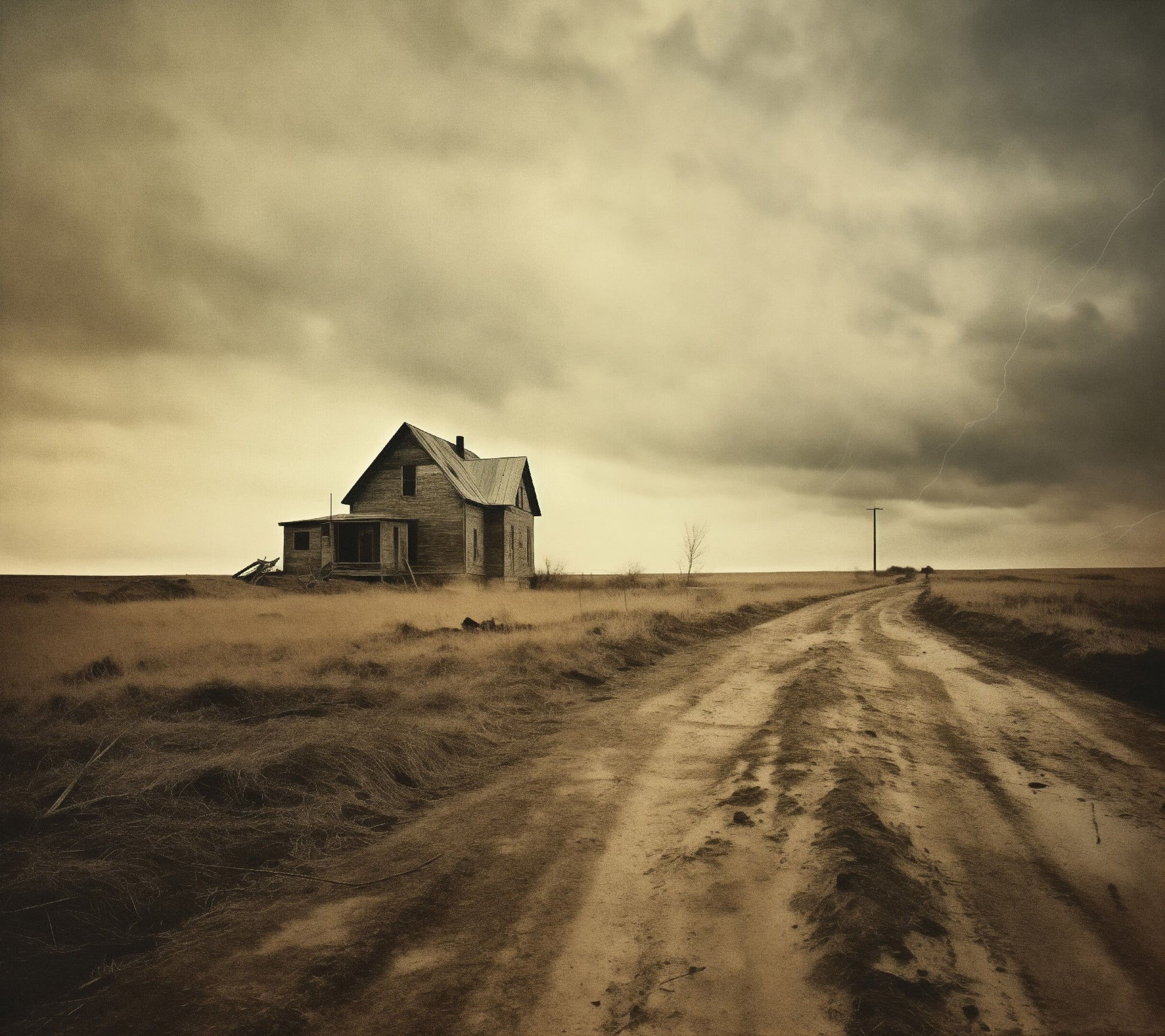 "Solitude's Embrace" is a photorealistic digital artwork depicting an old, weathered farmhouse standing alone in a vast, desolate landscape. The house, its paint peeling and wood rotting, appears abandoned and forgotten, yet it exudes a quiet dignity. The surrounding fields, dry and barren, stretch to the horizon under a stormy sky filled with dark, ominous clouds. A dirt road, deeply rutted and uneven, leads to the house, suggesting a long and arduous journey. The overall color palette is muted, with a vintage feel, enhancing the sense of isolation and melancholy.