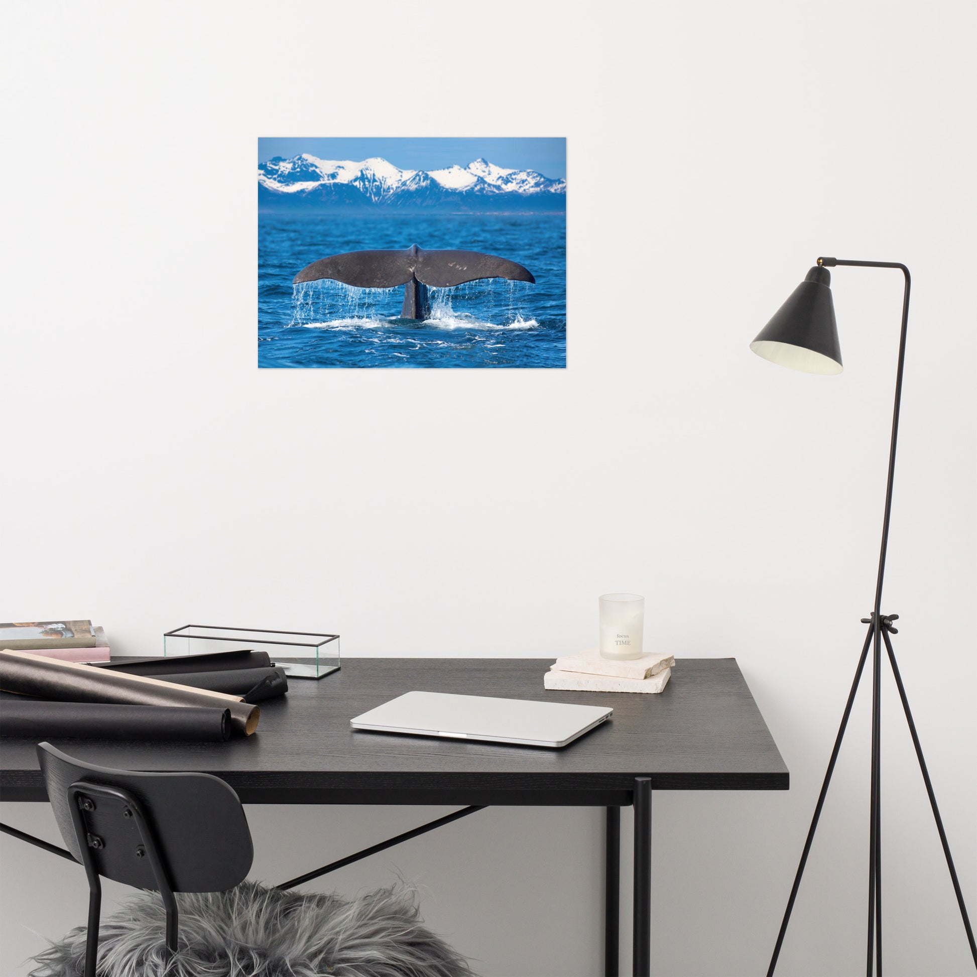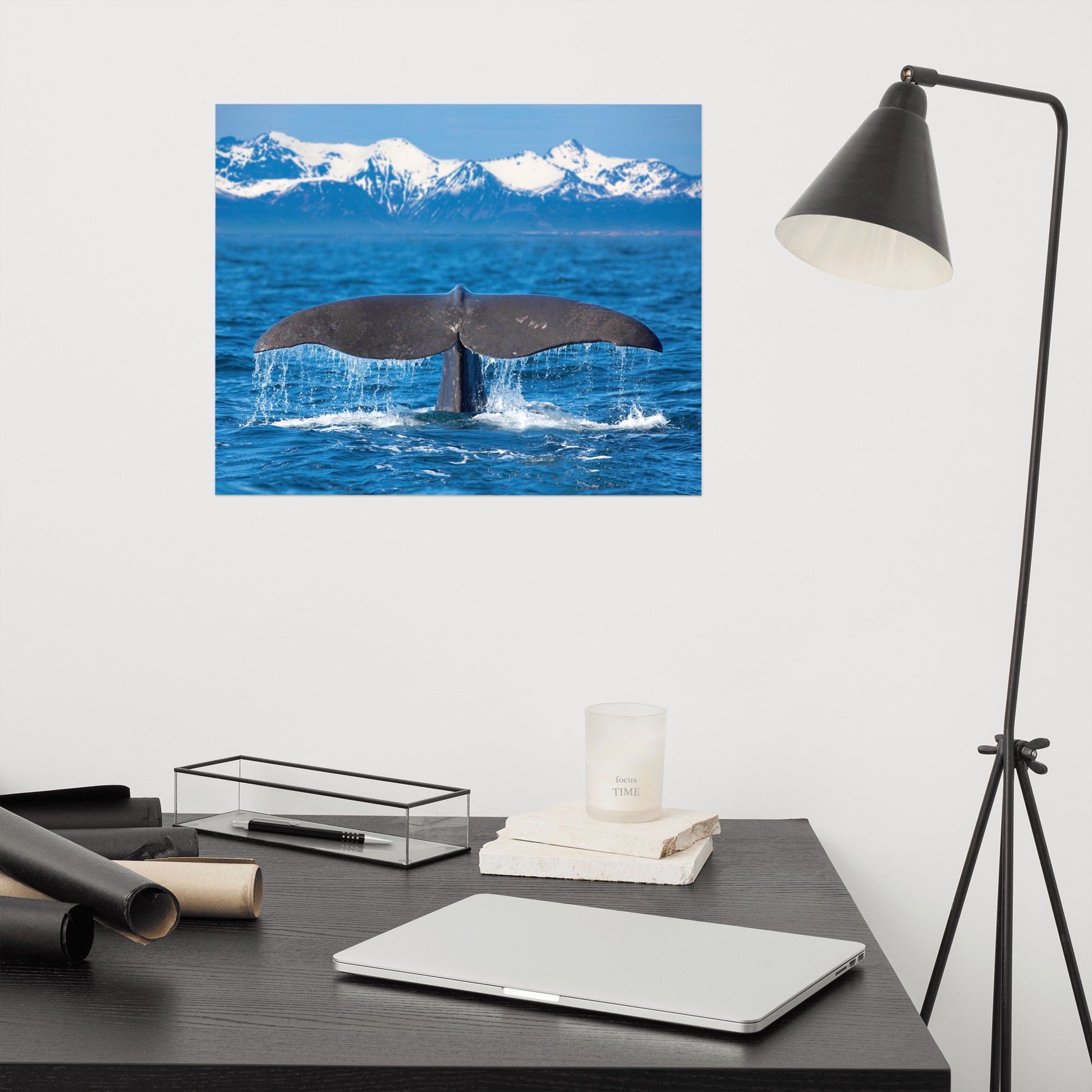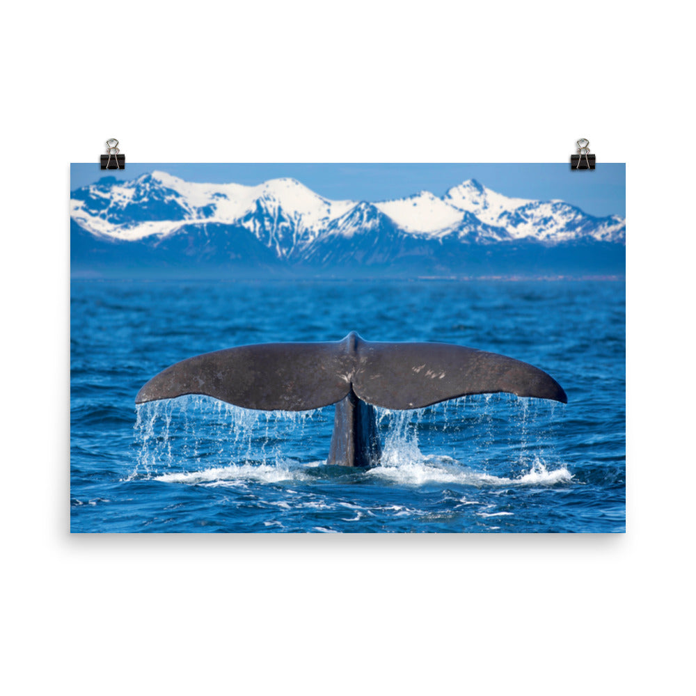 About this rustic beach wall decor: Capture the majesty of nature with this breathtaking wildlife photograph. Witness the power and grace of a Sperm Whale as its iconic flukes disappear beneath the surface, snow-capped peaks towering in the distance. This unframed print is perfect for adding a touch of wild beauty to any space, inviting you to dream of vast oceans and untamed landscapes. Printed on high-quality photo paper, this stunning image will transport you to a world where nature reigns supreme.