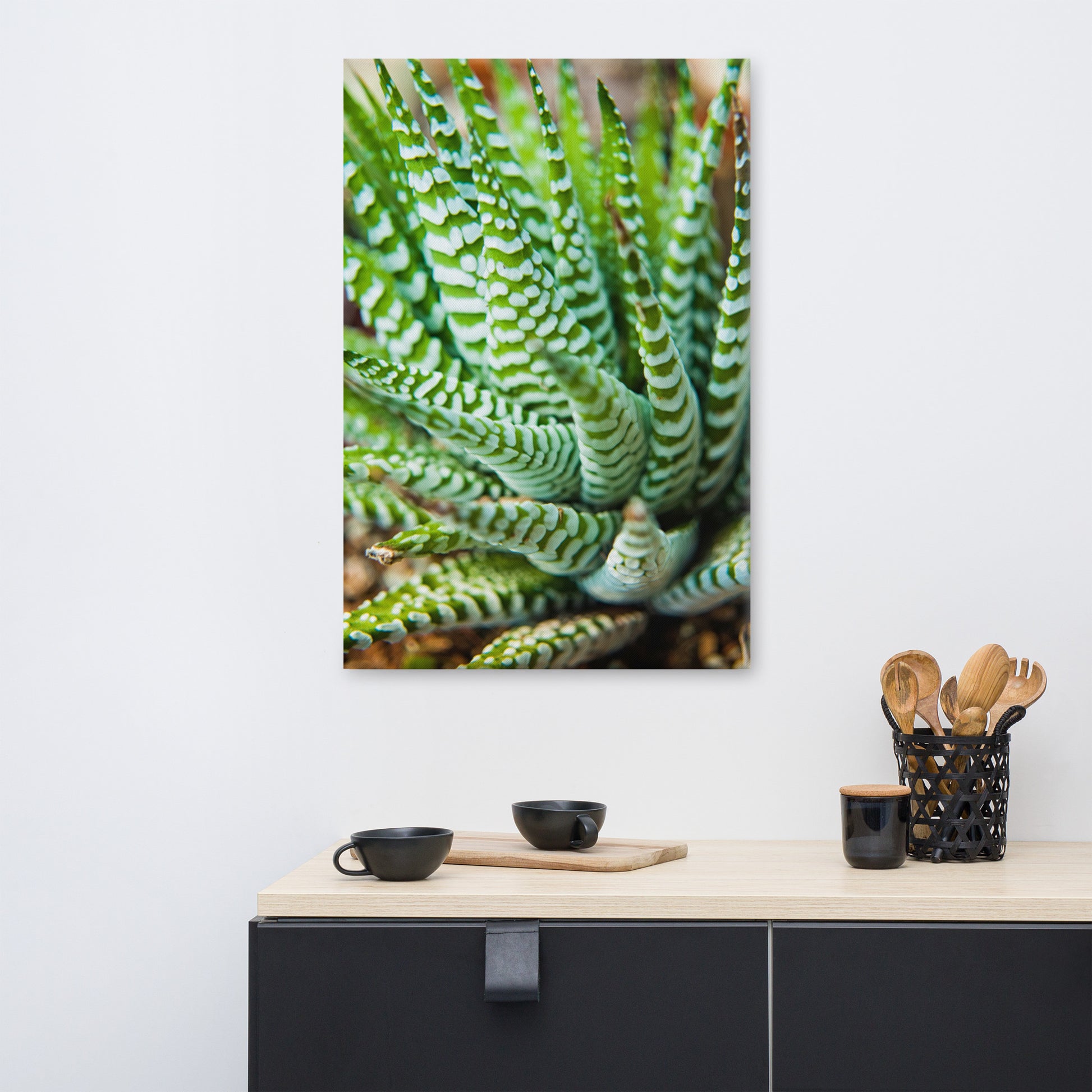 About this rustic home decor wall art: Bring the mesmerizing beauty of nature indoors with this stunning canvas print. This captivating close-up of a succulent plant showcases the intricate patterns and textures of its leaves. The vibrant green hues and delicate white stripes create a visually striking composition that is both calming and invigorating.