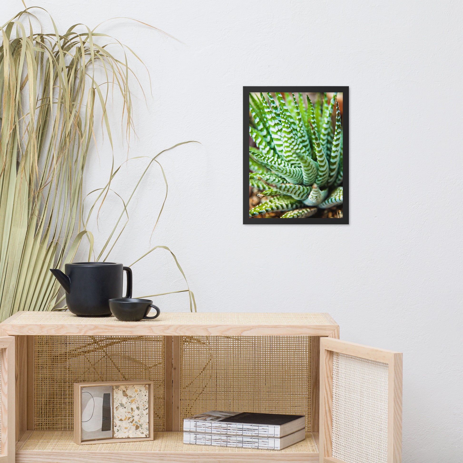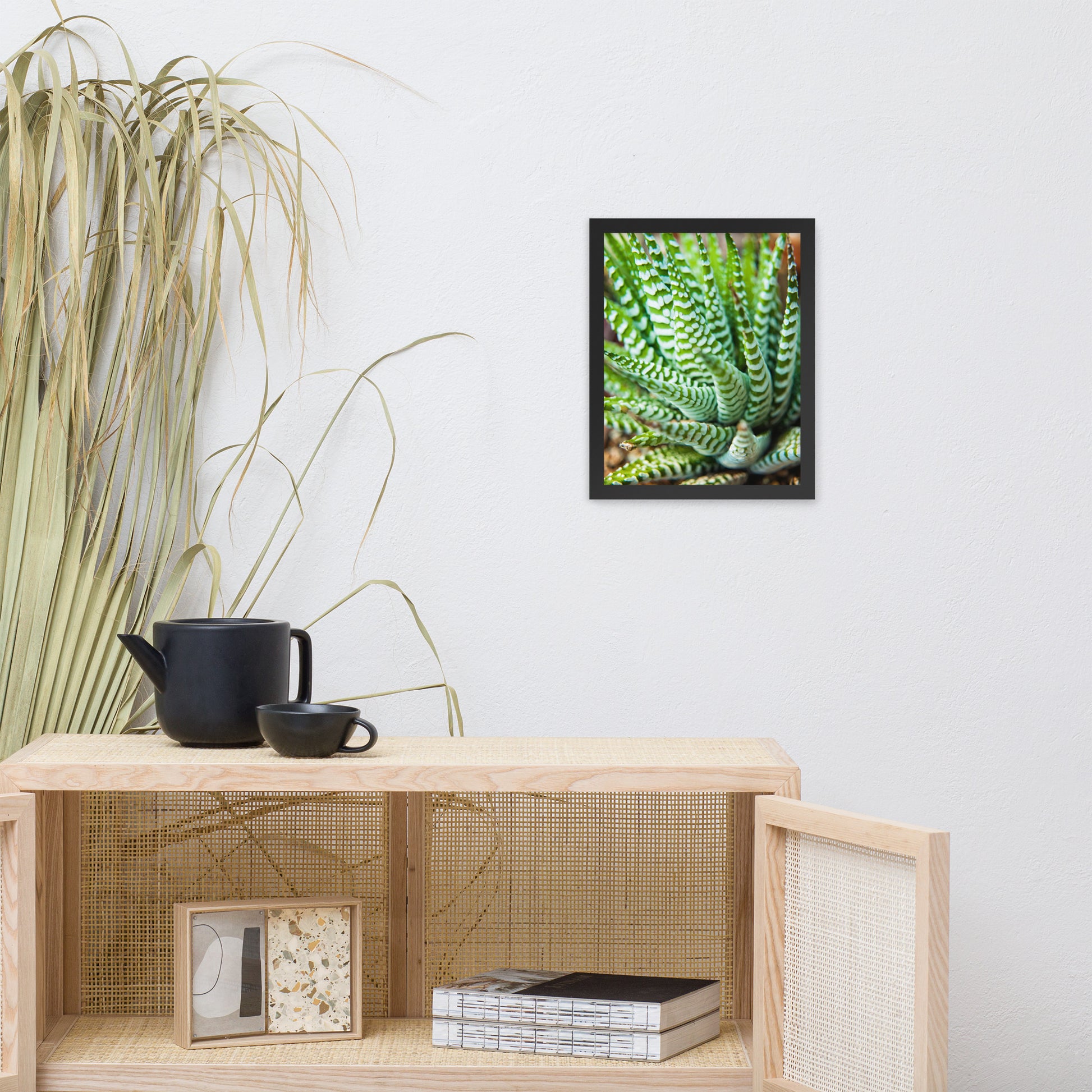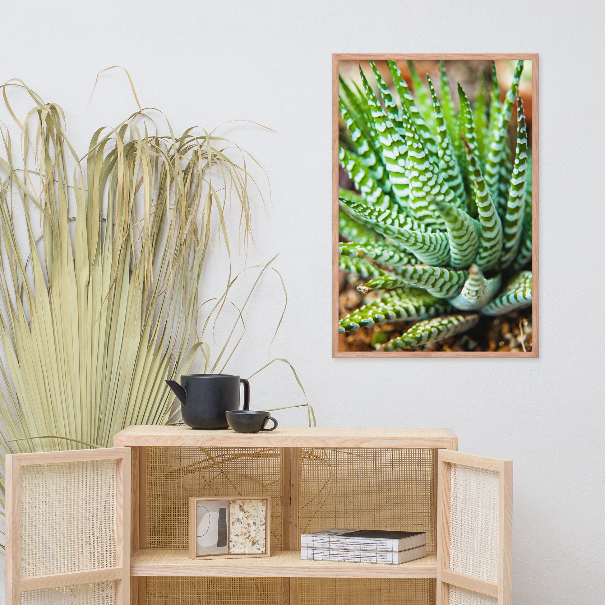 About this rustic style wall decor: Bring the captivating beauty of the natural world into your home with "Succulent 2", a striking framed print that showcases the mesmerizing patterns and textures of this unique succulent. The succulent's vibrant green leaves, adorned with intricate white stripes, create a visually stunning display that is both elegant and eye-catching. The close-up perspective highlights the delicate details of the plant's form, revealing the subtle variations in color and texture that make each leaf a work of art.