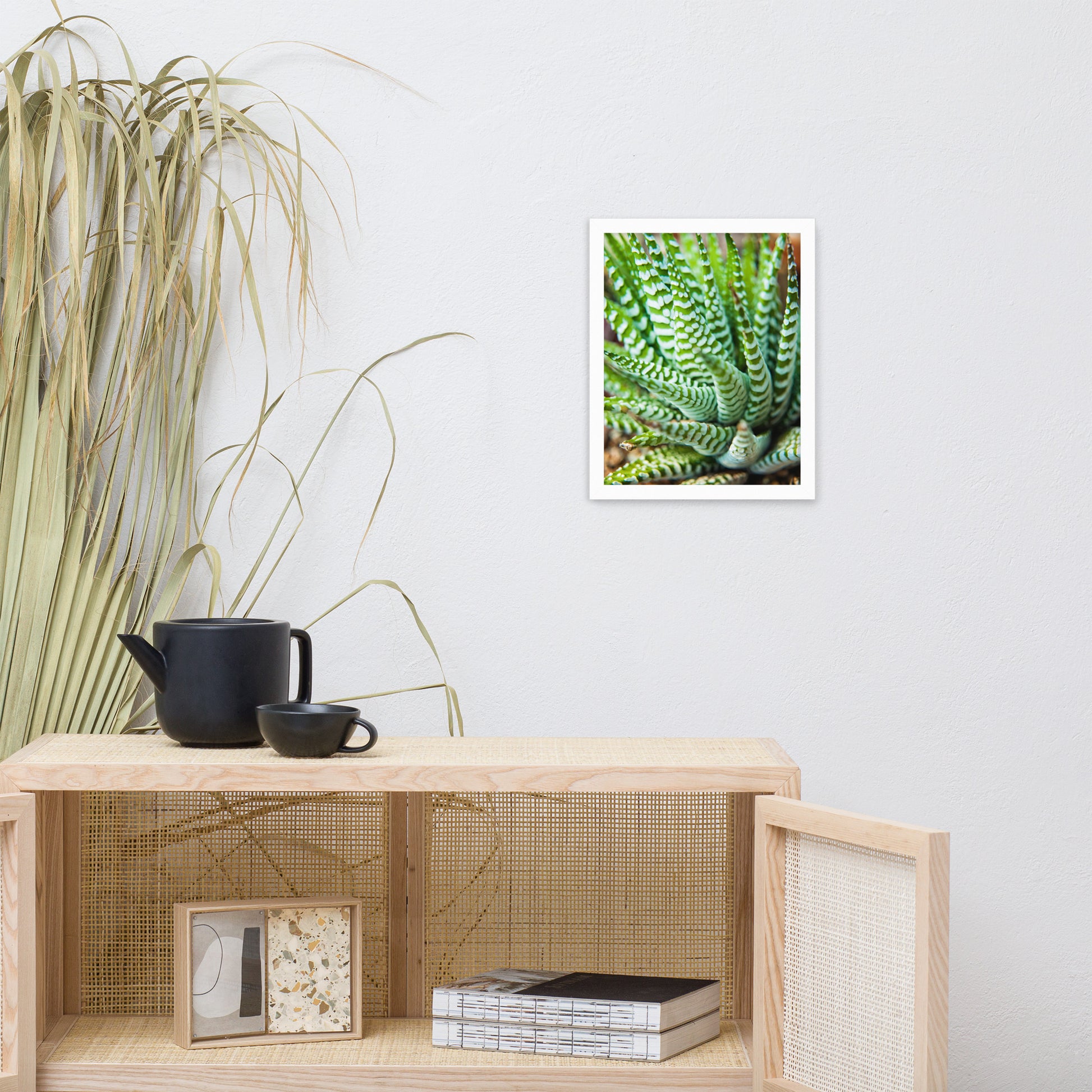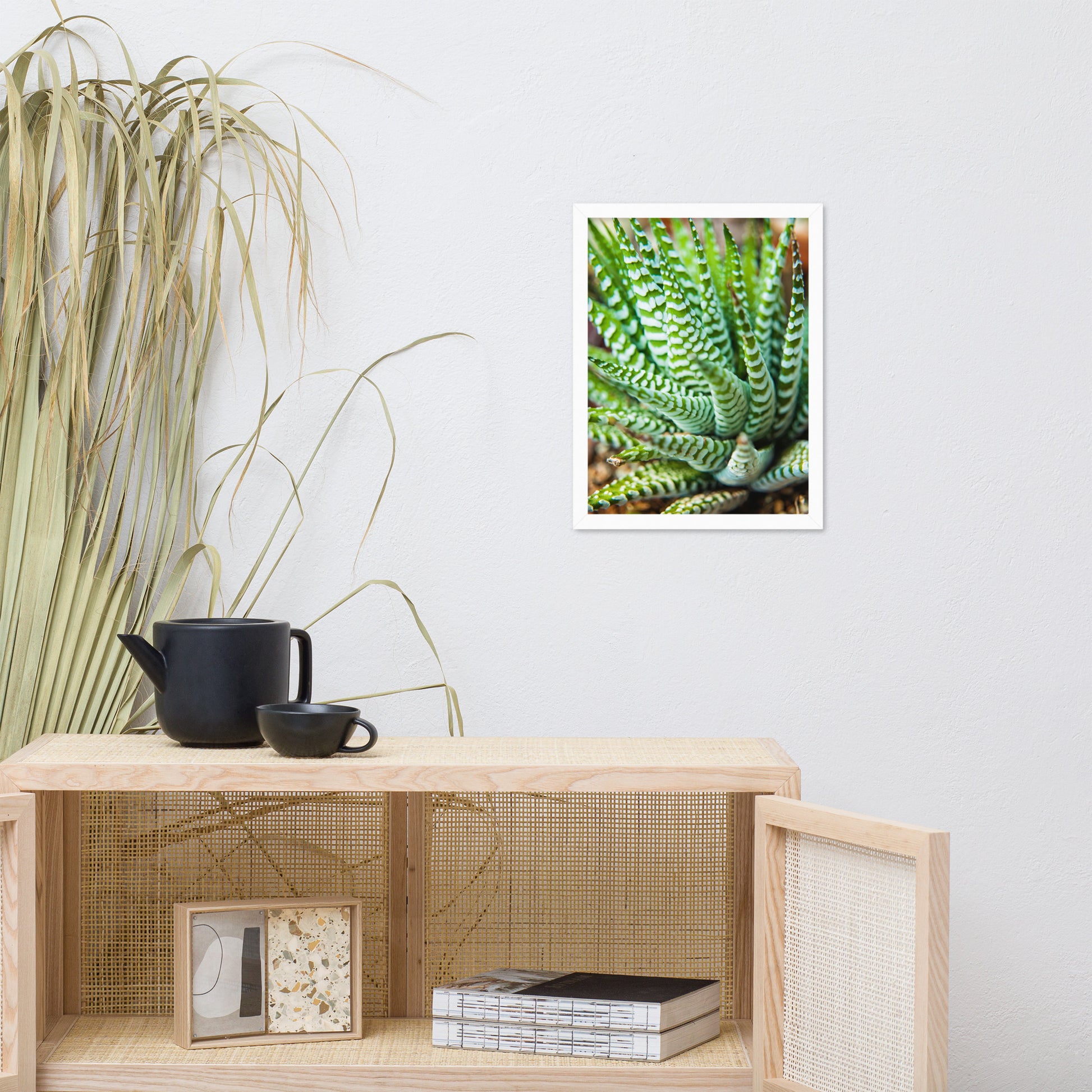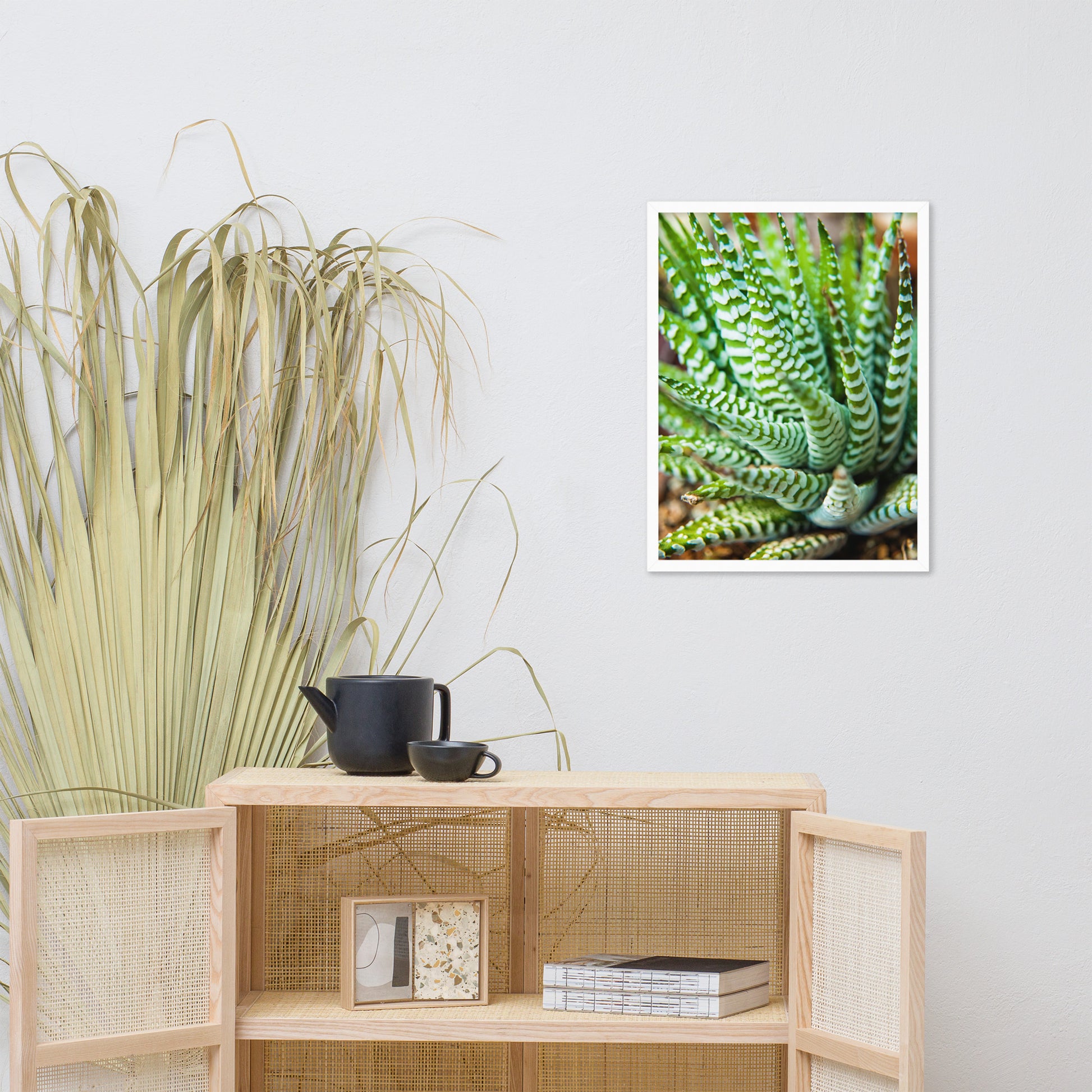 About this rustic style wall decor: Bring the captivating beauty of the natural world into your home with "Succulent 2", a striking framed print that showcases the mesmerizing patterns and textures of this unique succulent. The succulent's vibrant green leaves, adorned with intricate white stripes, create a visually stunning display that is both elegant and eye-catching. The close-up perspective highlights the delicate details of the plant's form, revealing the subtle variations in color and texture that make each leaf a work of art.