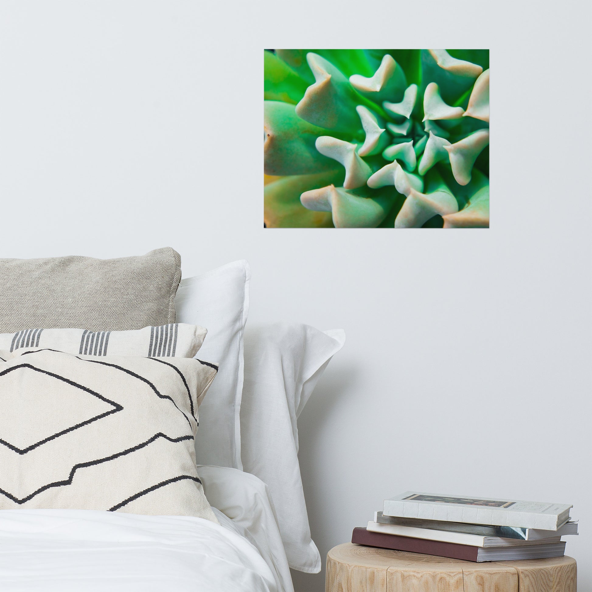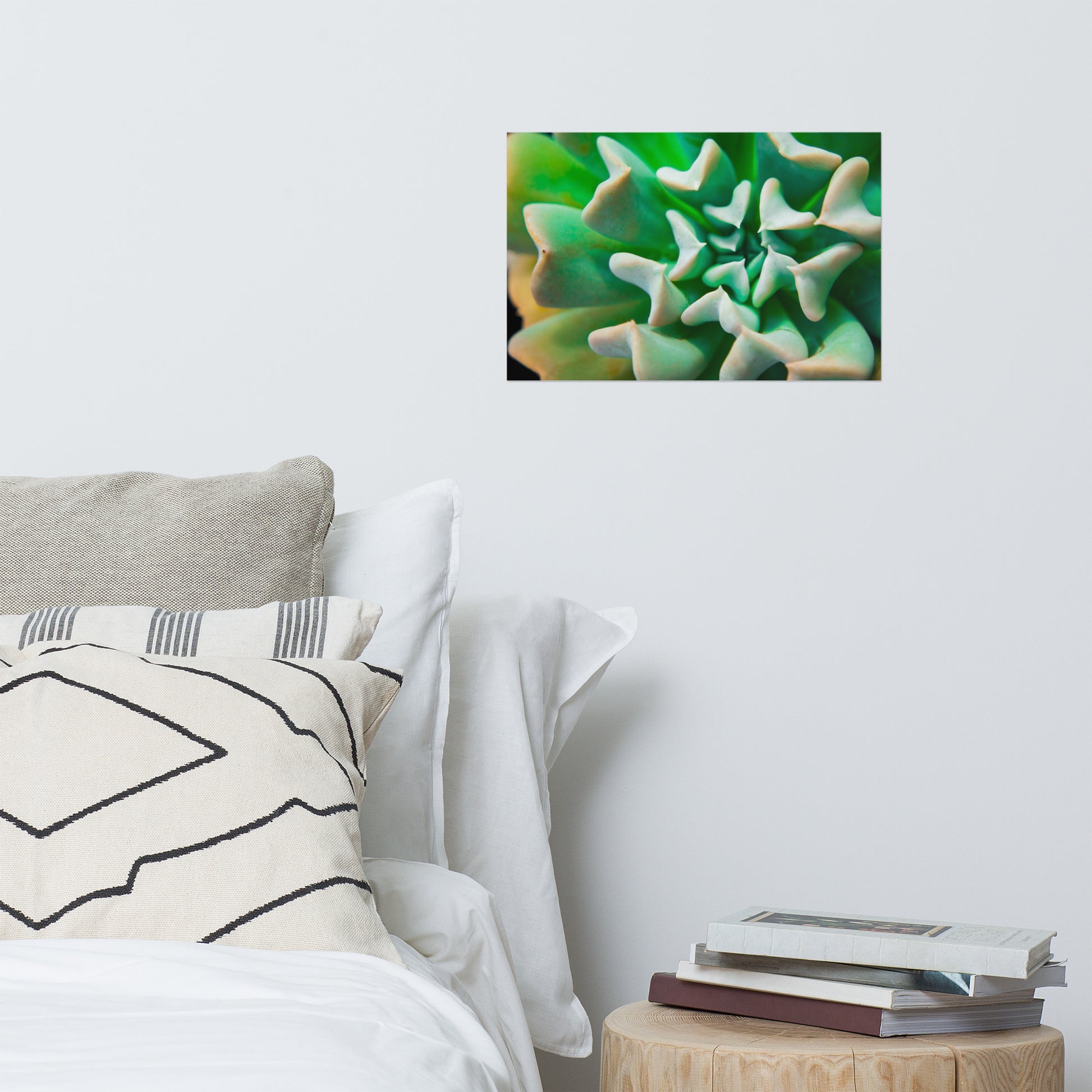 About this rustic hanging wall decor: "Succulent" is a macros (close-up) nature photograph capturing the delicate, green padded petals of a succulent plant. Soft lighting reduces shadows between the heart-shaped petals while showcasing the depth and symmetry of the bloom. This unframed art print is perfect for adding a touch of natural elegance to any space.