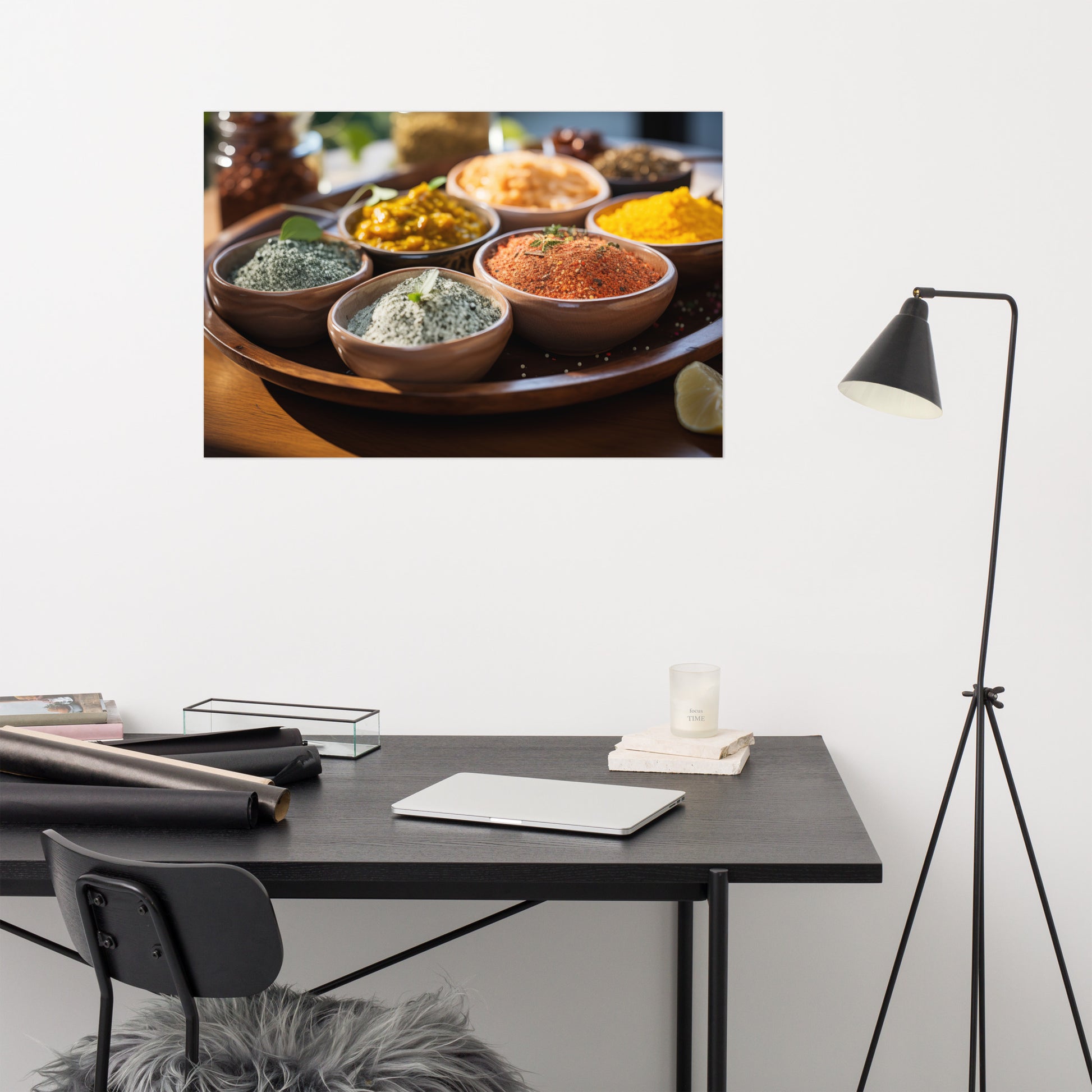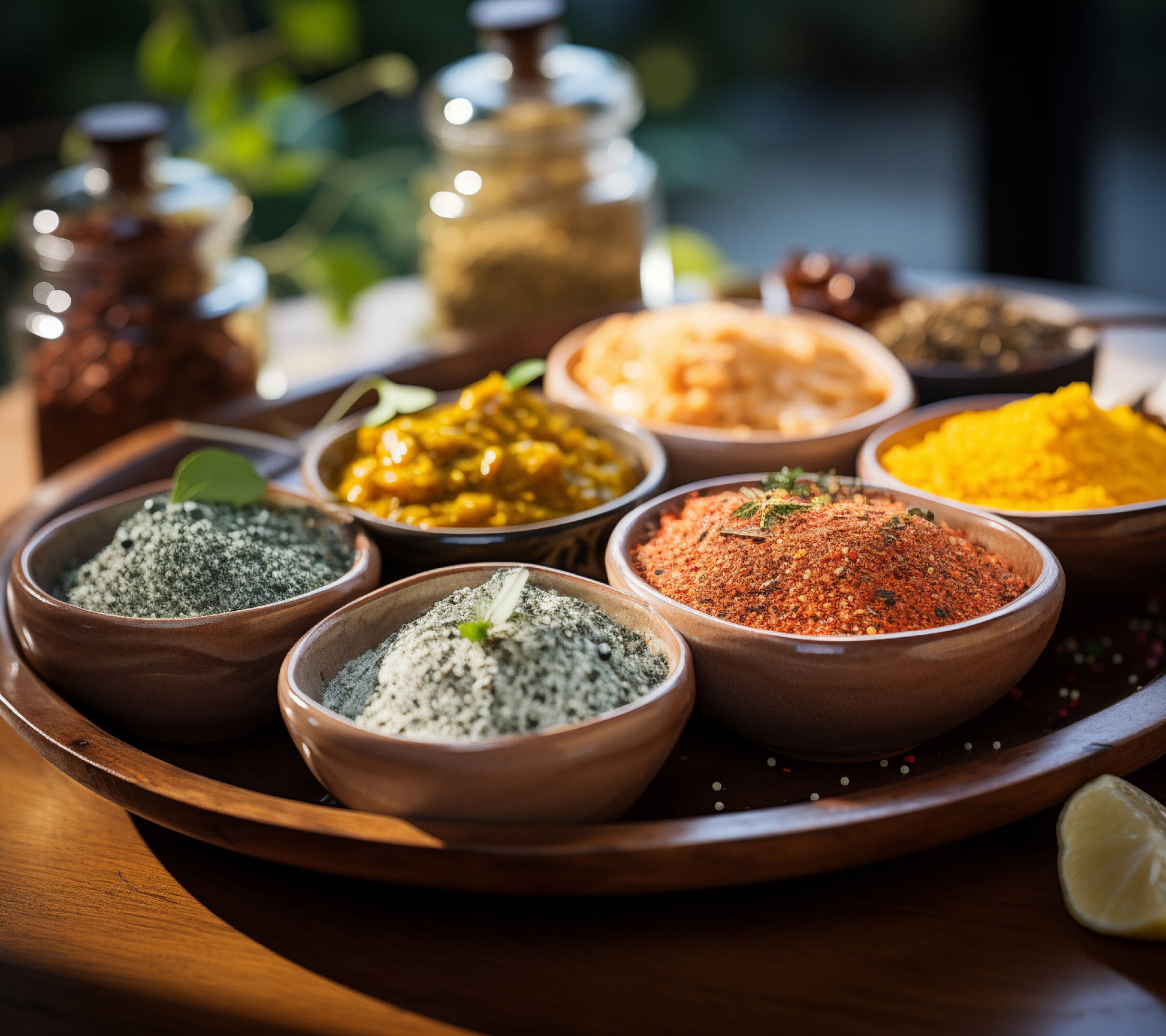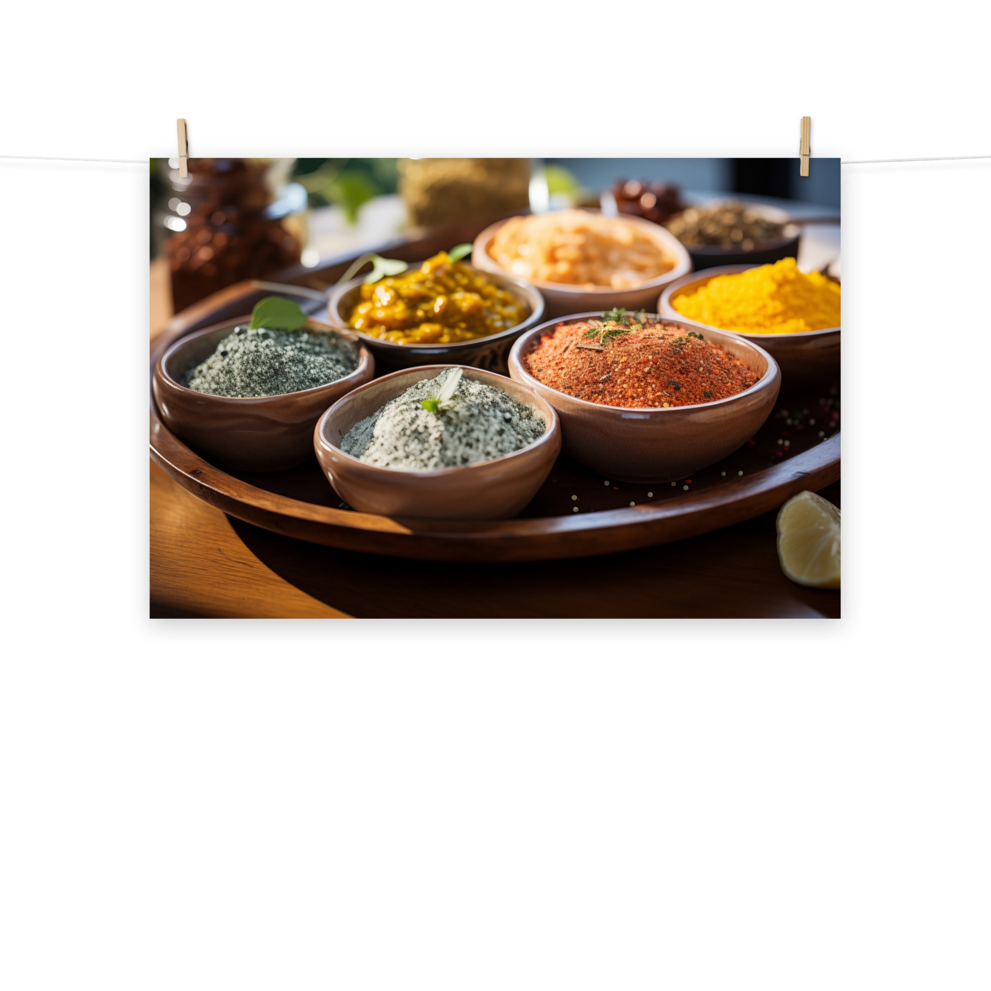 This digitally created photorealistic artwork, "The Art of Seasoning," focuses on the vibrant colors and textures of a variety of spices. Presented in small bowls arranged on a larger wooden tray, the spices are showcased in meticulous detail, from the powdery textures to the varied hues. The warm browns of the wooden bowls contrast with the diverse colors of the spices, which range from deep reds and oranges to earthy greens and yellows. The composition, with its shallow depth of field, draws the viewer's eye to the intricate patterns and subtle variations within each spice. Hints of fresh herbs and a partial lemon slice add a touch of freshness to the scene, suggesting the potential for culinary creativity. The overall effect is one of warmth, richness, and the sensory appeal of cooking.