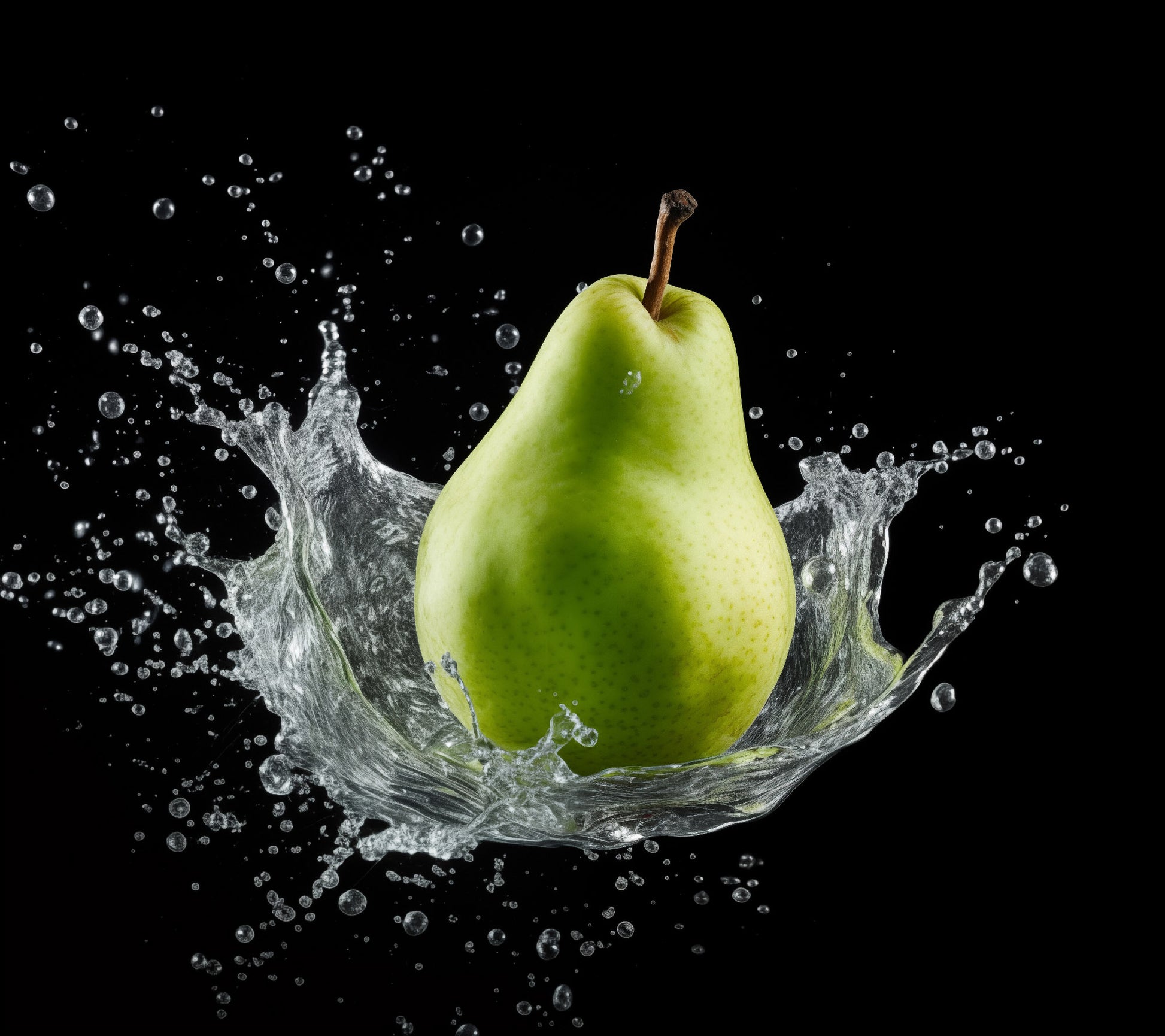 This digitally created photorealistic artwork, "The Crisp Awakening," captures the refreshing essence of a pear amidst a splash of water. The central focus is a perfectly formed pear, its smooth skin rendered in shades of vibrant green, with subtle hints of yellow and brown suggesting ripeness. The pear appears suspended in mid-air, surrounded by a dynamic burst of water droplets and splashes, creating a sense of movement and invigorating freshness. The stark black background accentuates the vibrant colors and highlights the crisp details of both the fruit and the water. The play of light on the water droplets adds a sparkling, almost ethereal quality to the image, enhancing the overall feeling of cool, revitalizing energy. The composition is simple yet striking, celebrating the natural beauty of the fruit and the dynamic energy of the water.