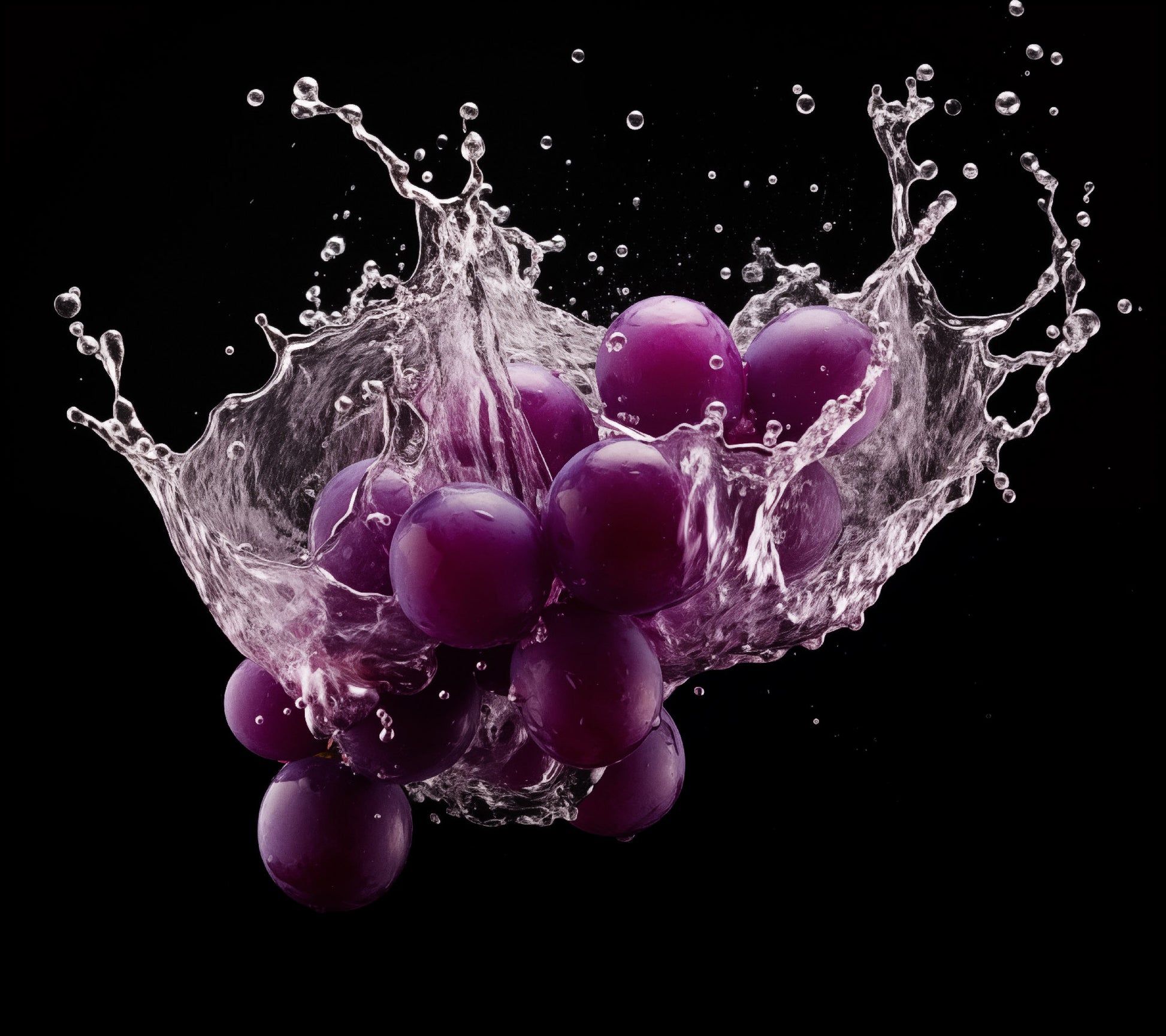This digitally generated artwork, "The Juicy Explosion," captures a dynamic burst of purple grapes frozen in a moment of impact. The cluster of plump grapes, rendered with glistening realism, is the focal point, their smooth skins reflecting light and suggesting a burst of flavor. Encapsulating the grapes is a splash of water, captured mid-explosion with intricate detail. Tiny droplets and shards of liquid radiate outwards, creating a sense of movement and immediacy. The contrast between the deep red of the grapes and the crystal-clear water against the stark black background enhances the drama of the scene. The composition is dynamic and eye-catching, suggesting a moment of intense action and freshness.