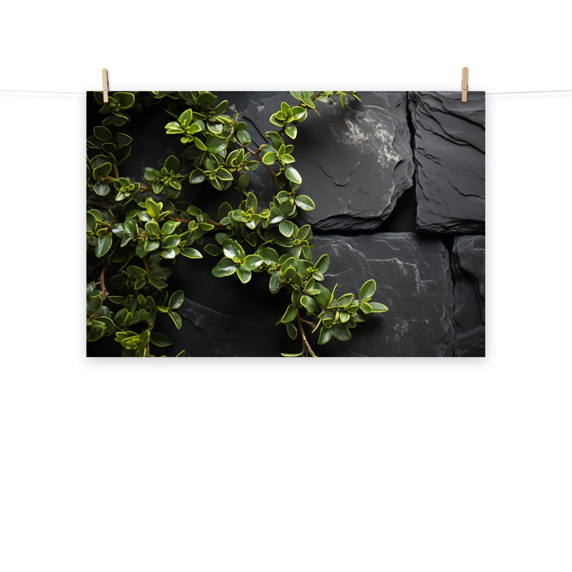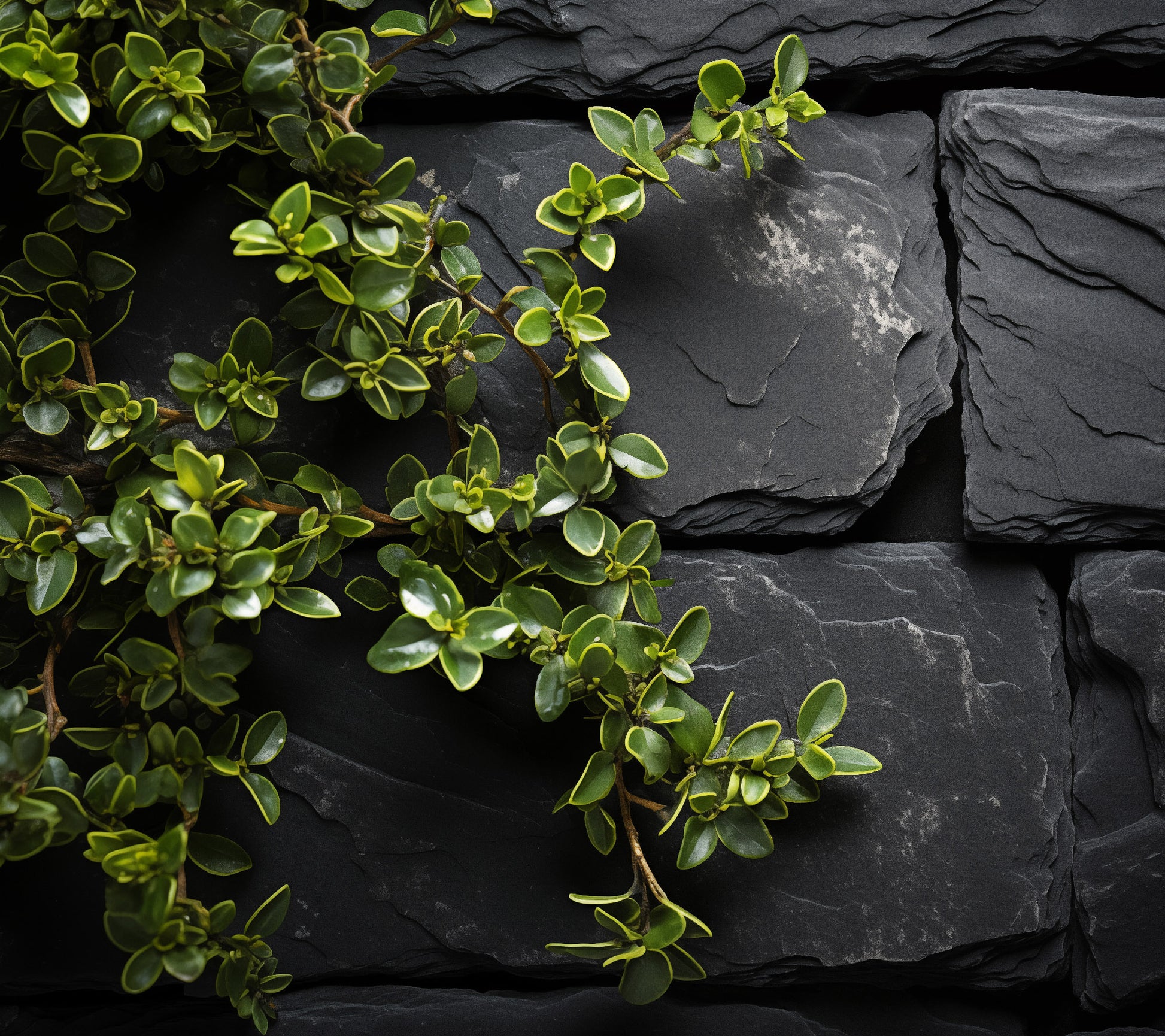 This digitally created artwork, "Thyme's Whisper," presents a photorealistic close-up of vibrant green thyme cascading over a dark, textured stone wall. The image emphasizes the delicate leaves and branching structure of the herb, contrasting its lively texture with the solid, cool tones of the stone. The composition is minimal and focused, highlighting the natural beauty of the thyme against the rugged backdrop.