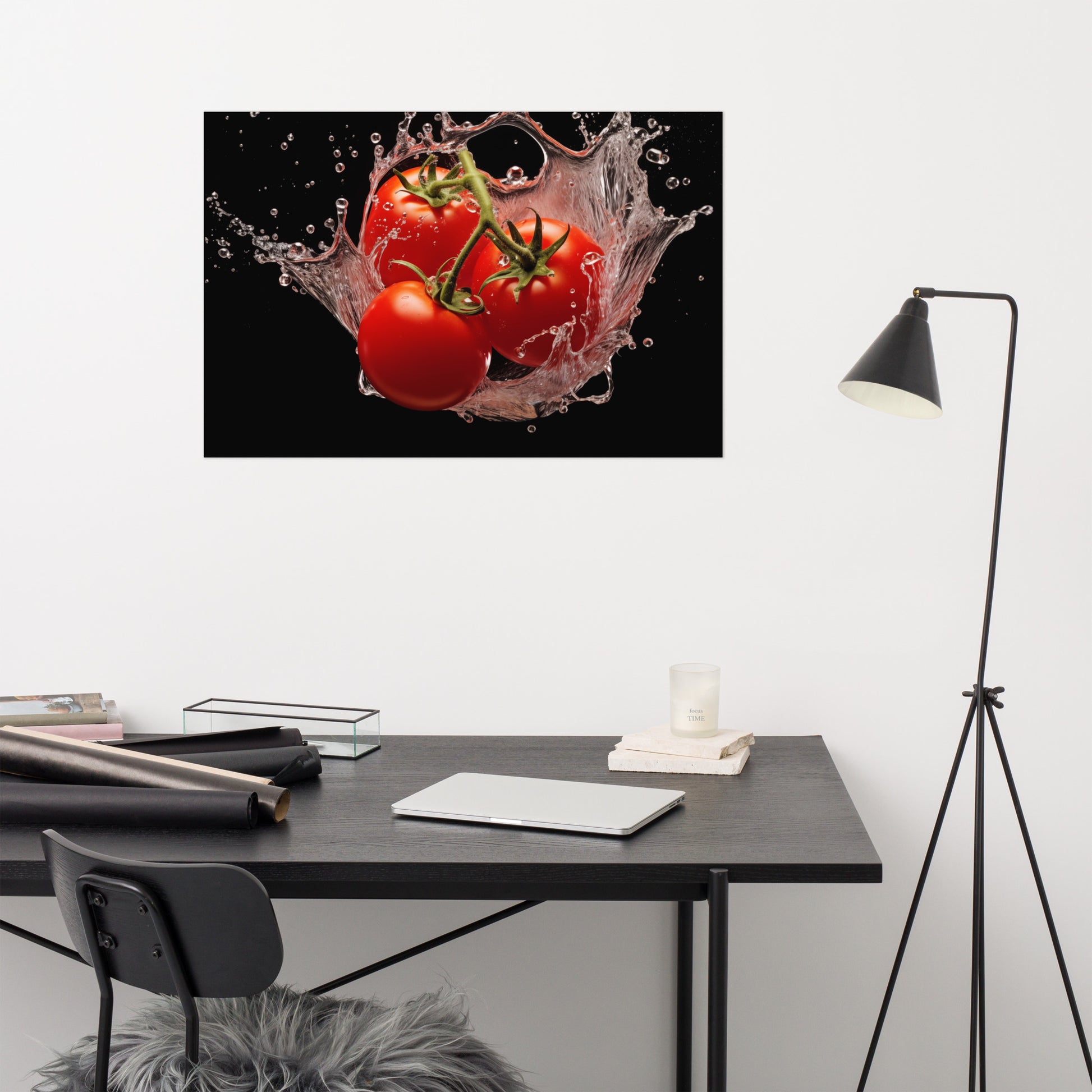 "Tomato Splash" captures the dynamic energy of fresh tomatoes amidst a burst of water, rendered with photorealistic detail against a stark black background. The vibrant red of the tomatoes, contrasted with the clear, splashing water and deep shadows, creates a visually striking and modern composition. The digital artwork focuses on the beauty of simple forms and the interplay of light and texture. Available as an unframed art print, providing flexibility for custom framing.