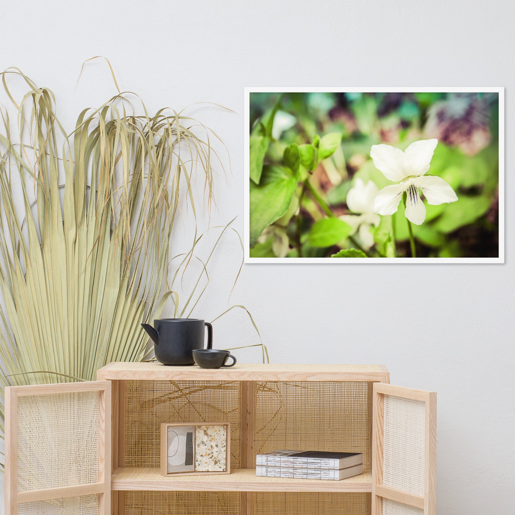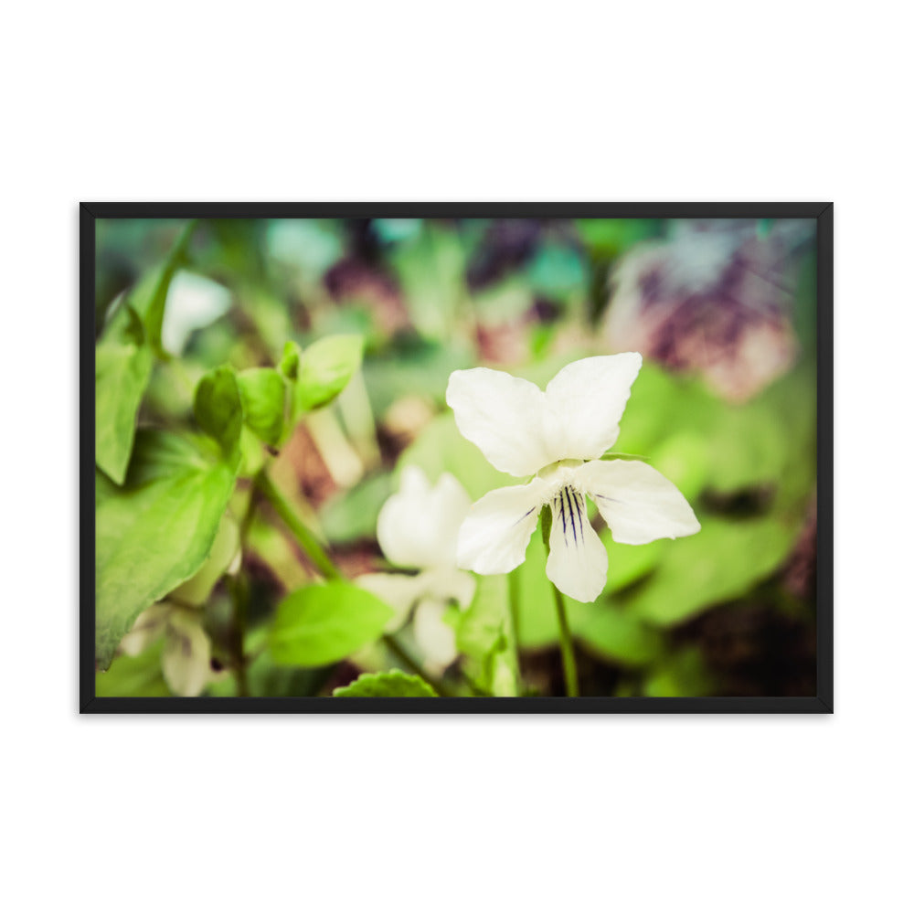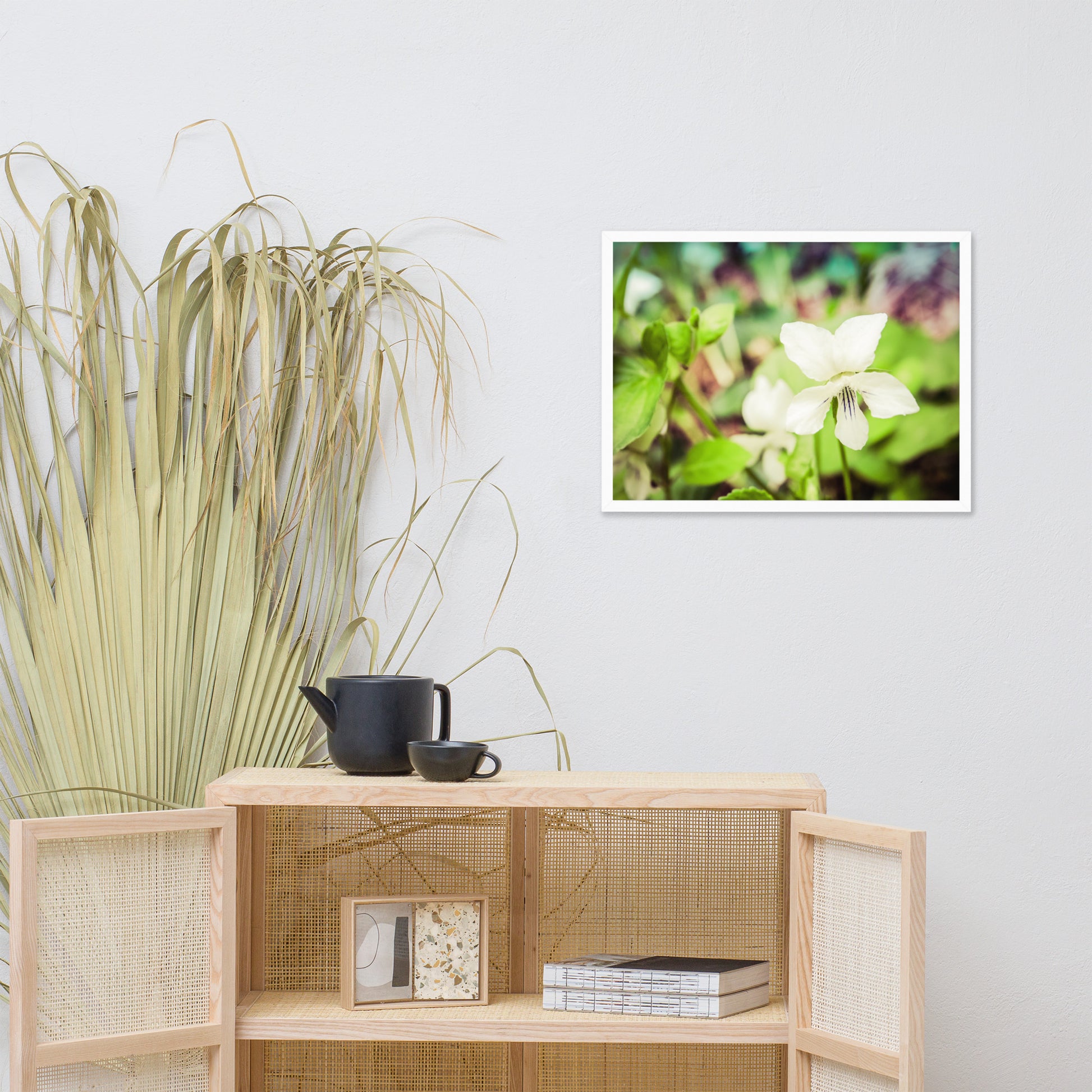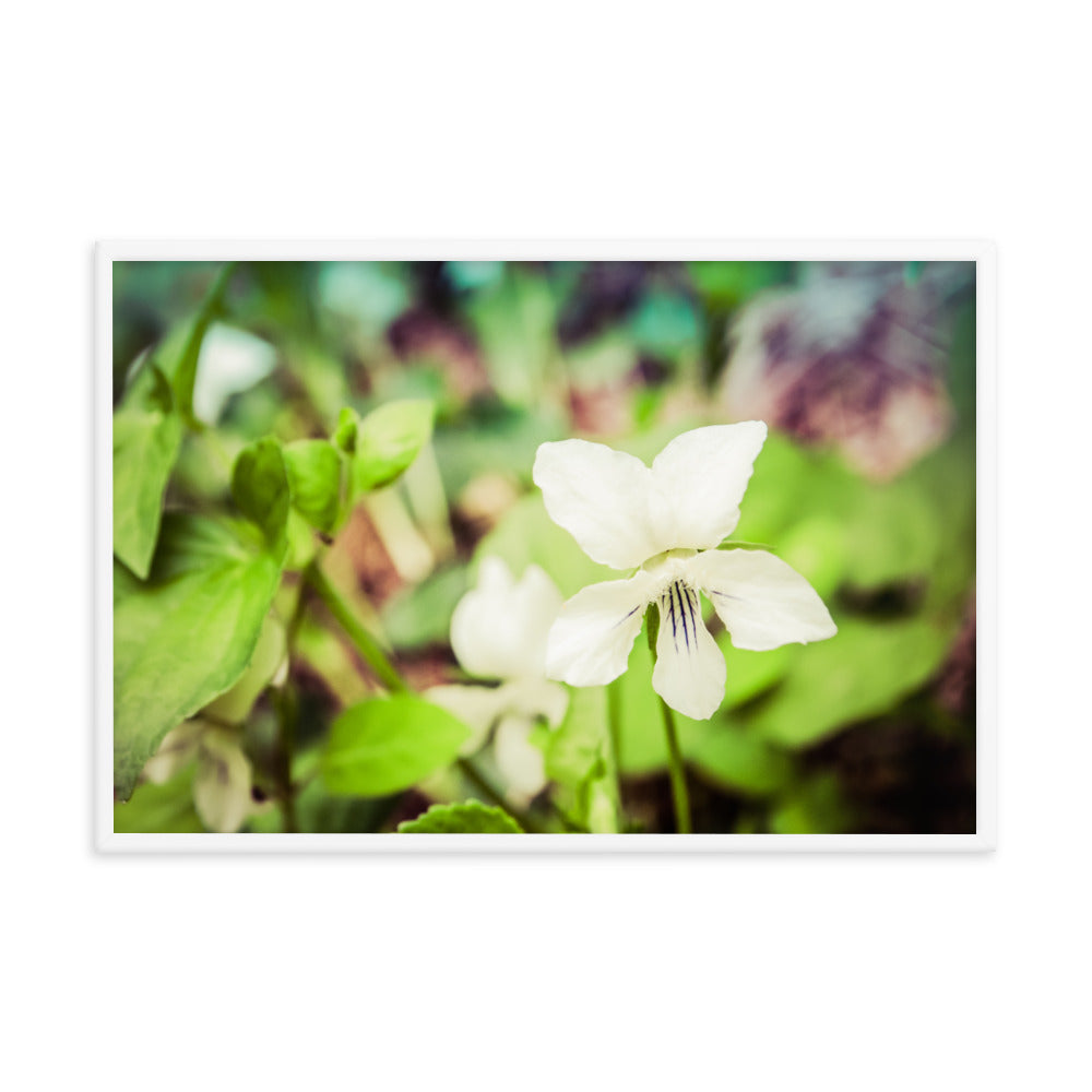 About these floral wall art prints: Bring the soothing essence of nature into your home with our "Tranquil China Violet" print. This captivating photograph captures the delicate beauty of a white violet in full bloom, its soft petals contrasting with the vibrant green foliage. The shallow depth of field and gentle blur create a dreamlike atmosphere, perfect for adding a touch of serenity to any room.