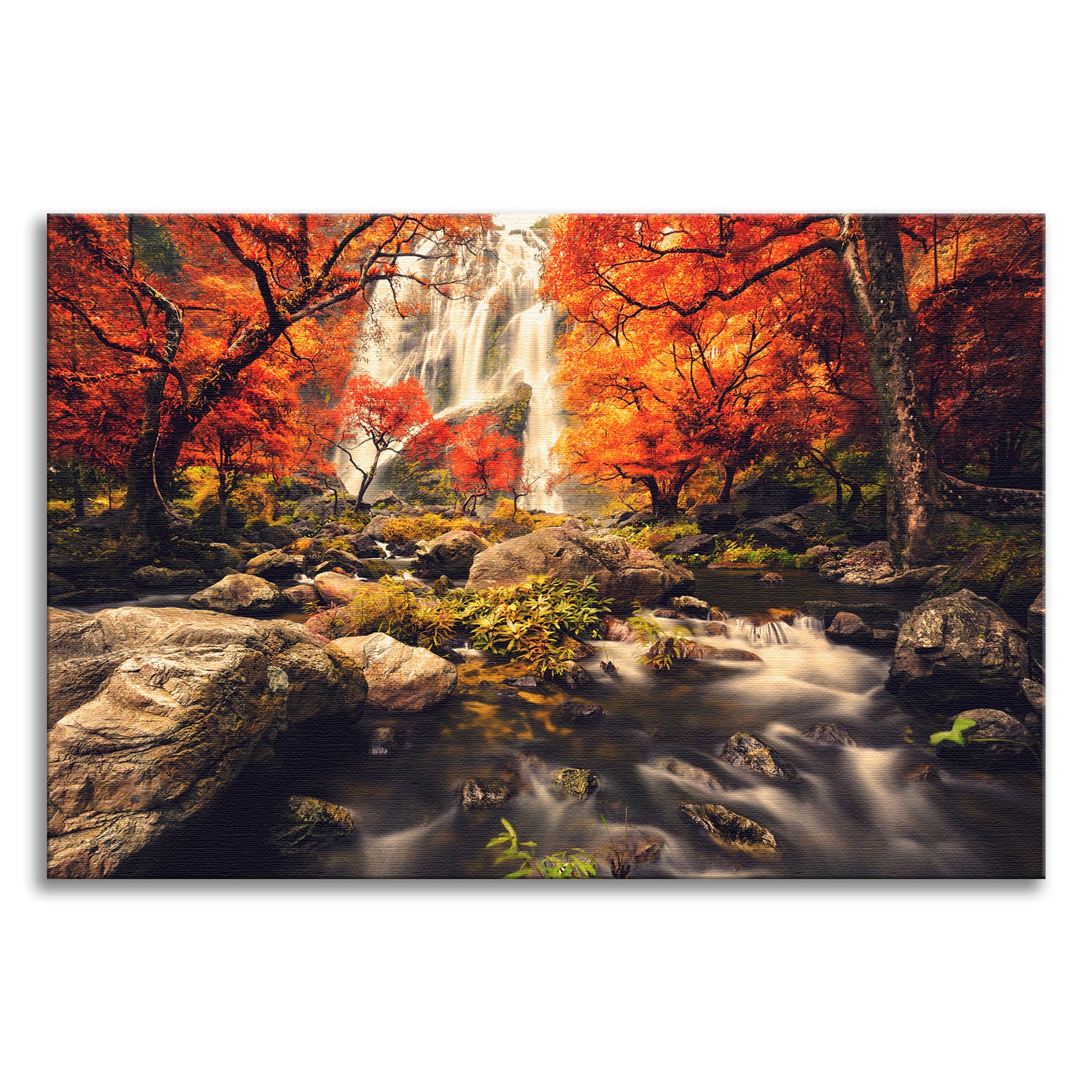 About this rustic orange wall decor: Immerse yourself in the serene atmosphere of a vibrant autumn forest with this captivating canvas print. "Waterfall in the Autumn" captures the breathtaking beauty of a cascading waterfall surrounded by fiery foliage, creating a symphony of colors and textures. The warm hues of red, orange, and yellow contrast beautifully with the cool blue of the water, while the smooth rocks and lush greenery add depth and dimension to the scene.