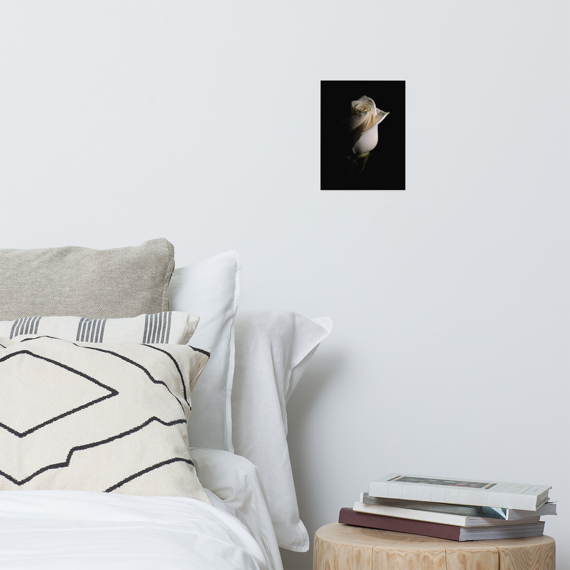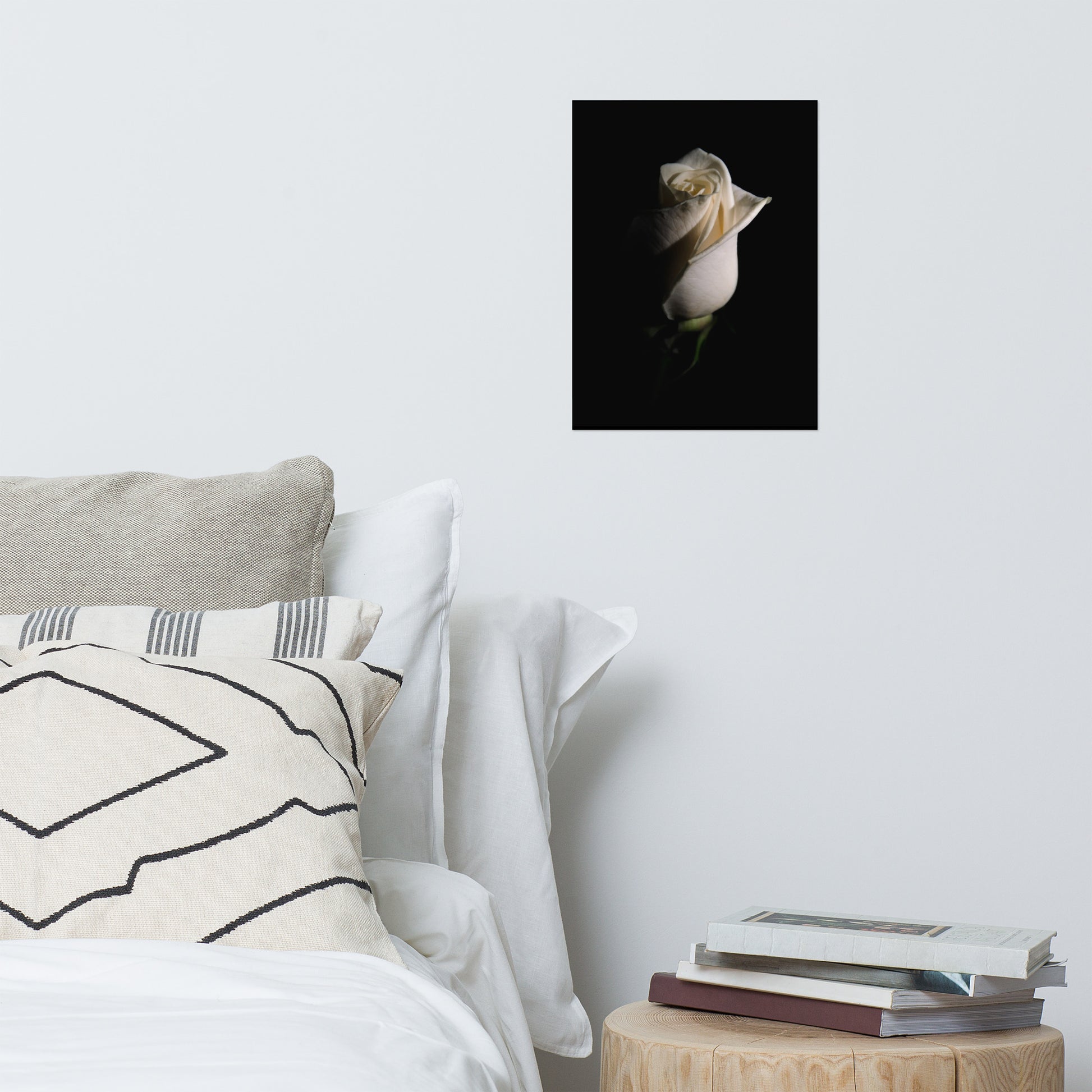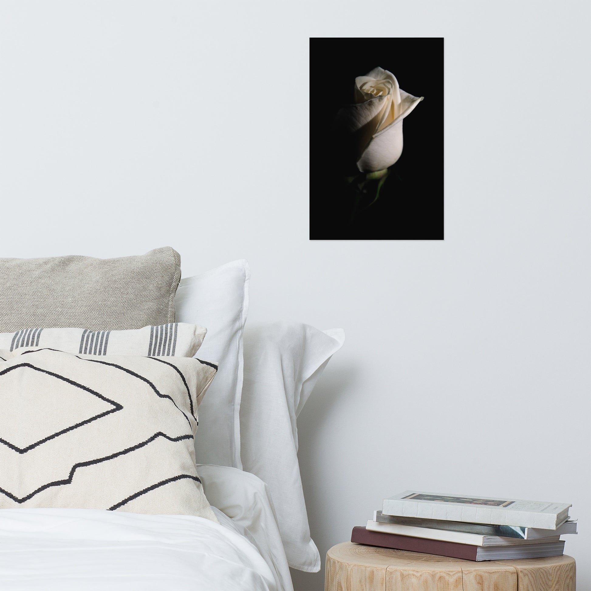 About this modern flower prints: "White Rose Low Key" is a captivating minimal floral photo, perfect for adding a touch of elegance to any space. This studio-created still life photograph showcases the delicate beauty of a single white rose in full bloom, set against a dramatic black backdrop. The low-key lighting emphasizes the flower's graceful curves and the simplicity of its form, creating a striking visual statement. Printed on high-quality photo paper, this unframed print allows you to easily customize your display and create a truly unique piece of art.