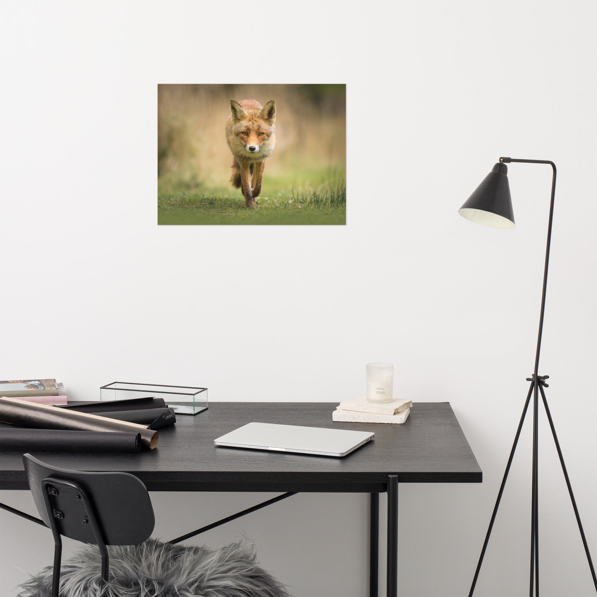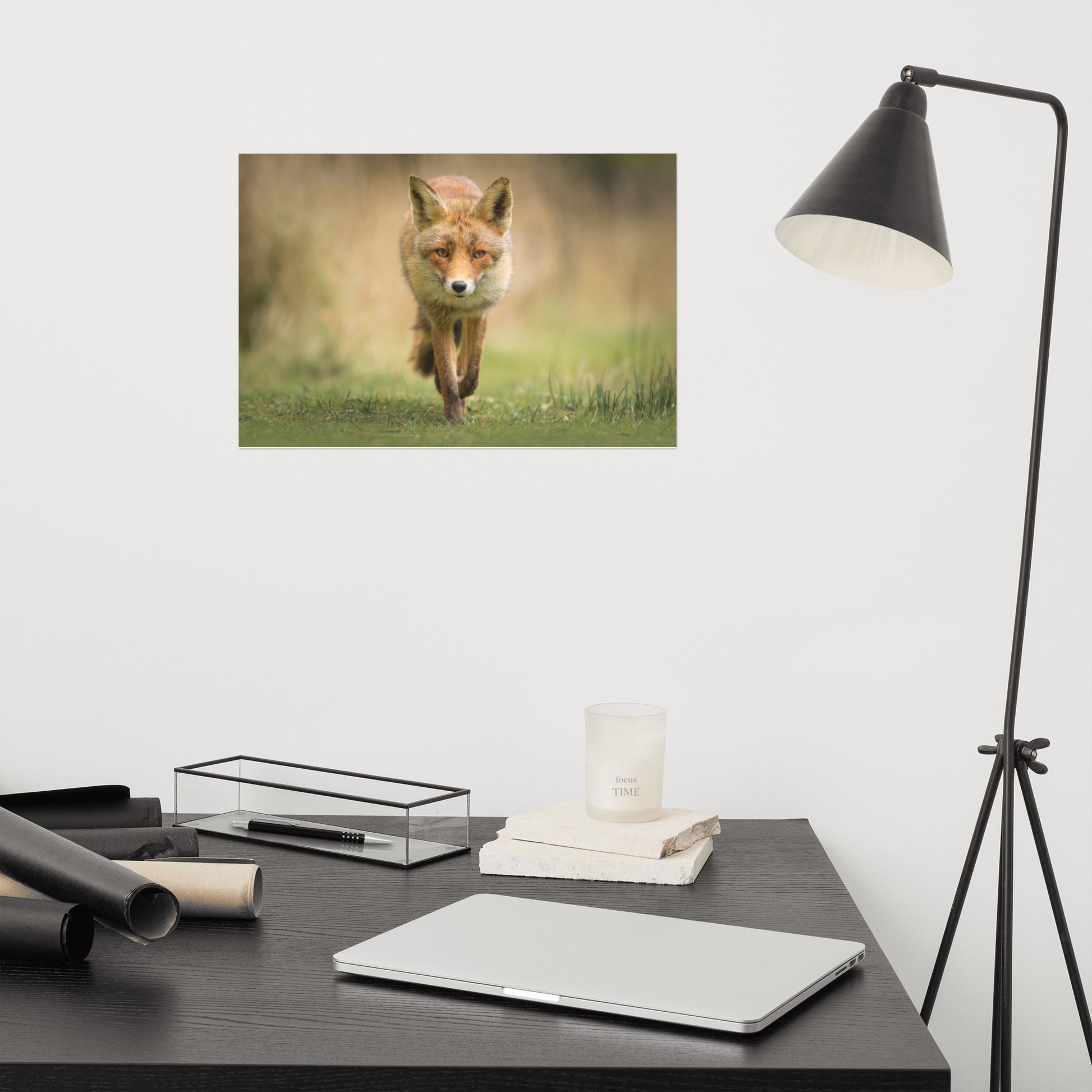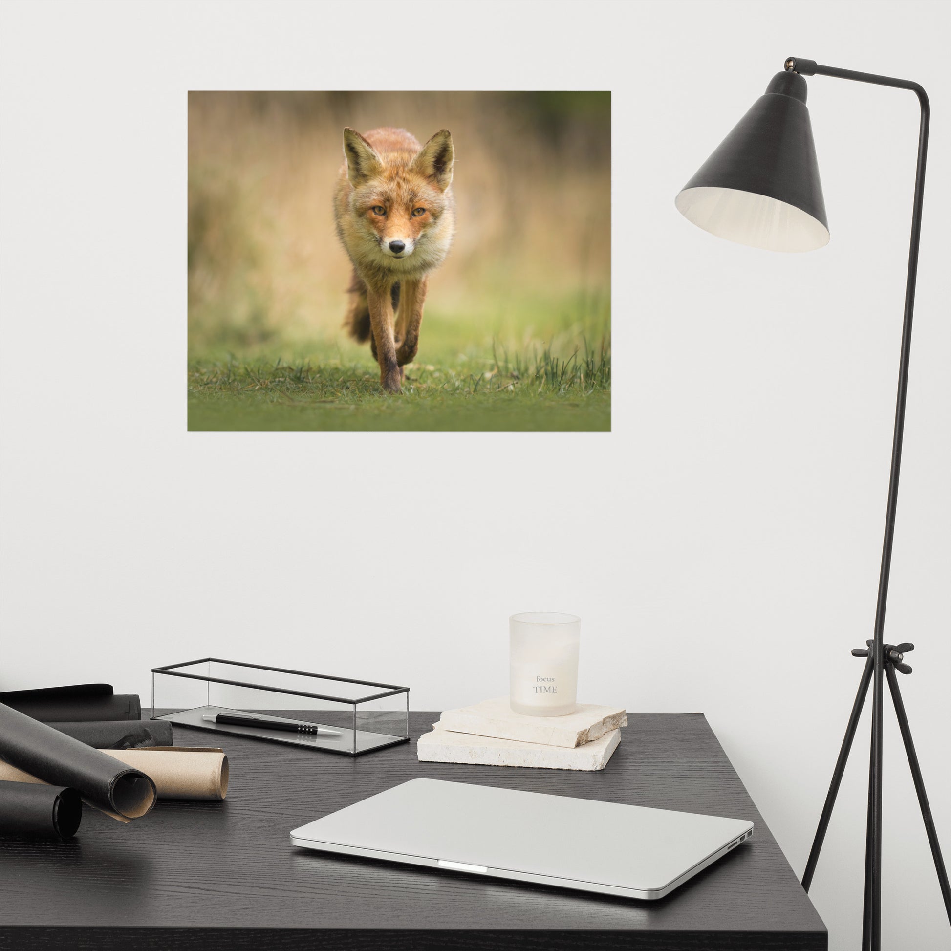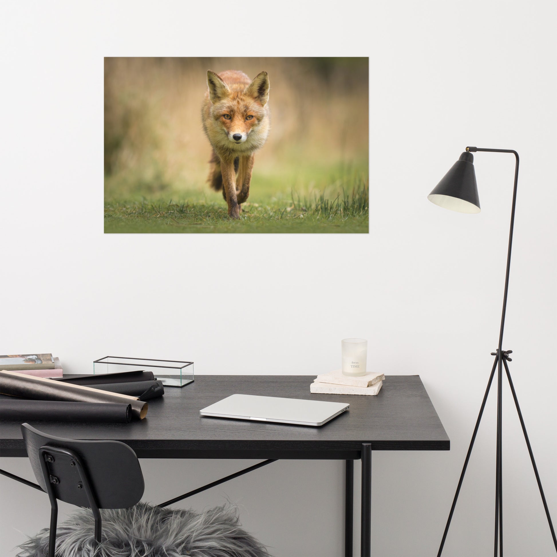 About this wall art rustic farmhouse style photograph: The photograph showcases a young red fox, a captivating creature known for its vibrant fur and piercing gaze, walking gracefully through a lush green meadow. The fox, in its natural habitat, seems unaware and unaffected by the presence of the lens, resulting in a picture that is as authentic as it is beautiful.