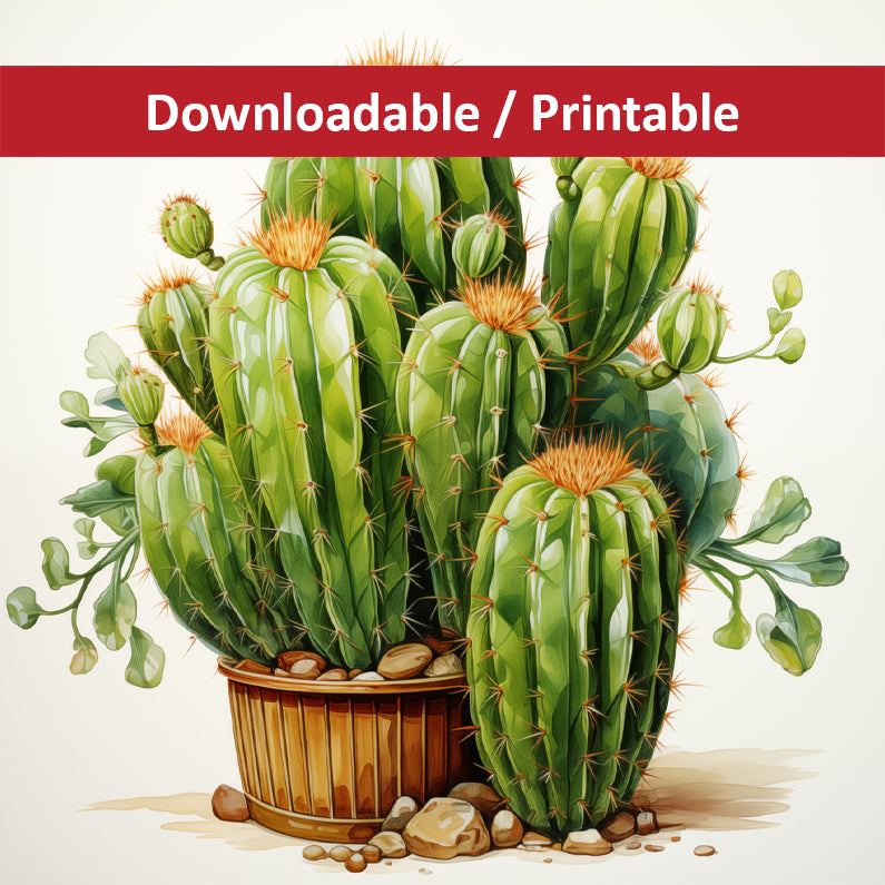 This printable artwork offers the look and feel of a traditional colored pencil illustration, making it a perfect addition to any space seeking a touch of artistic warmth and botanical beauty. The fine details and gentle hues bring the cacti to life, adding a tranquil and inviting atmosphere to your decor.