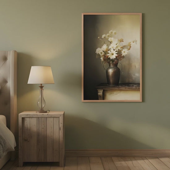 "A Moment of Bloom" is a mesmerizing digitally created artwork that captures the dramatic elegance of a classic still life. The piece features a lush, creamy white floral bouquet with star-petaled blooms, contrasted by subtle accents of earthy terracotta and amber-colored dried foliage. These flowers are held in a beautiful, aged bronze-toned vase with a rich patina. The artwork employs a subdued photorealism style, utilizing strong, chiaroscuro lighting that casts a soft, warm glow from above, intensifying the moody depth of the background. The overall effect is one of timeless sophistication, making it perfect for interiors ranging from Dark Academia to Transitional styles. This piece comes professionally framed in a substantial frame that complements its vintage aesthetic and includes all necessary hanging hardware for immediate and secure display.