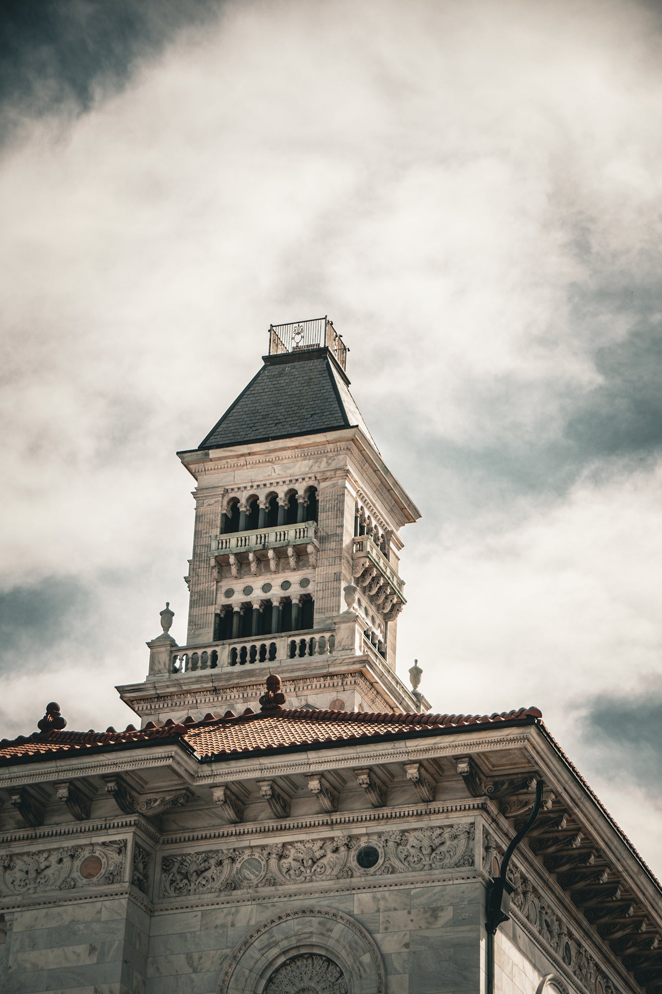 About this building photography art: A multi-color minimal photograph of the 150-foot marble bell tower, architectural corbels along the roof line, and some of the rich ornaments on the façade of the Tomochichi Federal Building. The photo was taken from the corner of W. York St and Whitaker St. in Savannah Georgia. The tower, rising from the north center of the original 1899 Tomochichi Federal Building still remains. "Designed in the Second Renaissance Revival style, the original portion of the building is constructed entirely of white Georgia marble, and features the typical Italianate tripartite façade divisions characteristic of the style." A subtle warm abstract color filter and other filters were added to create more artistic drama in the picture.
