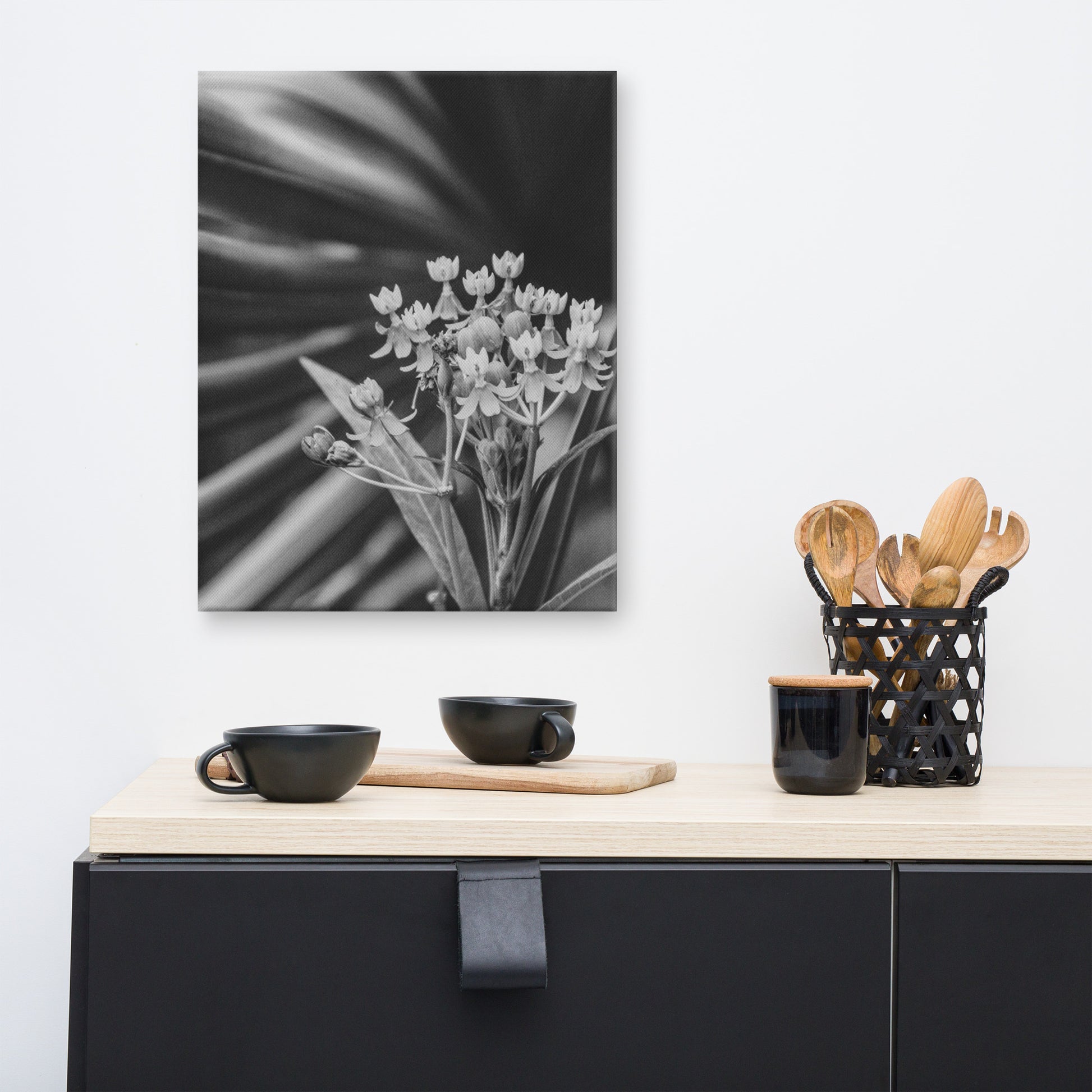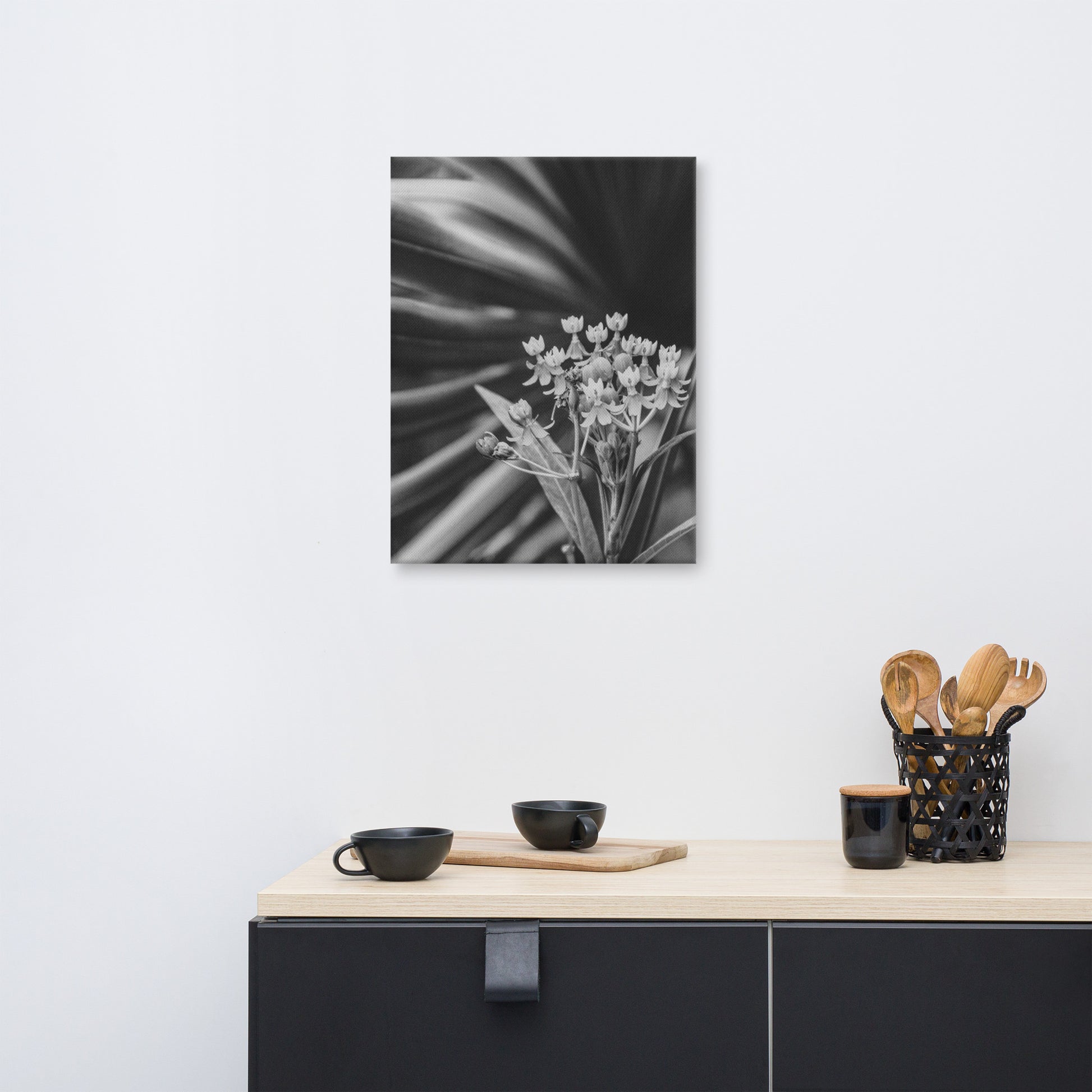 About this vintage floral canvas: Bloodflowers and Palm is a striking black and white nature photograph that captures the dramatic contrast and delicate beauty of a Bloodflower in full bloom set against the textured backdrop of a Fan Palm. Originally shot in color, the image was transformed into a high contrast black and white masterpiece, further enhanced by an abstract grain effect that adds depth and intrigue. This vintage-inspired canvas print evokes a sense of timeless elegance and botanical allure, making it a captivating addition to any space. This image is also available in color.
