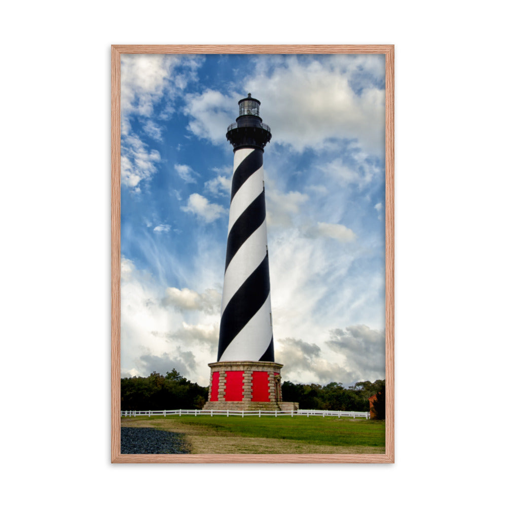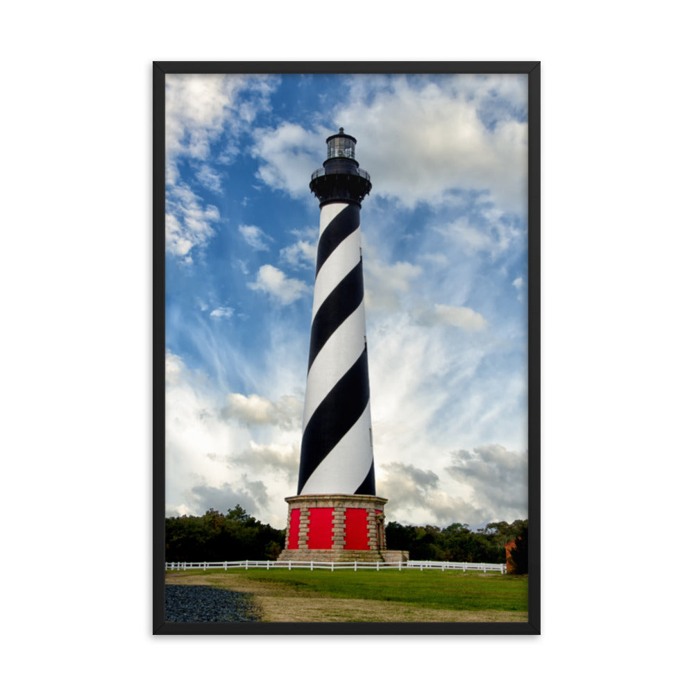 About this nautical framed wall art: Bring the timeless allure of the coast into your home with this stunning framed wall art print. "Cape Hatteras Lighthouse" captures the majestic beauty of one of America's most iconic lighthouses, standing tall against a backdrop of dramatic clouds and endless blue skies. The bold black and white stripes of the lighthouse create a striking visual contrast, while the surrounding greenery adds a touch of natural serenity.