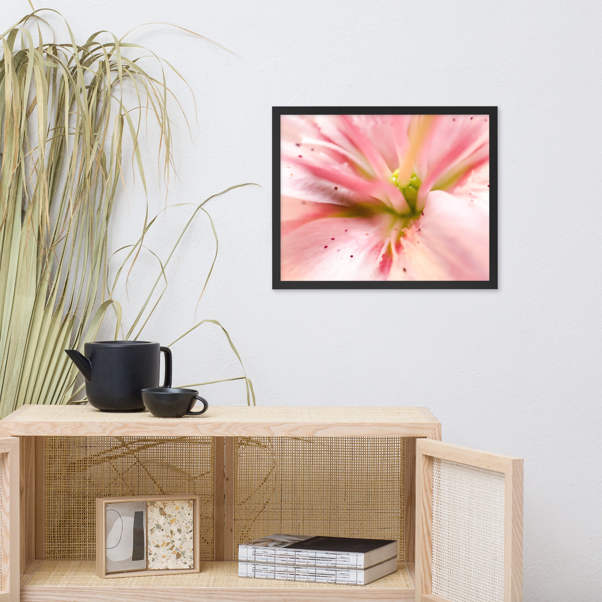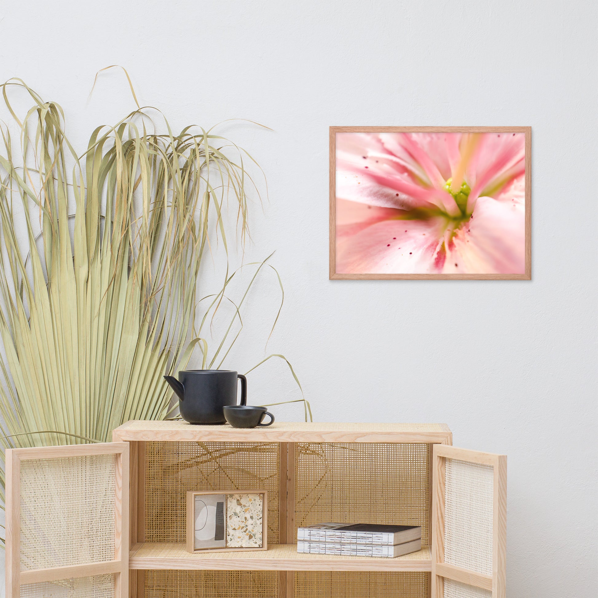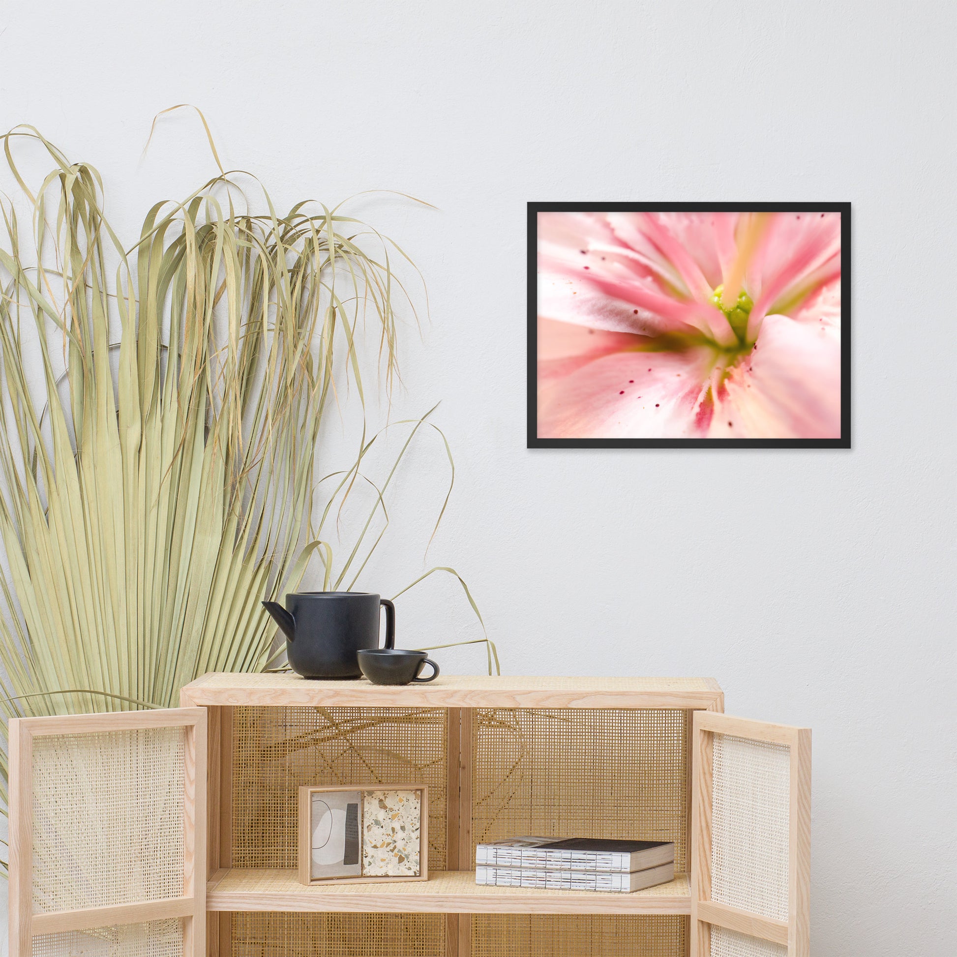 About this minimalist floral wall art: Transform your space into a serene oasis with this exquisite framed print, showcasing the intimate heart of a Stargazer Lily. The delicate pink petals unfurl in a graceful embrace, revealing the intricate details of the flower's reproductive organs.