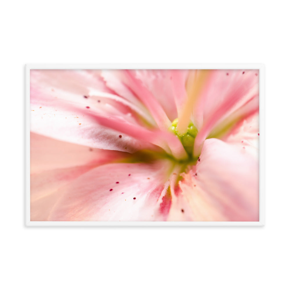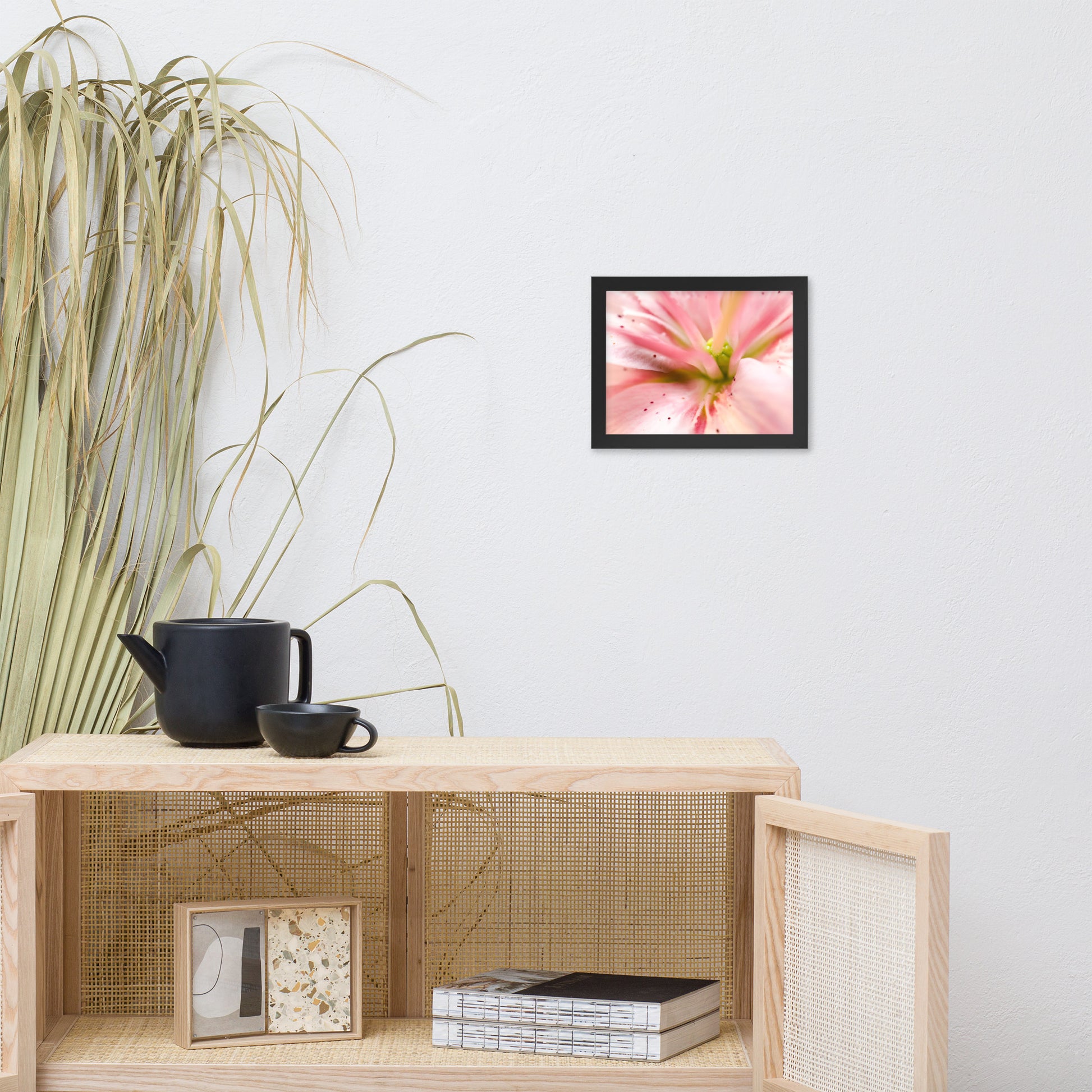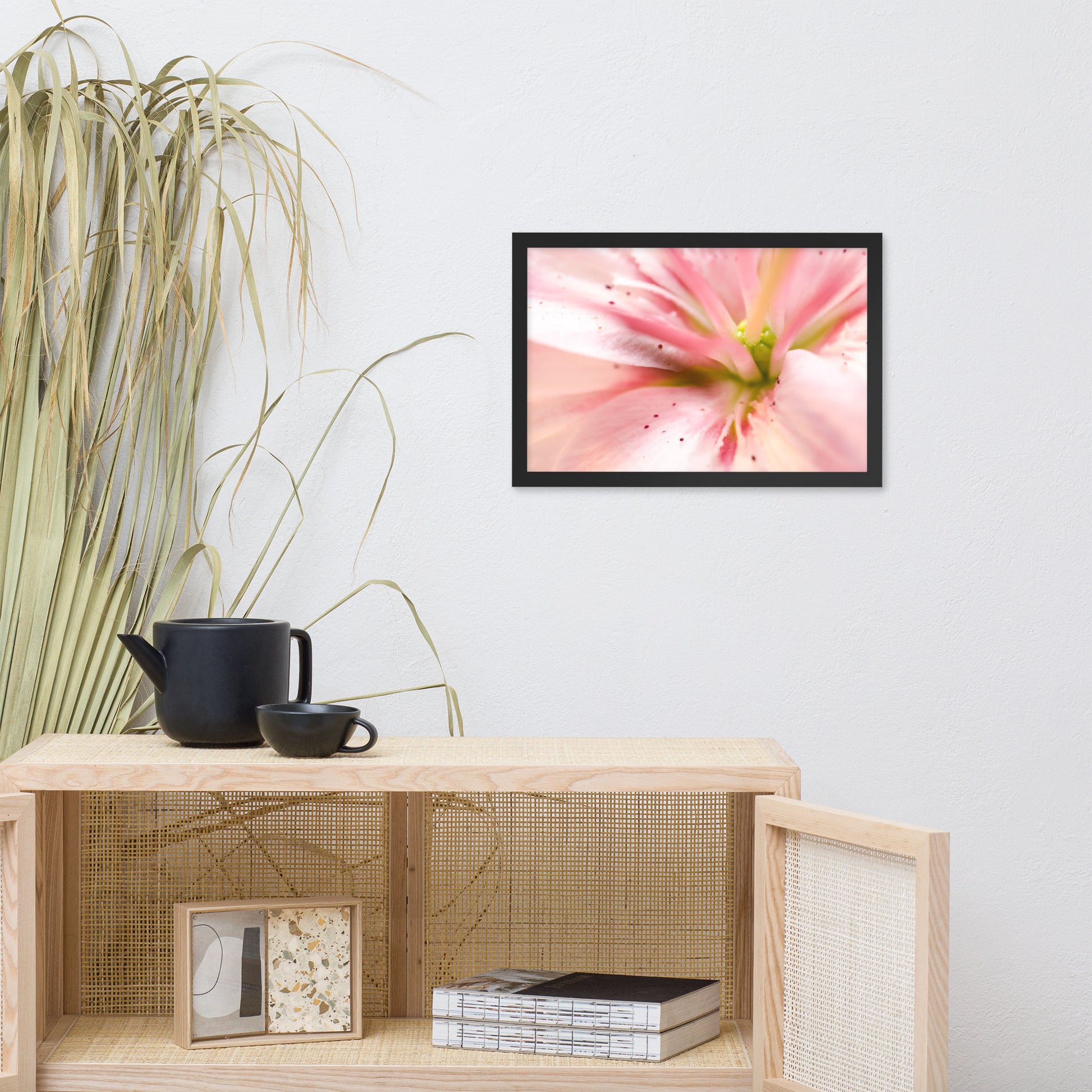 About this minimalist floral wall art: Transform your space into a serene oasis with this exquisite framed print, showcasing the intimate heart of a Stargazer Lily. The delicate pink petals unfurl in a graceful embrace, revealing the intricate details of the flower's reproductive organs.
