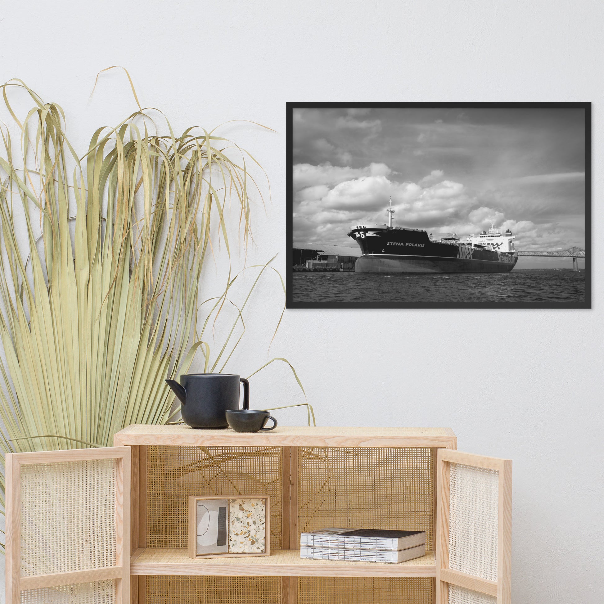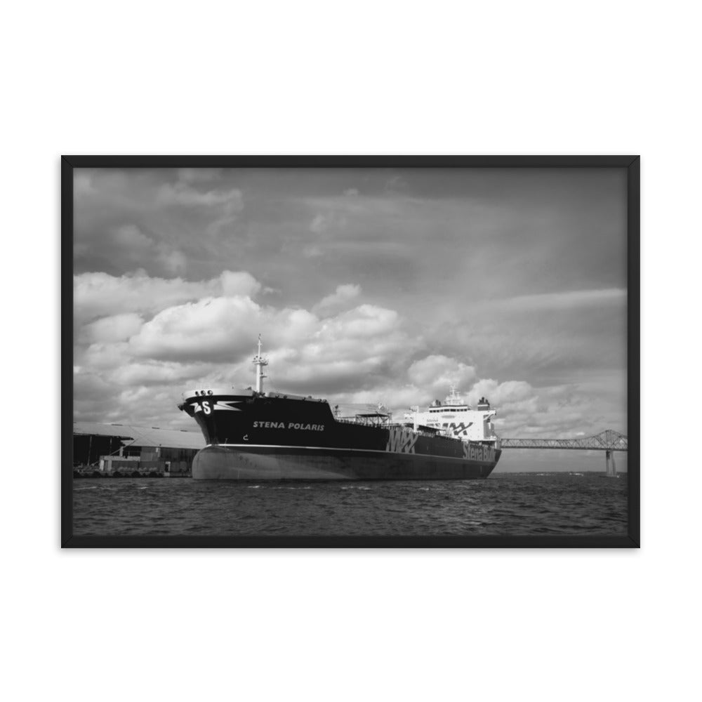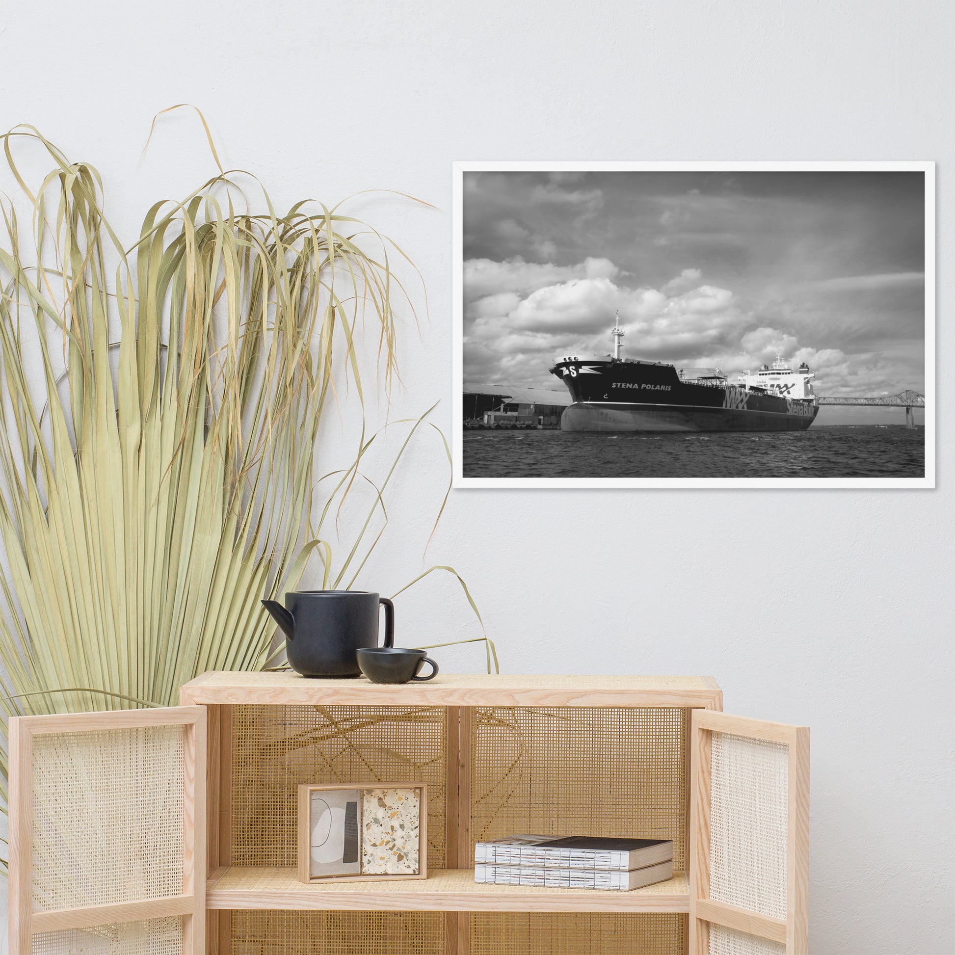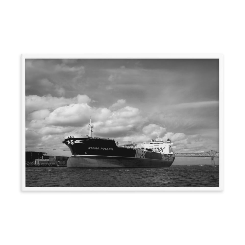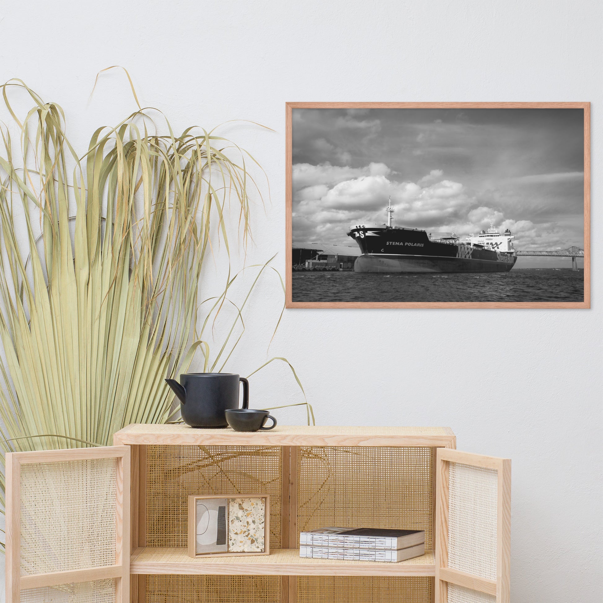 About these coastal framed pictures: Embark on a visual journey with "Ship on the St. Johns River," a captivating black and white print that captures the essence of maritime charm and industrial grandeur. This striking photograph showcases the majestic silhouette of the Stena Polaris, a massive tanker vessel, as it gracefully navigates the tranquil waters of the St. Johns River. The dramatic contrast between the ship's dark hull and the ethereal clouds above creates a sense of awe and wonder, drawing the viewer into a world of maritime adventure and industrial prowess.