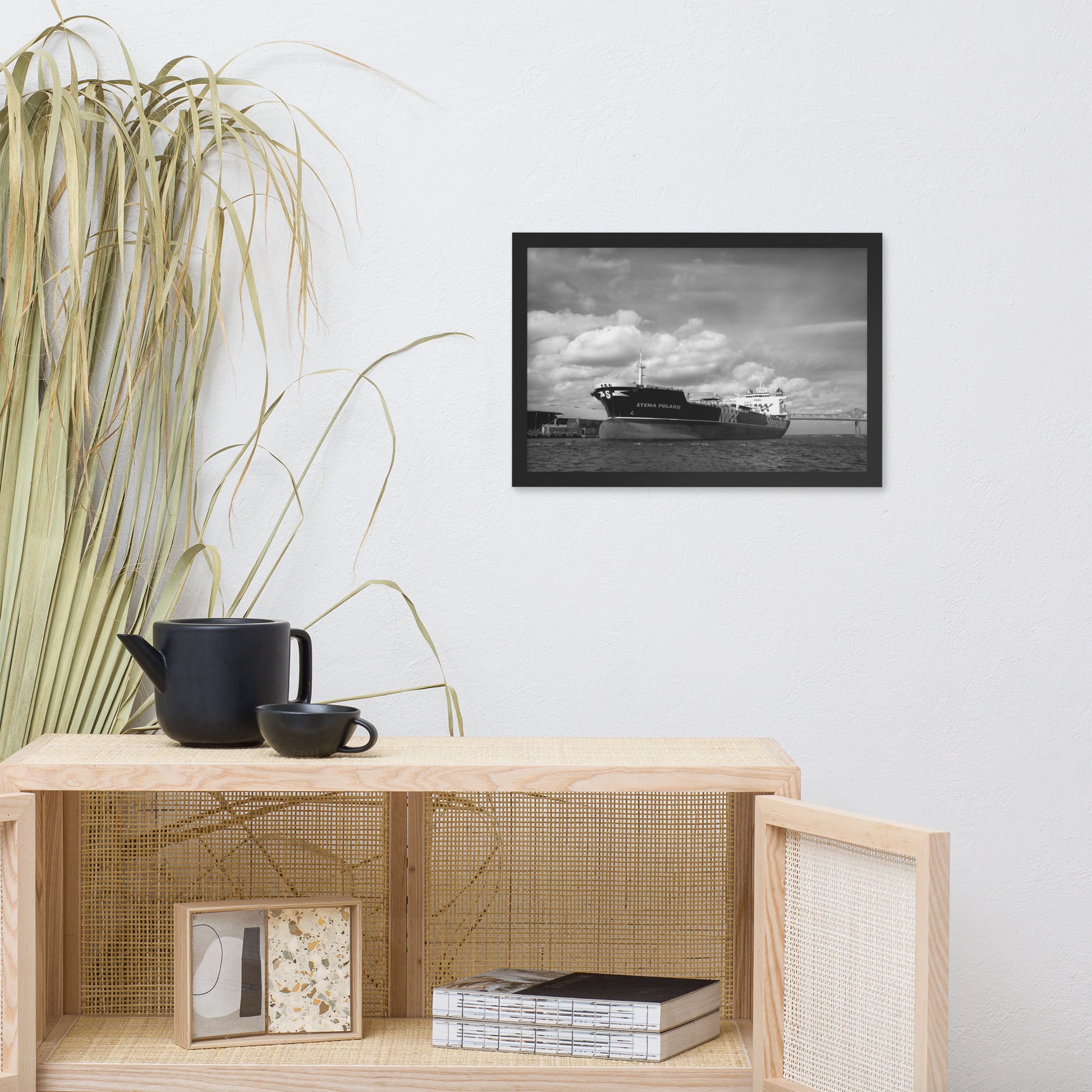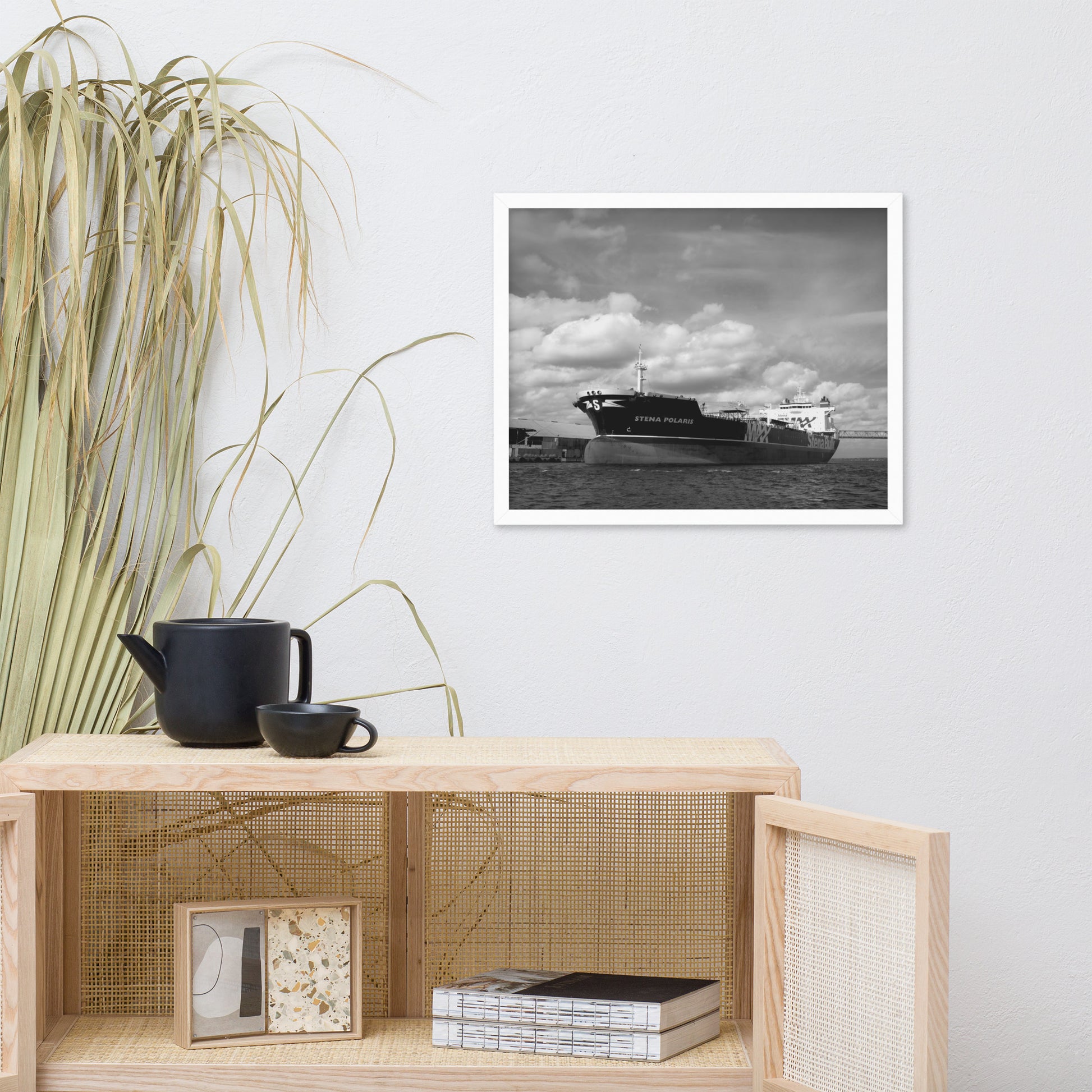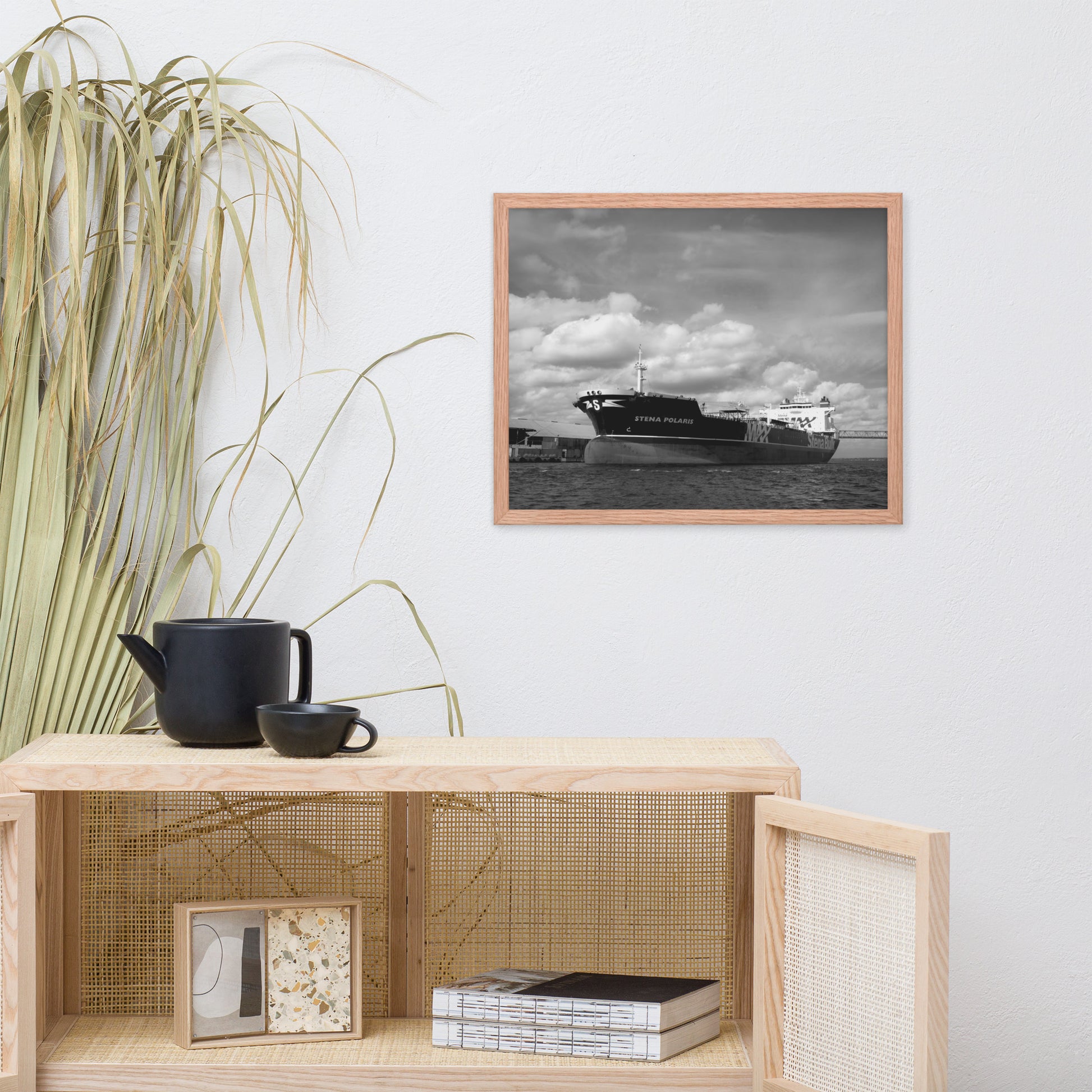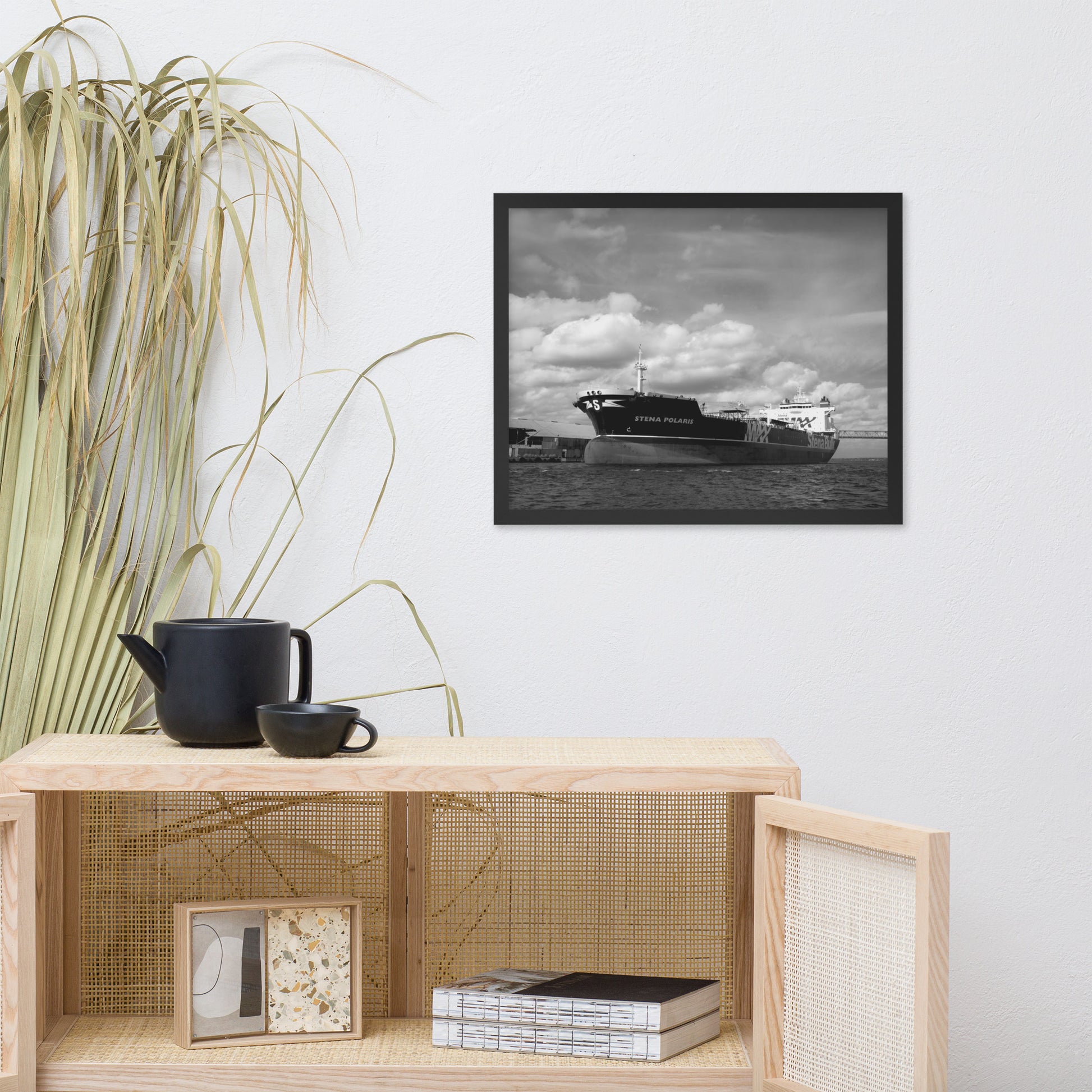 About these coastal framed pictures: Embark on a visual journey with "Ship on the St. Johns River," a captivating black and white print that captures the essence of maritime charm and industrial grandeur. This striking photograph showcases the majestic silhouette of the Stena Polaris, a massive tanker vessel, as it gracefully navigates the tranquil waters of the St. Johns River. The dramatic contrast between the ship's dark hull and the ethereal clouds above creates a sense of awe and wonder, drawing the viewer into a world of maritime adventure and industrial prowess.