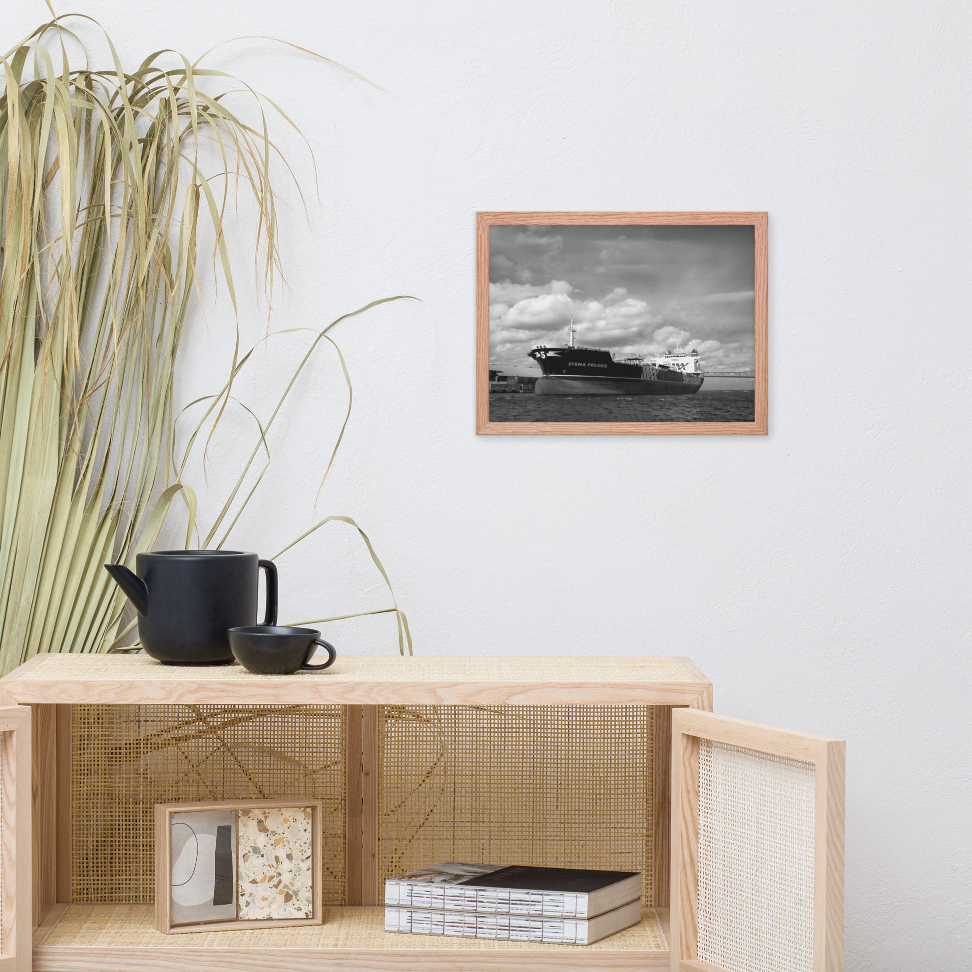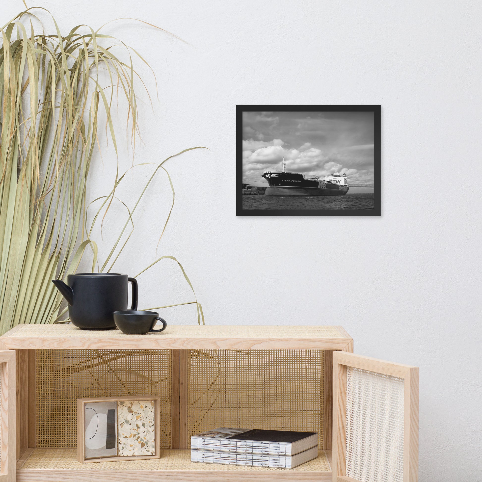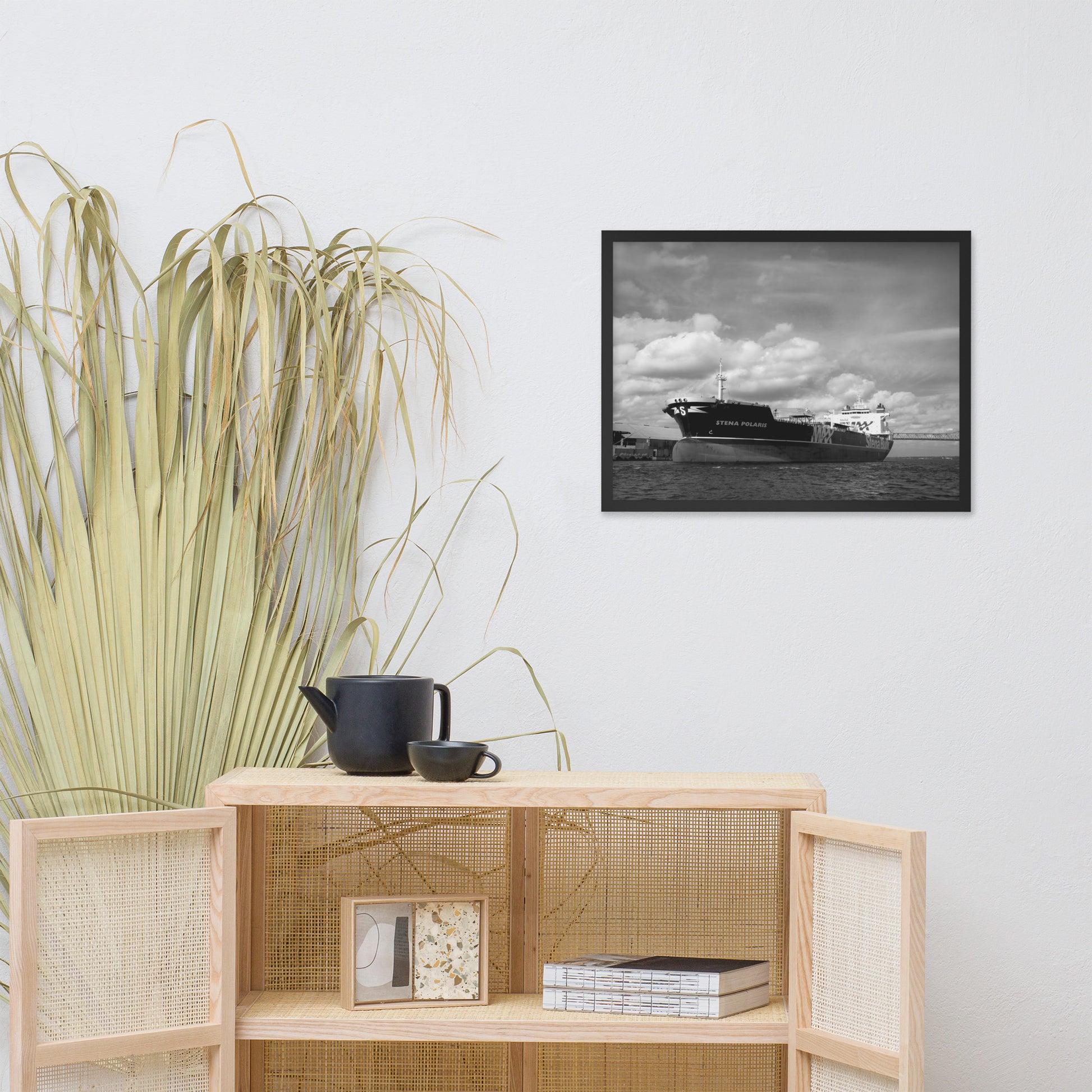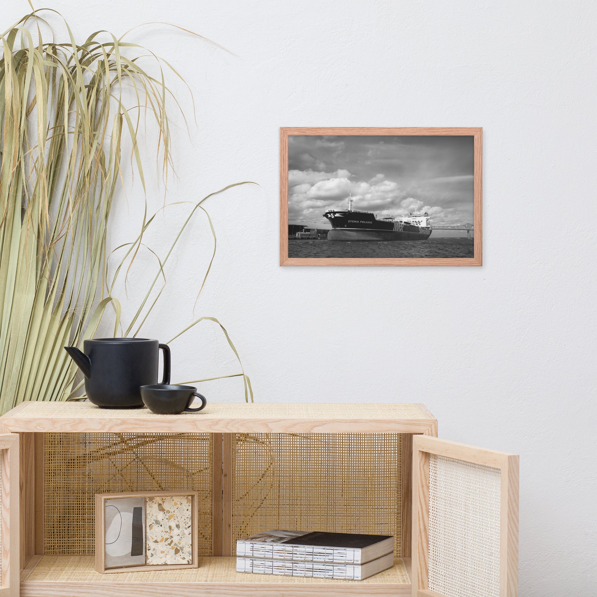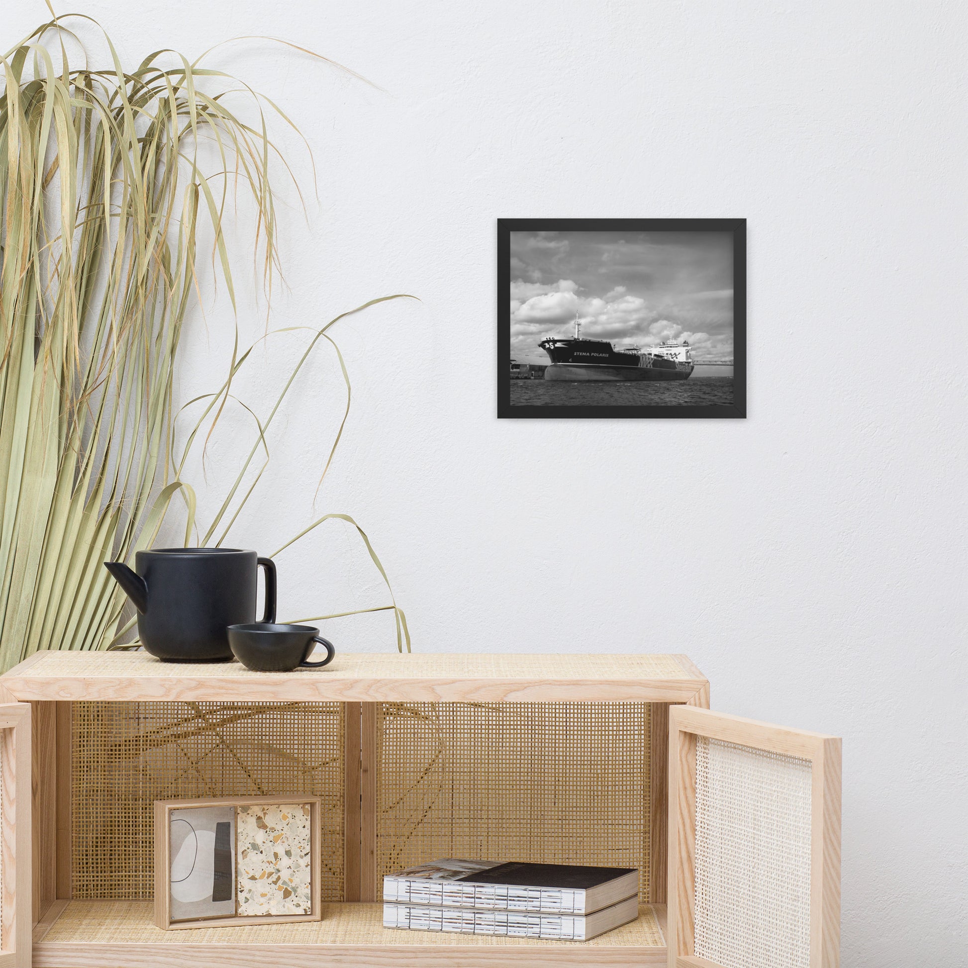 About these coastal framed pictures: Embark on a visual journey with "Ship on the St. Johns River," a captivating black and white print that captures the essence of maritime charm and industrial grandeur. This striking photograph showcases the majestic silhouette of the Stena Polaris, a massive tanker vessel, as it gracefully navigates the tranquil waters of the St. Johns River. The dramatic contrast between the ship's dark hull and the ethereal clouds above creates a sense of awe and wonder, drawing the viewer into a world of maritime adventure and industrial prowess.
