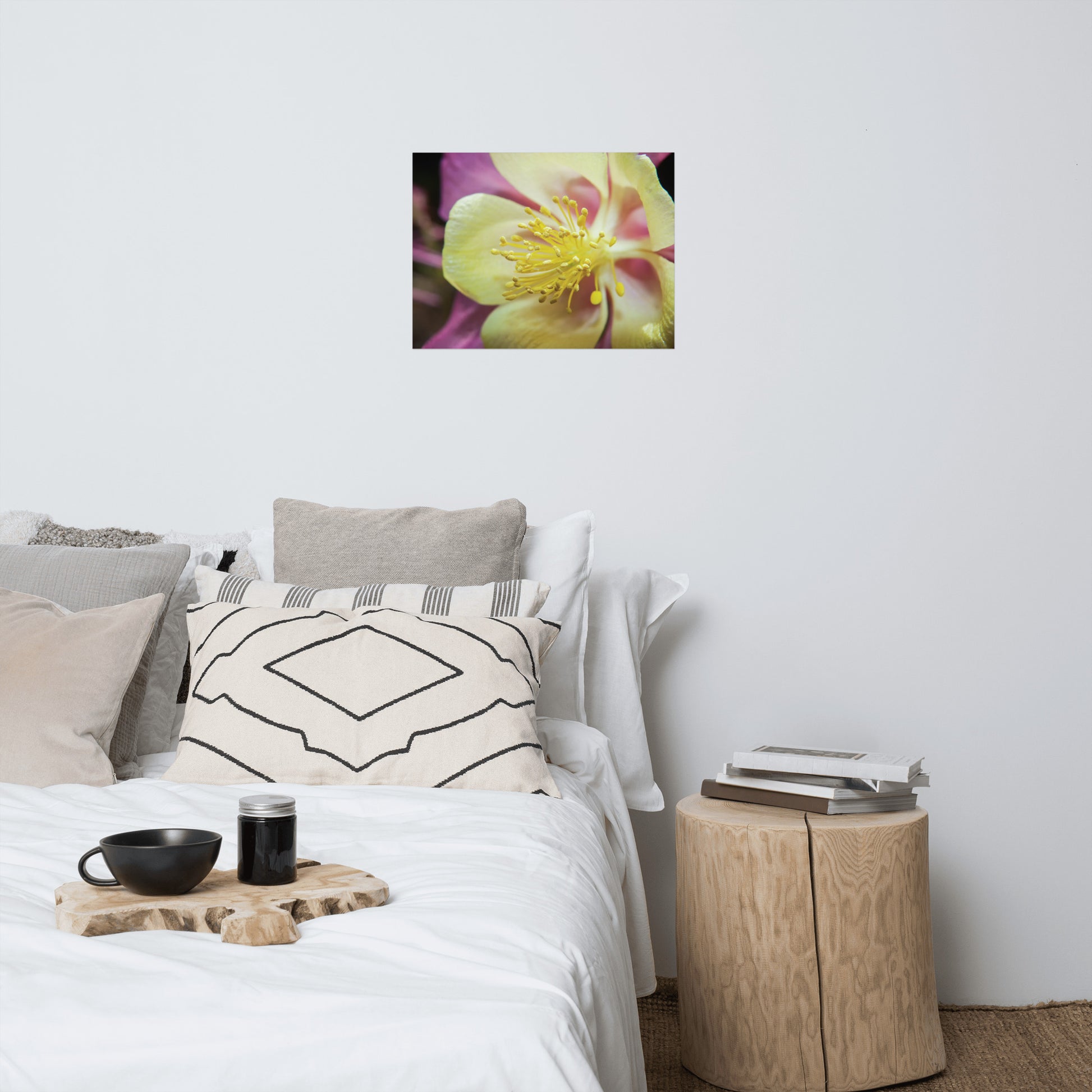 About this neutral floral wall art: "Delicate Columbine" is an exquisite nature photograph, transformed into a high-quality photo paper print. Perfect for those seeking unframed wall art with a touch of elegance, this close-up captures the intricate details of a single Columbine flower in full bloom. Soft lighting illuminates the delicate purplish pink and white petals, creating a sense of ethereal beauty that will bring a calming and natural ambiance to any space.