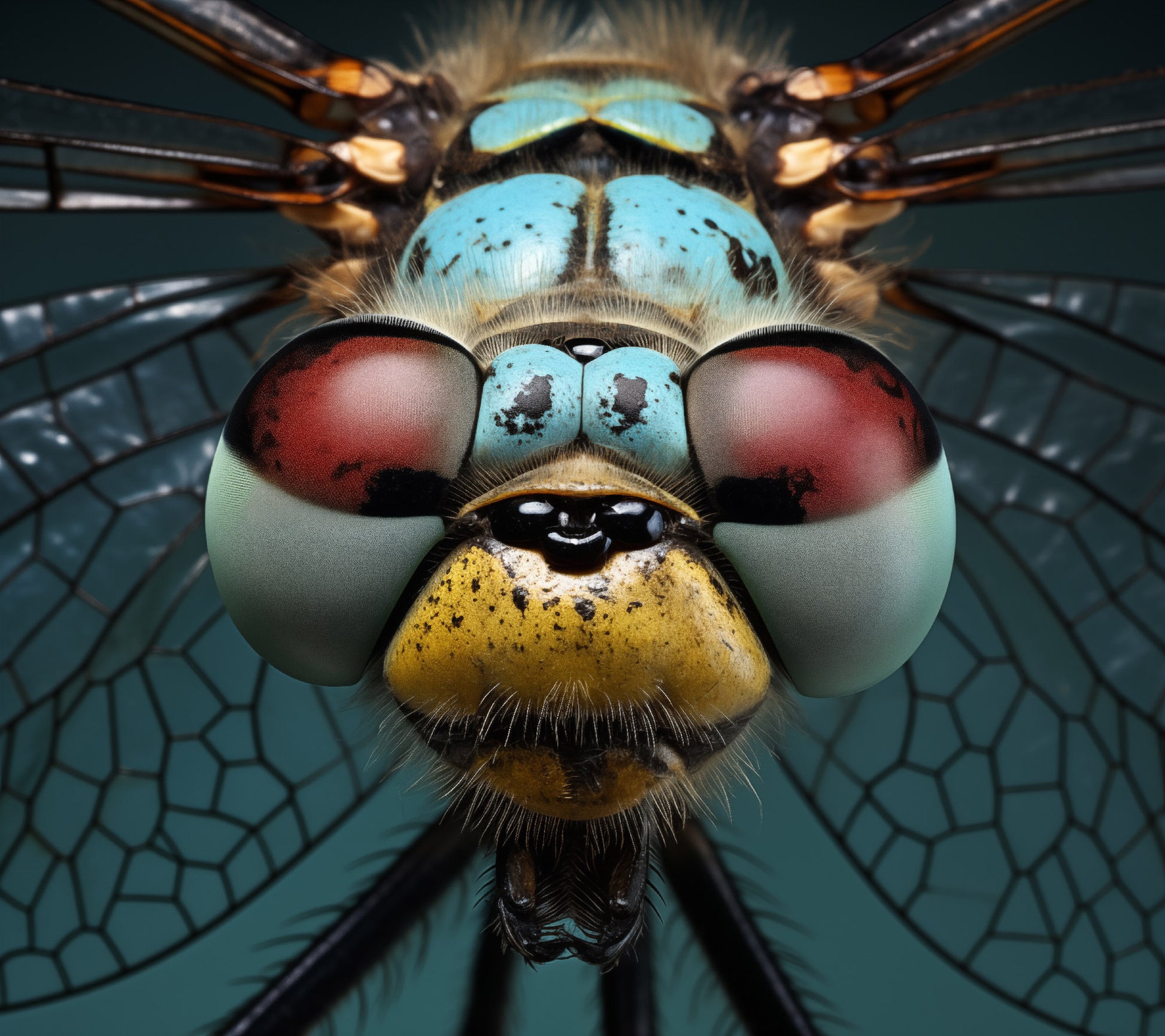 About this digital dragonfly painting: Experience the mesmerizing beauty of the natural world up close with "Dragonfly's Gaze". This digitally created artwork captures the intricate details of a dragonfly's face in stunning photorealistic detail. The vibrant colors and textures of its multifaceted eyes, delicate antennae, and textured skin invite you to marvel at the complexity and wonder of this fascinating creature.