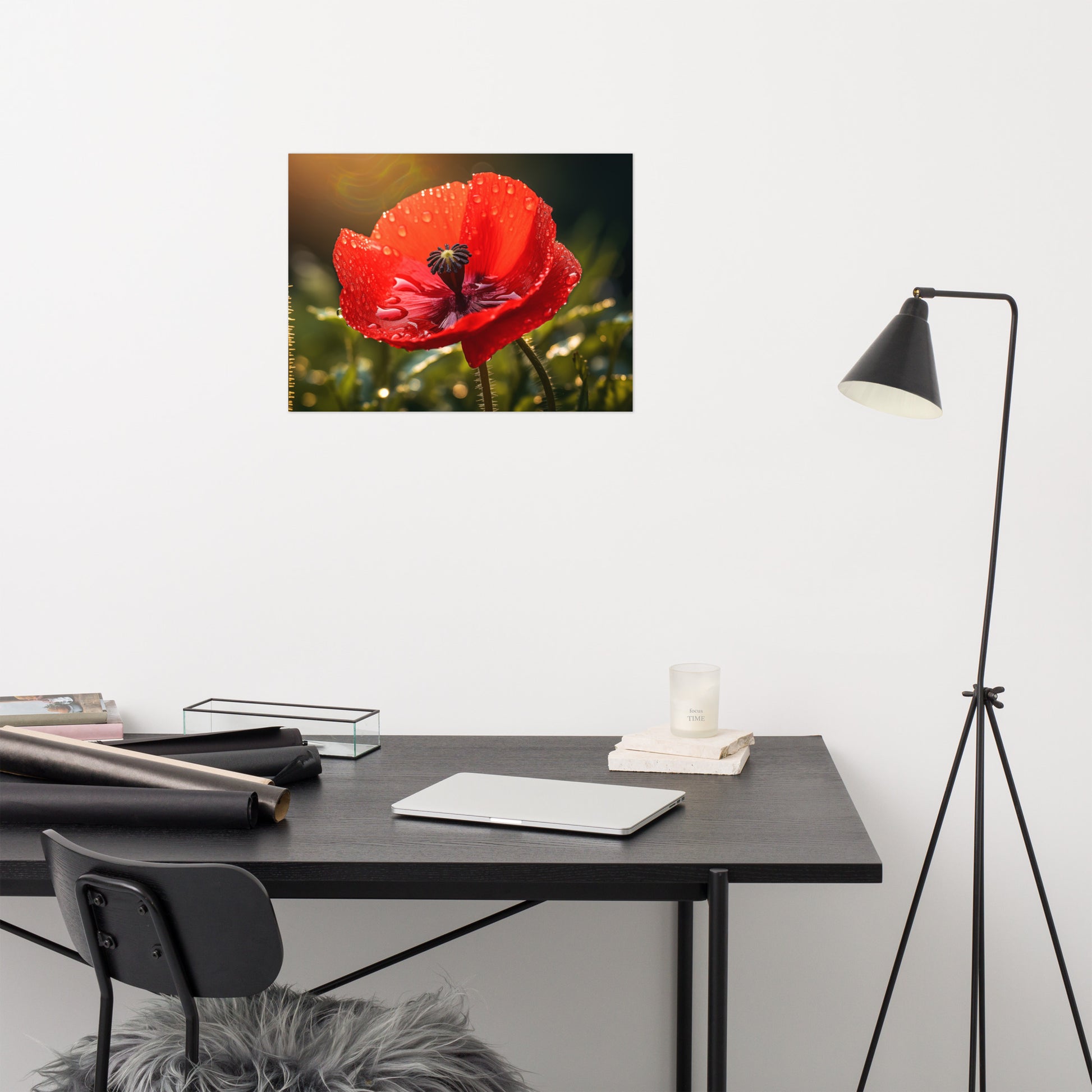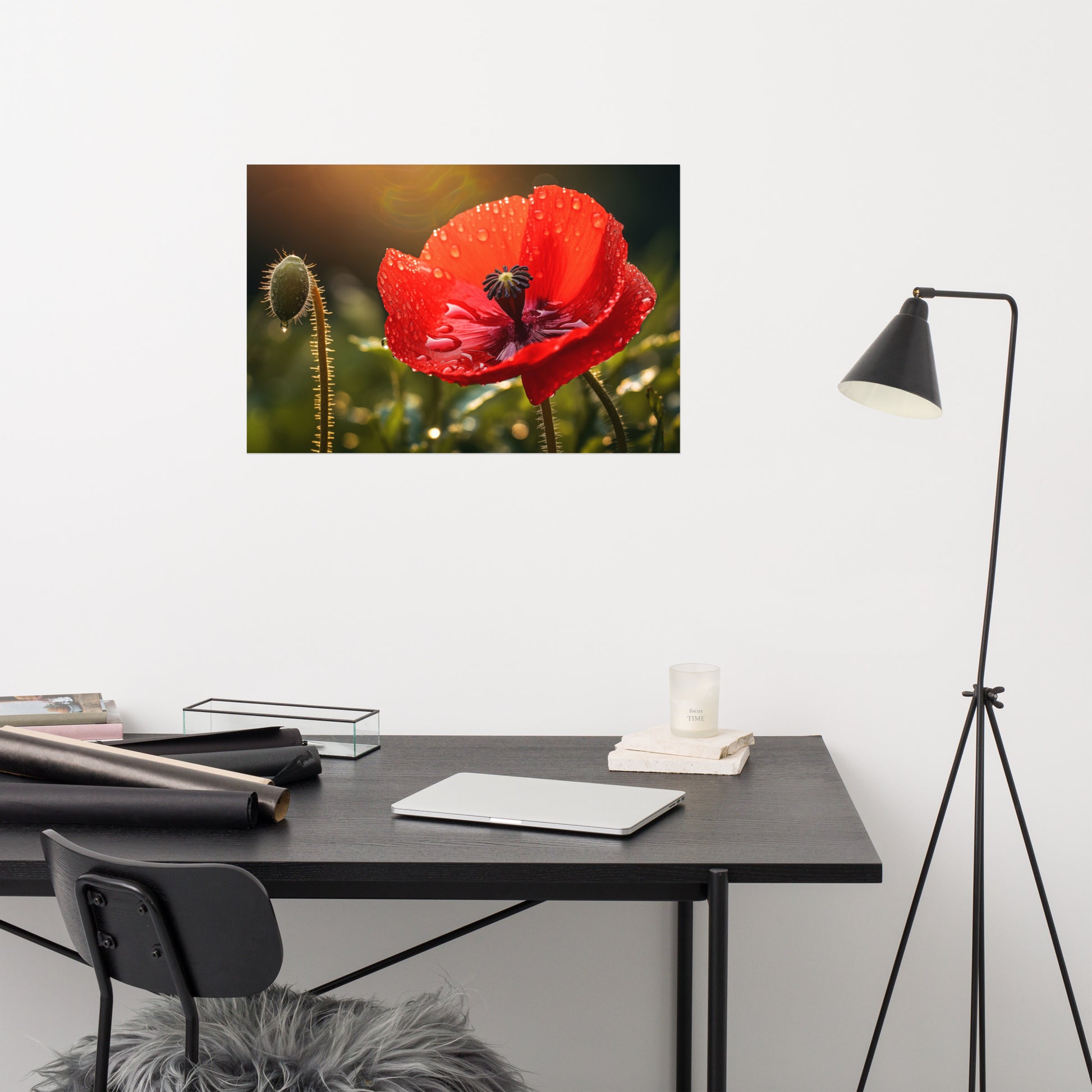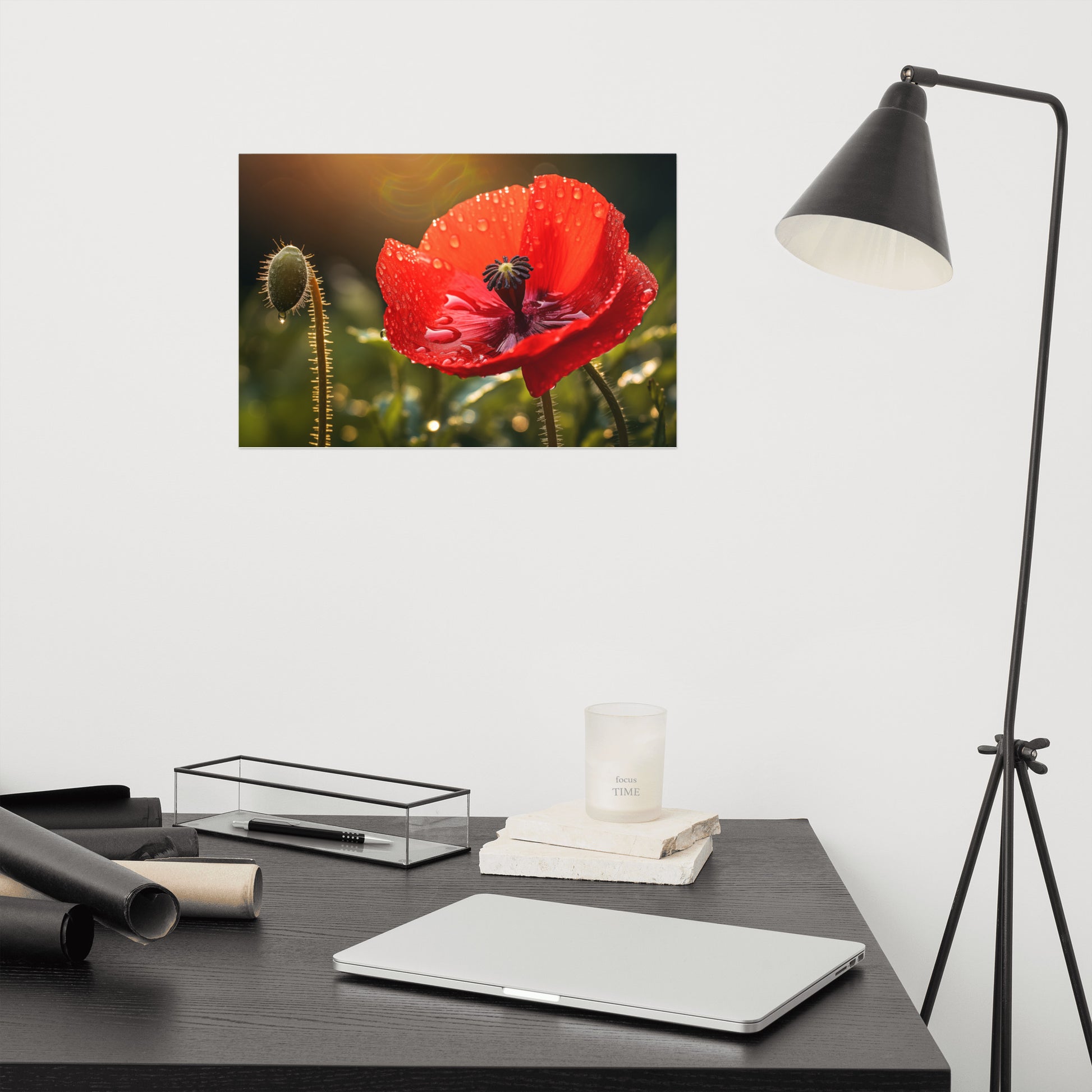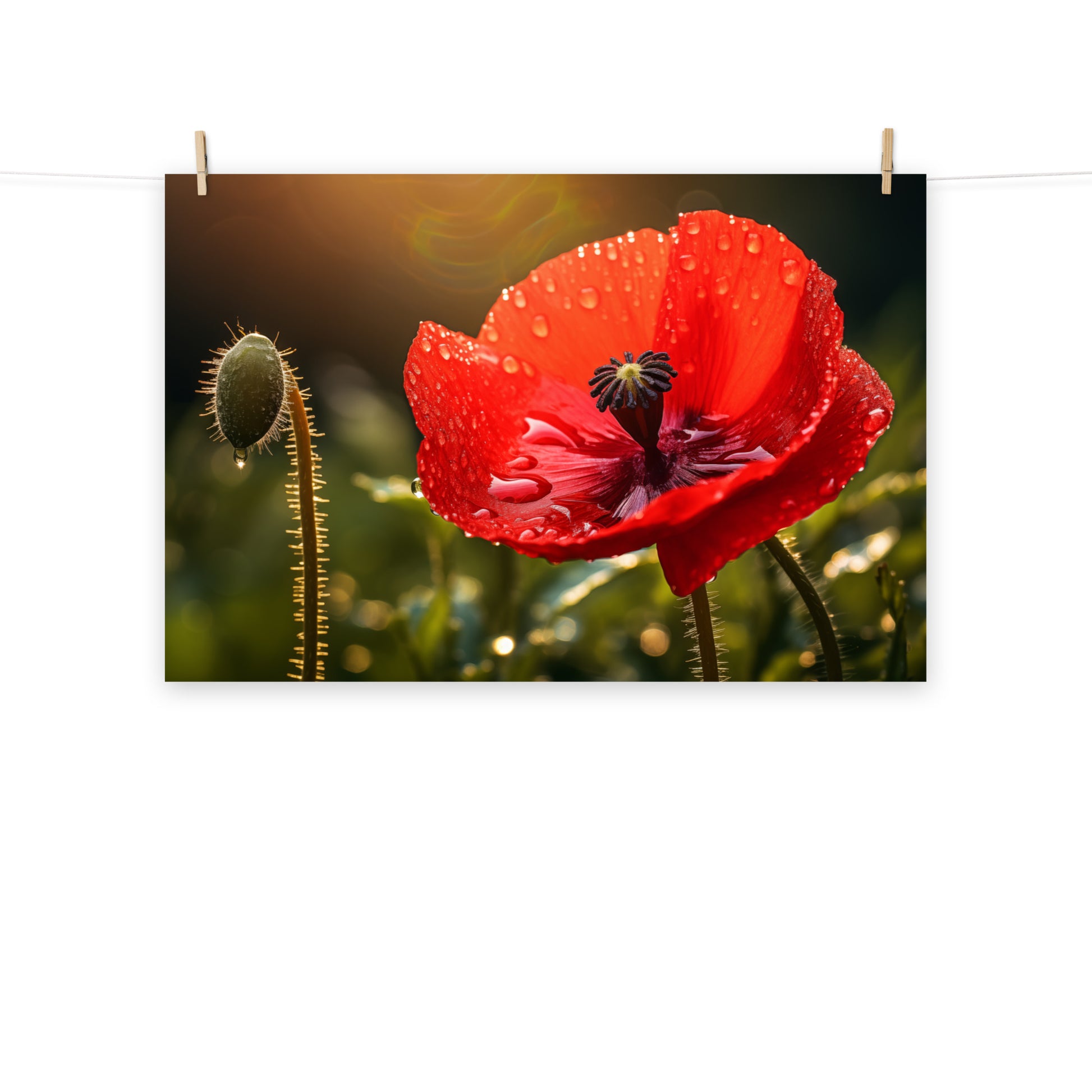 About these flower poster prints: Experience the delicate beauty and poignant allure of nature captured in "Crimson Tears." This stunning photorealistic artwork showcases a single red poppy in full bloom, its velvety petals adorned with glistening dewdrops, reminiscent of tears shed in the quiet solitude of the morning. The flower stands tall against a backdrop of soft, diffused light, creating an atmosphere of both intimacy and grandeur.