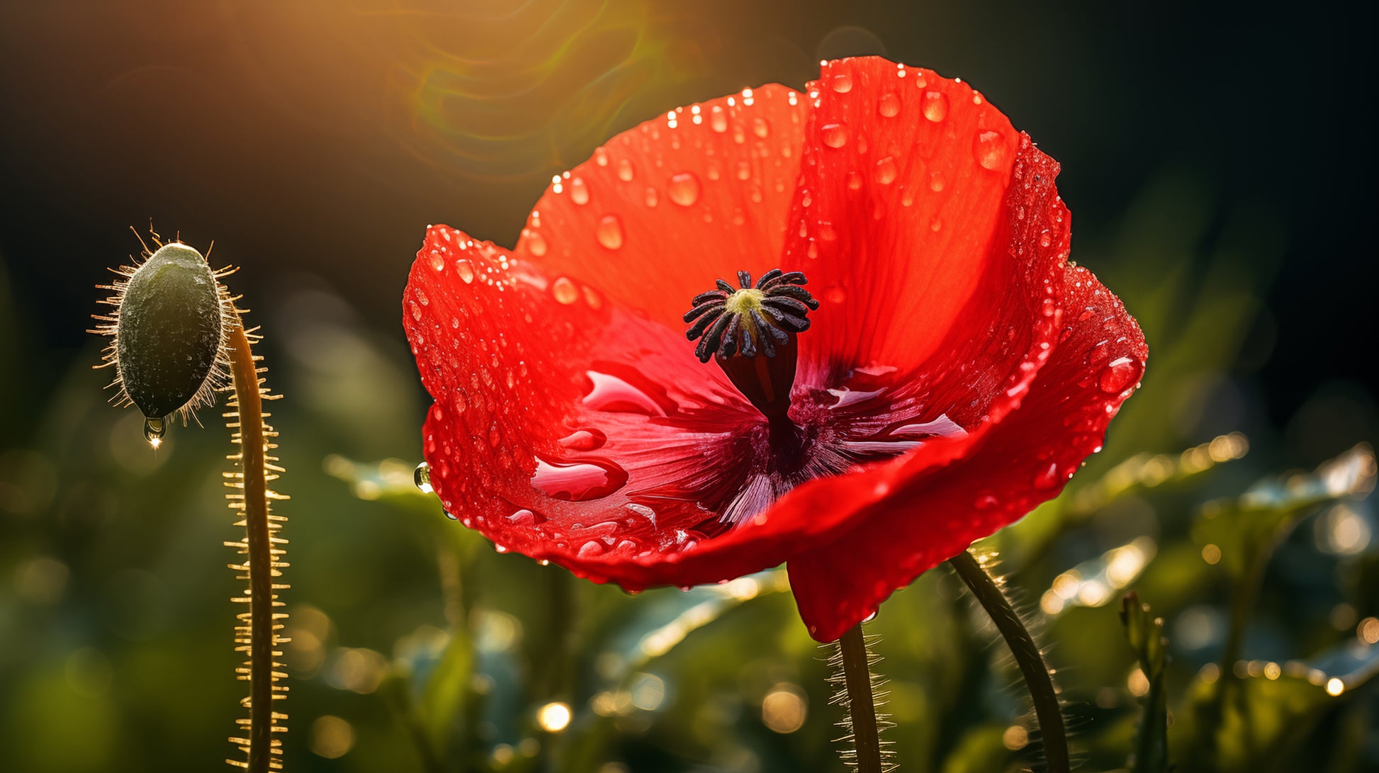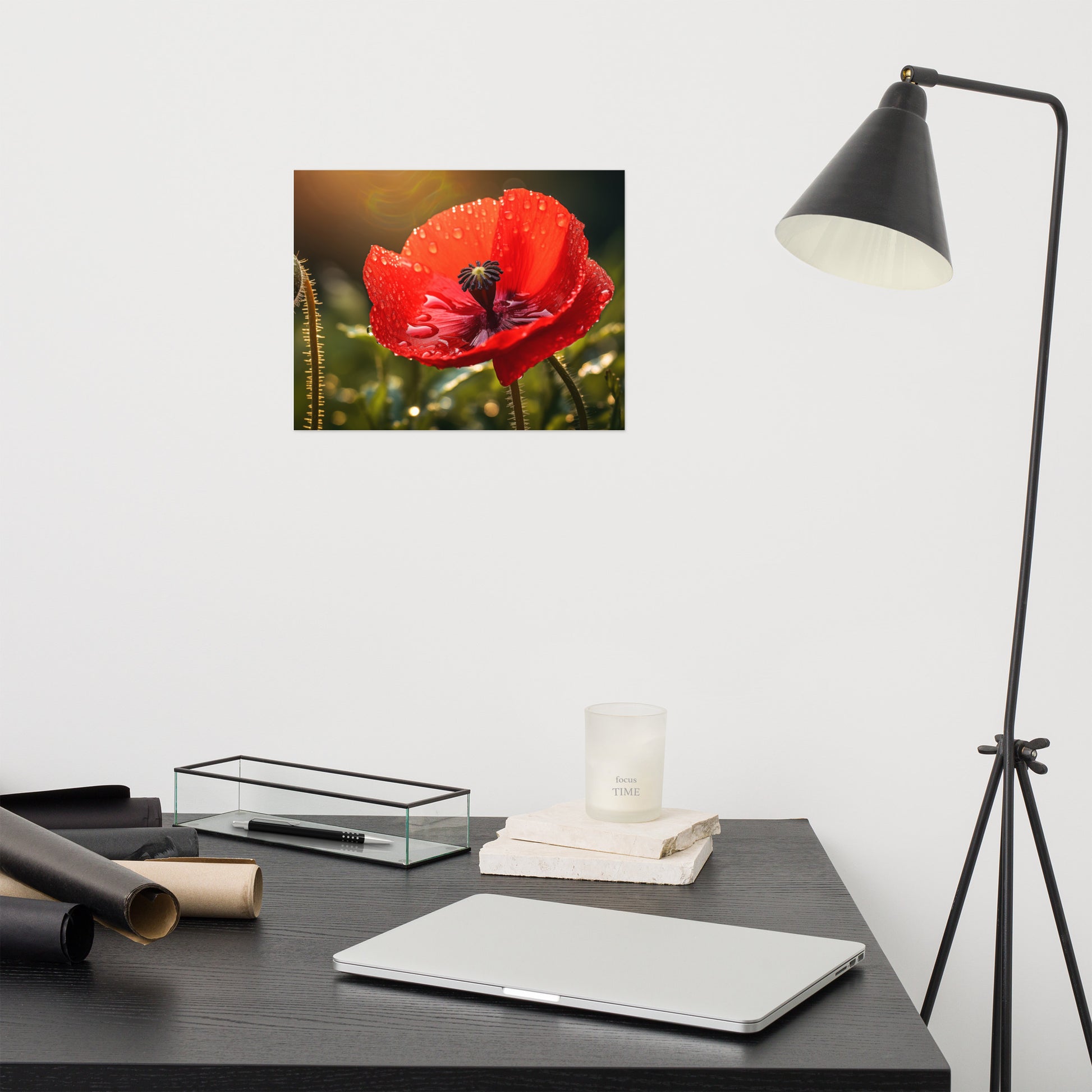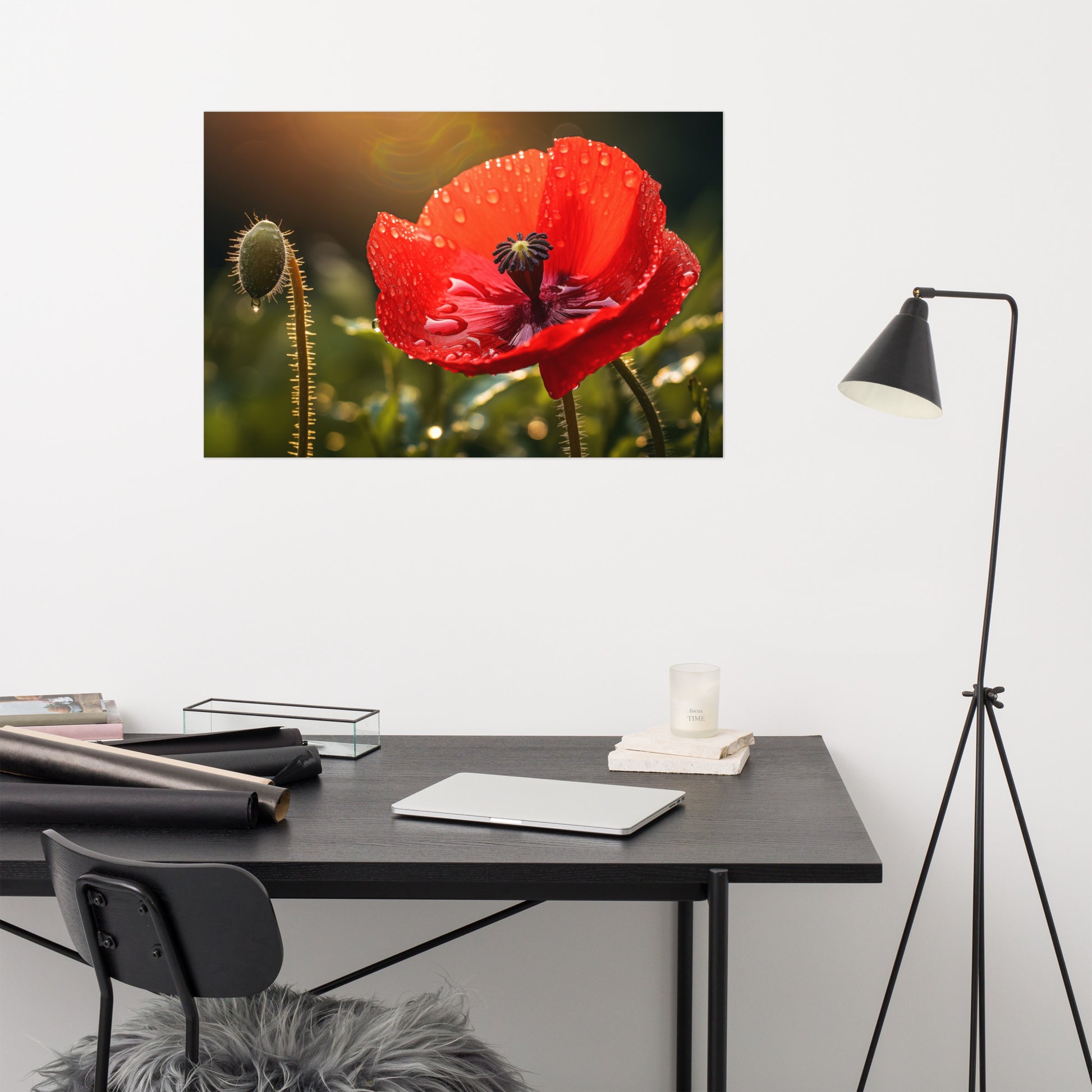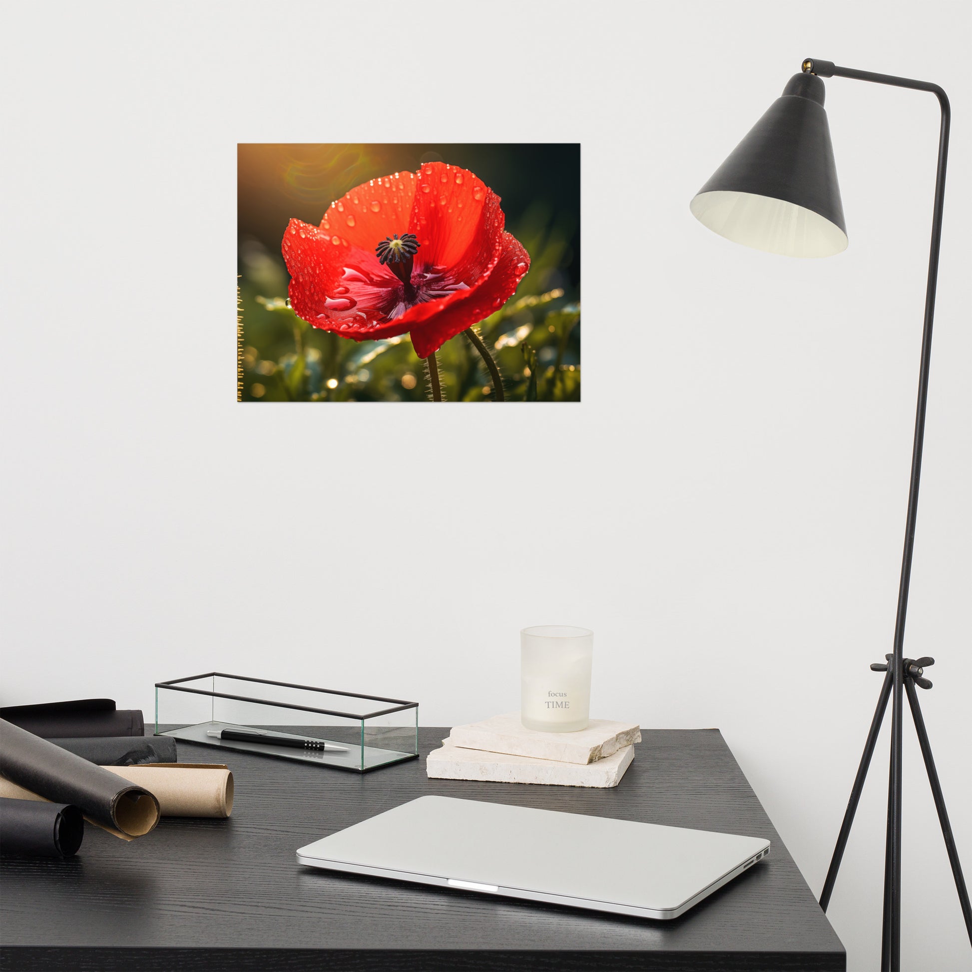 About these flower poster prints: Experience the delicate beauty and poignant allure of nature captured in "Crimson Tears." This stunning photorealistic artwork showcases a single red poppy in full bloom, its velvety petals adorned with glistening dewdrops, reminiscent of tears shed in the quiet solitude of the morning. The flower stands tall against a backdrop of soft, diffused light, creating an atmosphere of both intimacy and grandeur.
