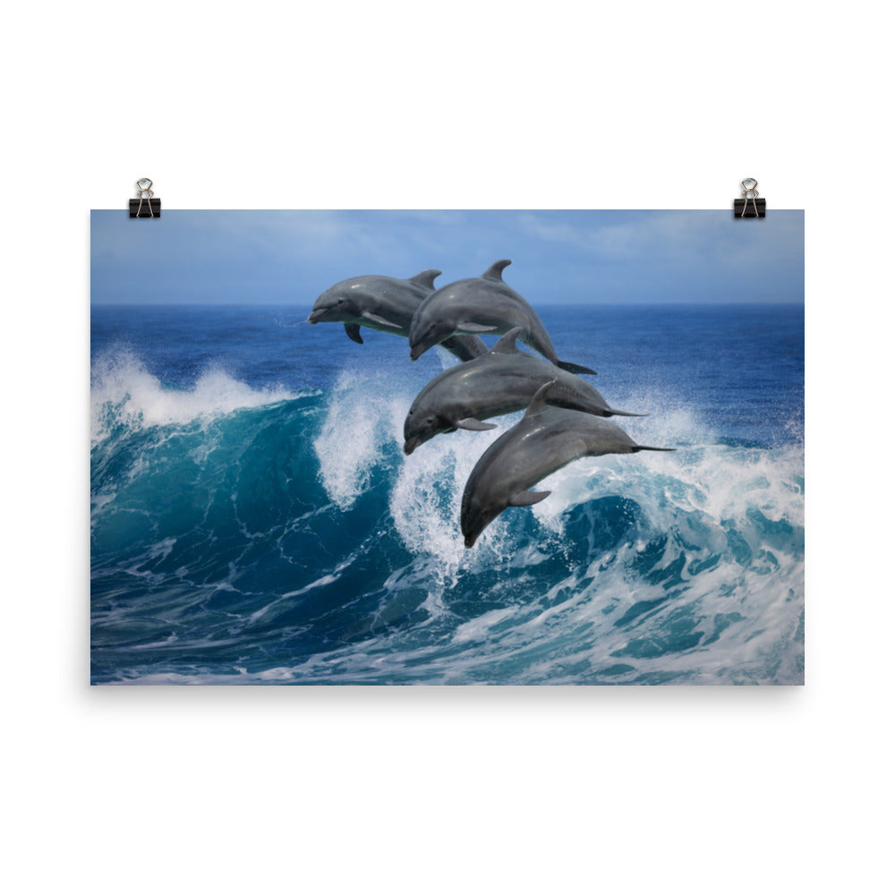 Coastal Prints Wall Art: Four Bottle Noise Dolphins Jumping Waves In Tropical Blue Ocean - Animal / Wildlife / Nature Photograph - Loose / Frameable / Unframed / Frameless Artwork