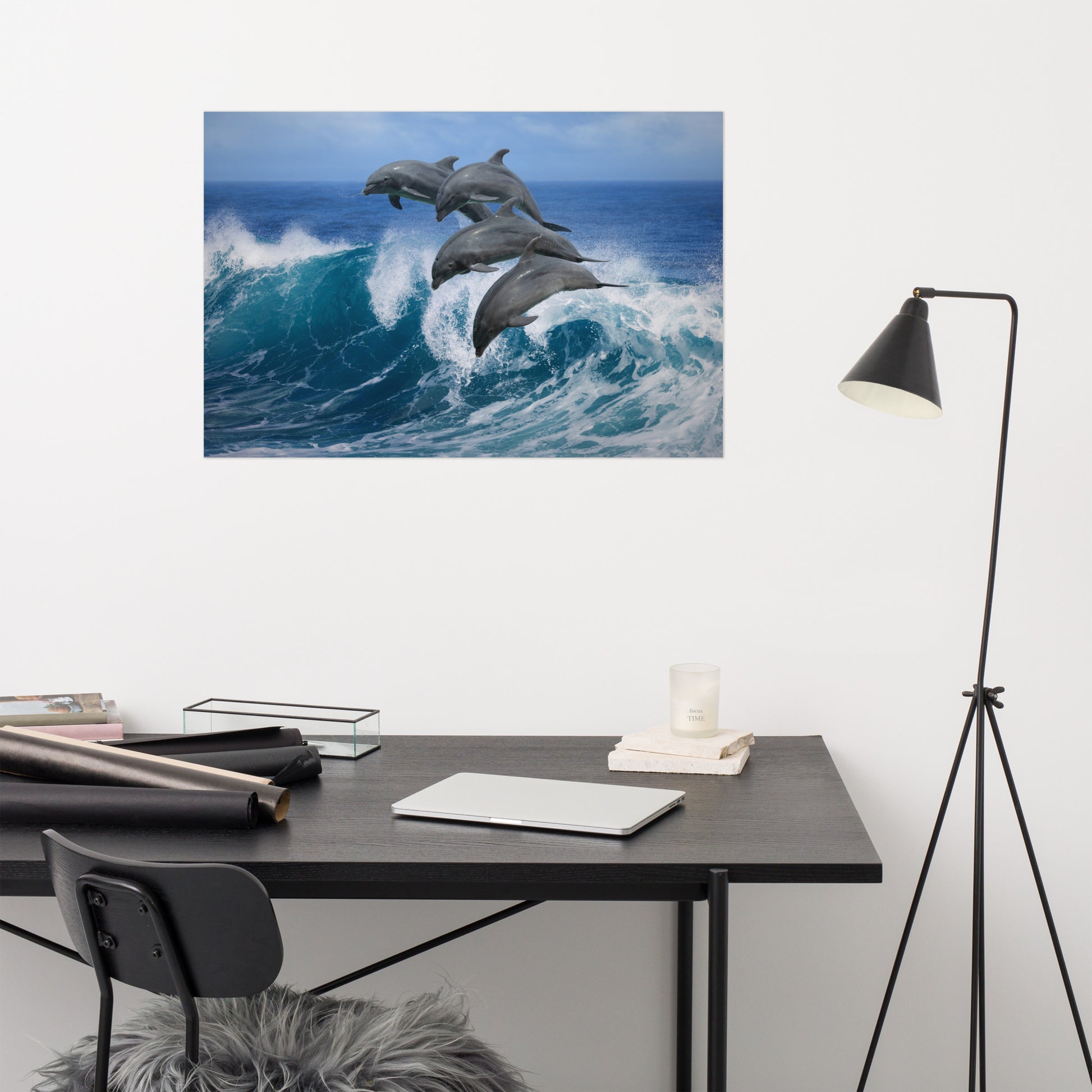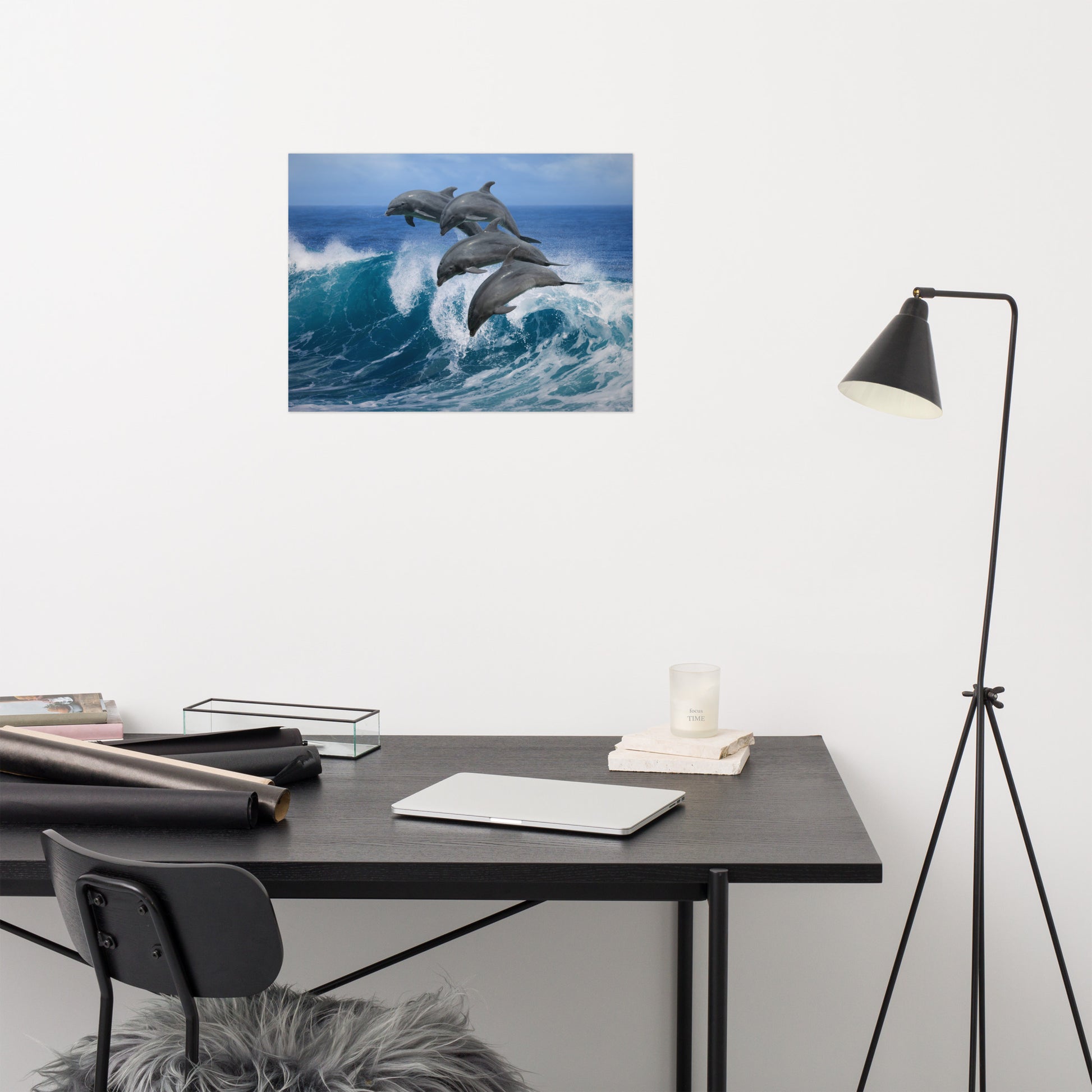 About this ocean art: Immerse yourself in the untamed beauty of the ocean with this breathtaking wildlife photograph. Witness the playful energy of four Bottlenose Dolphins as they gracefully leap over a crashing wave, their sleek bodies glistening in the Hawaiian sunlight. This unframed print captures a fleeting moment of pure joy, bringing the vibrant spirit of the tropics into your home. This photograph is also available in black and white.