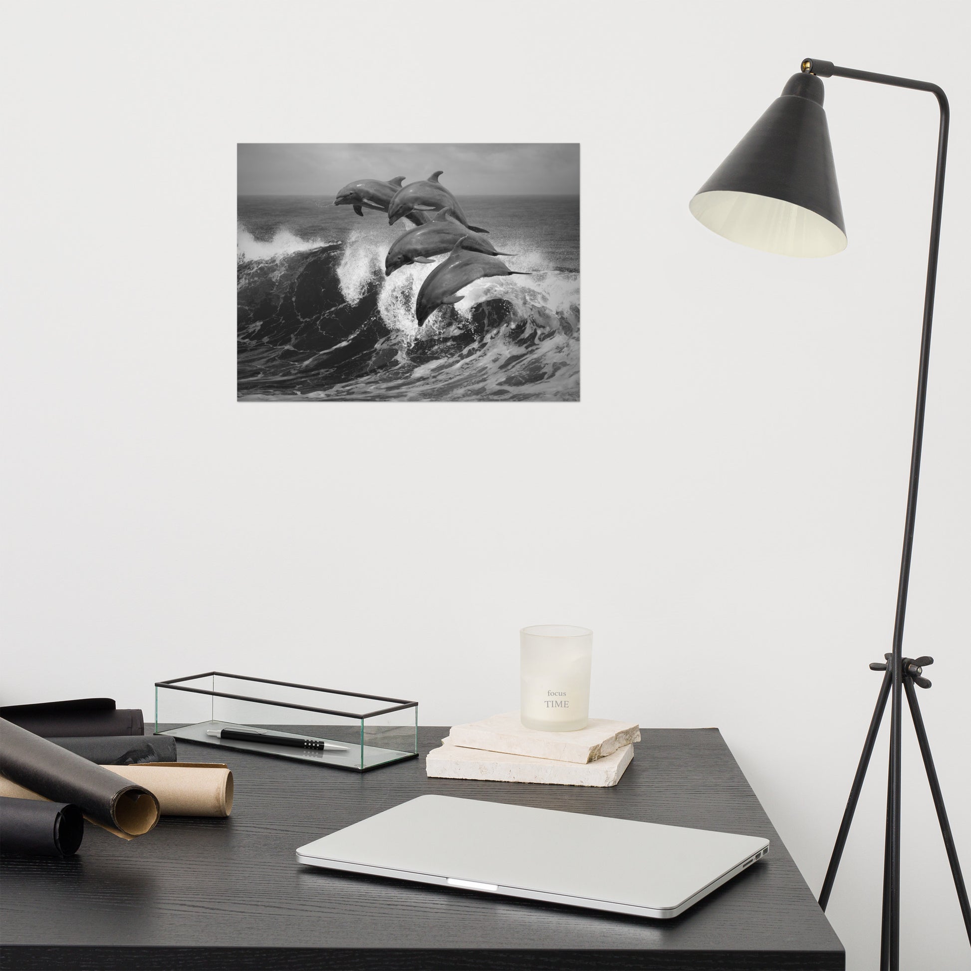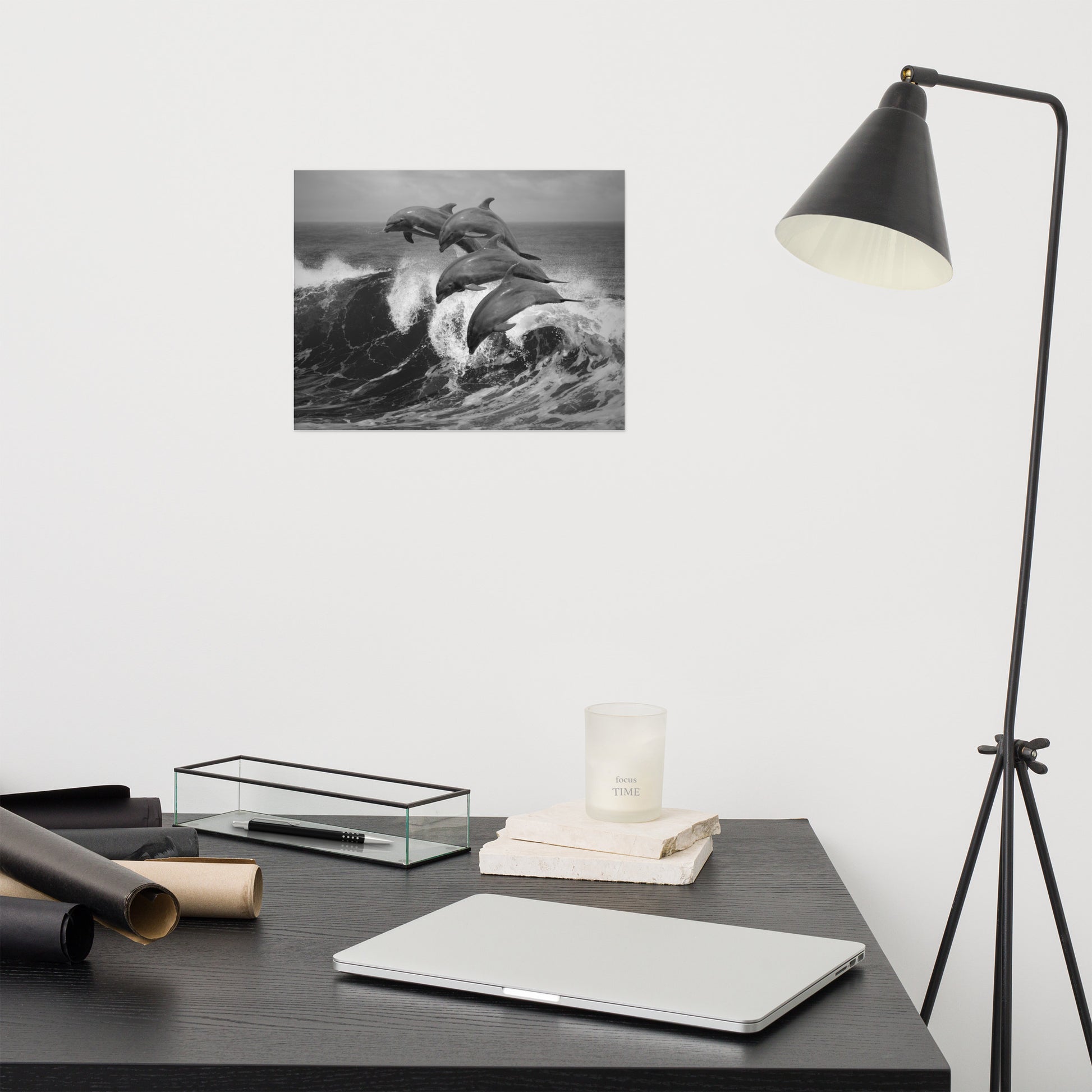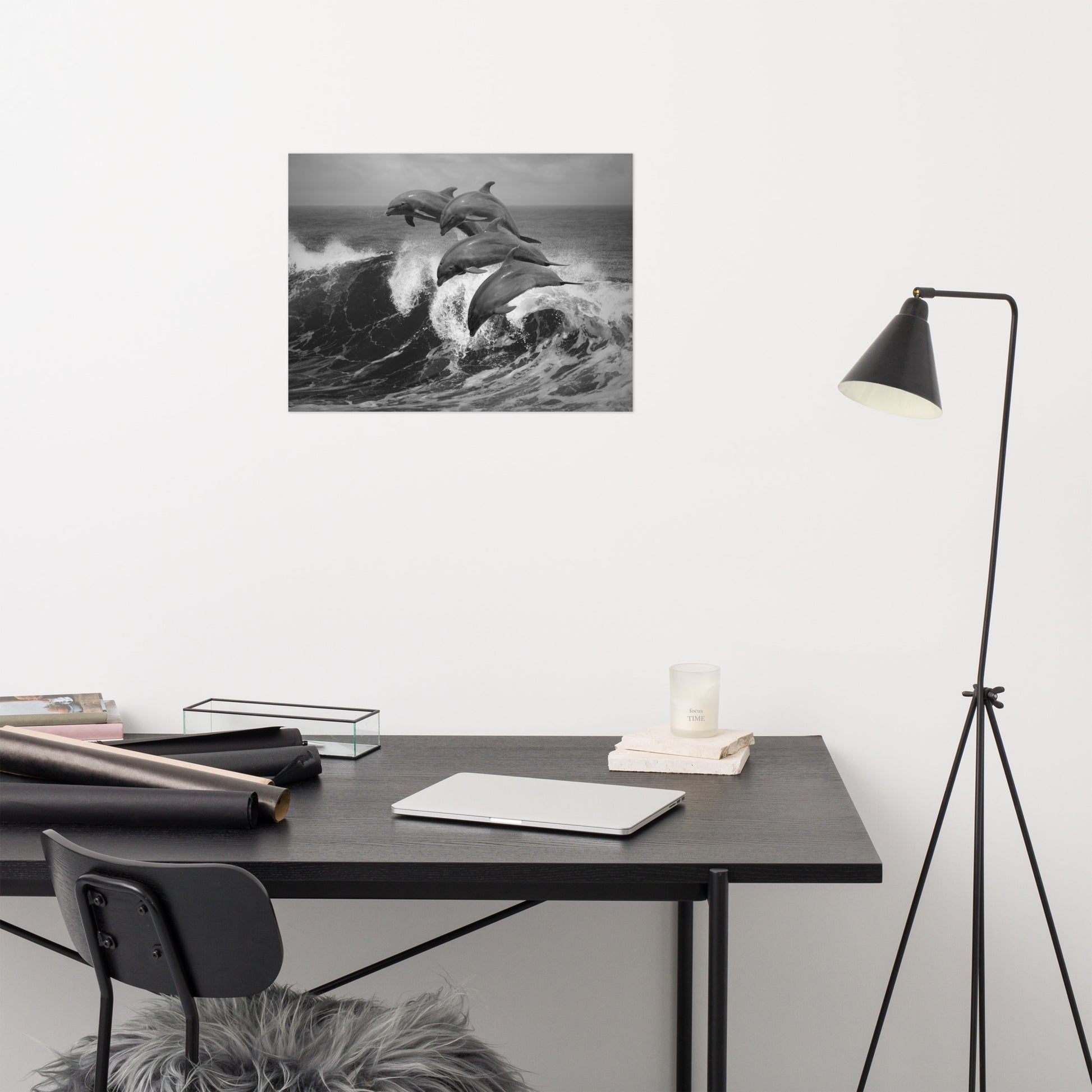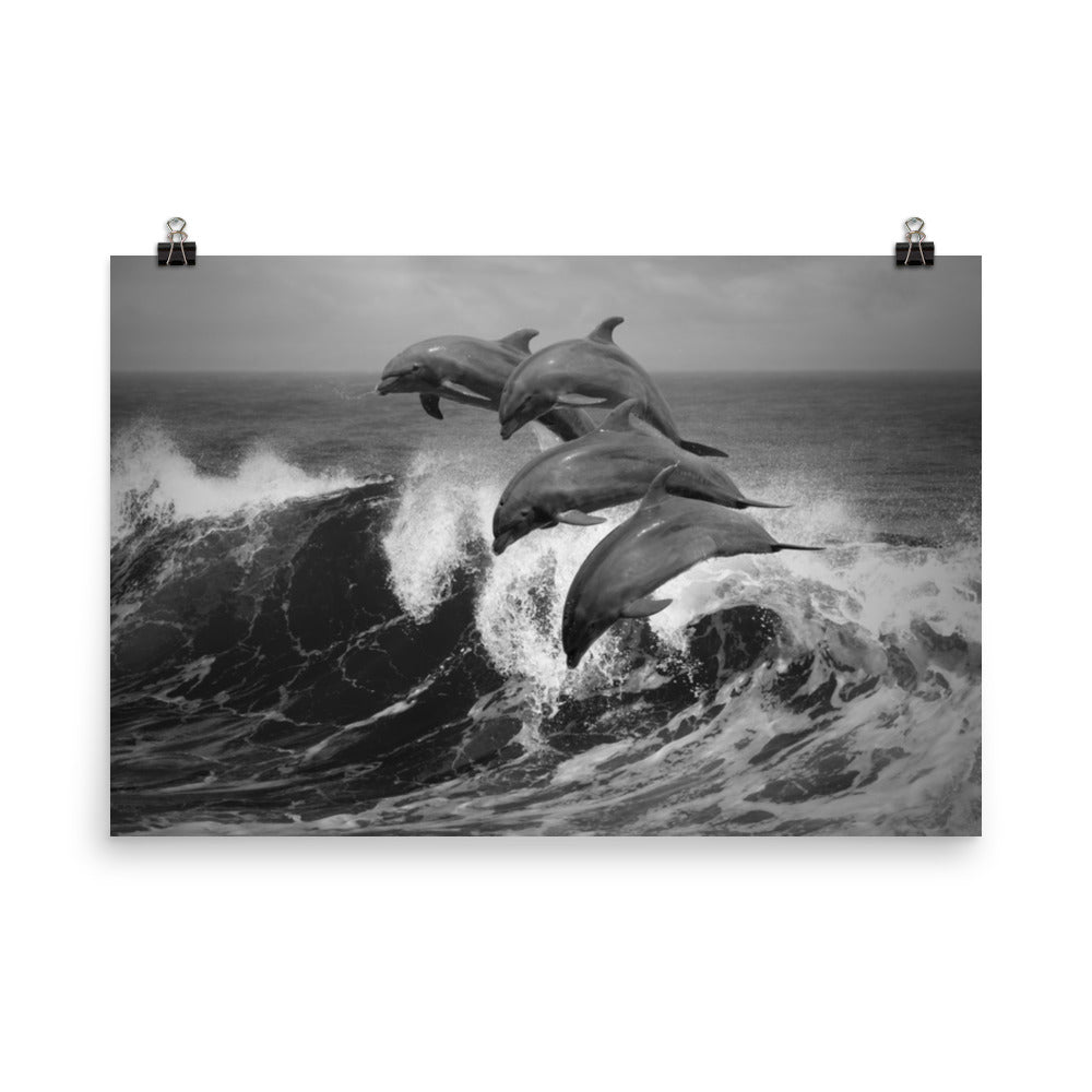 Four Bottle Noise Dolphins Jumping Waves In Tropical Ocean Black and White Animal Wildlife Photograph Loose Wall Art Print